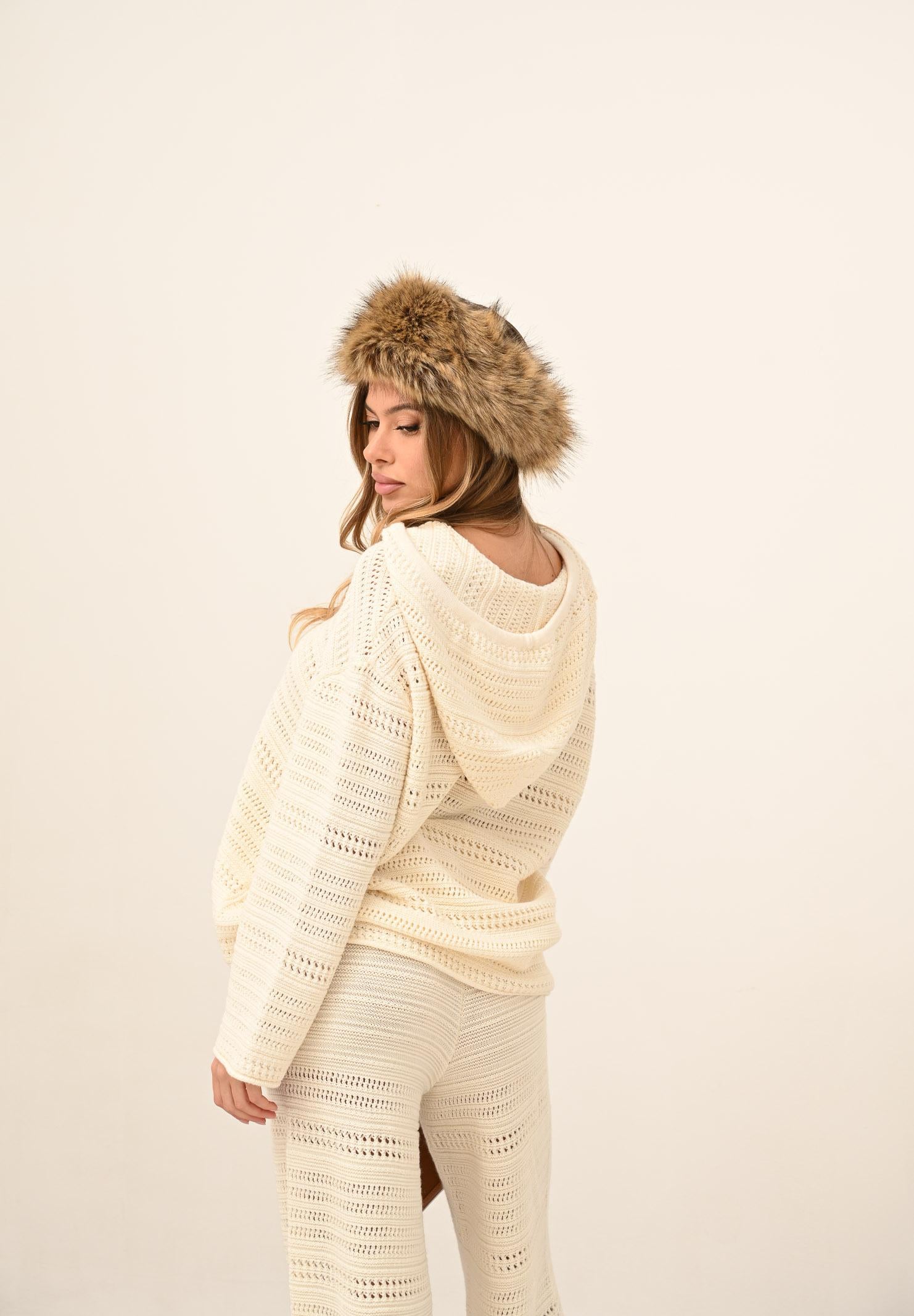 AKEP Maglia con cappuccio panna da donna dalla lavorazione traforata
