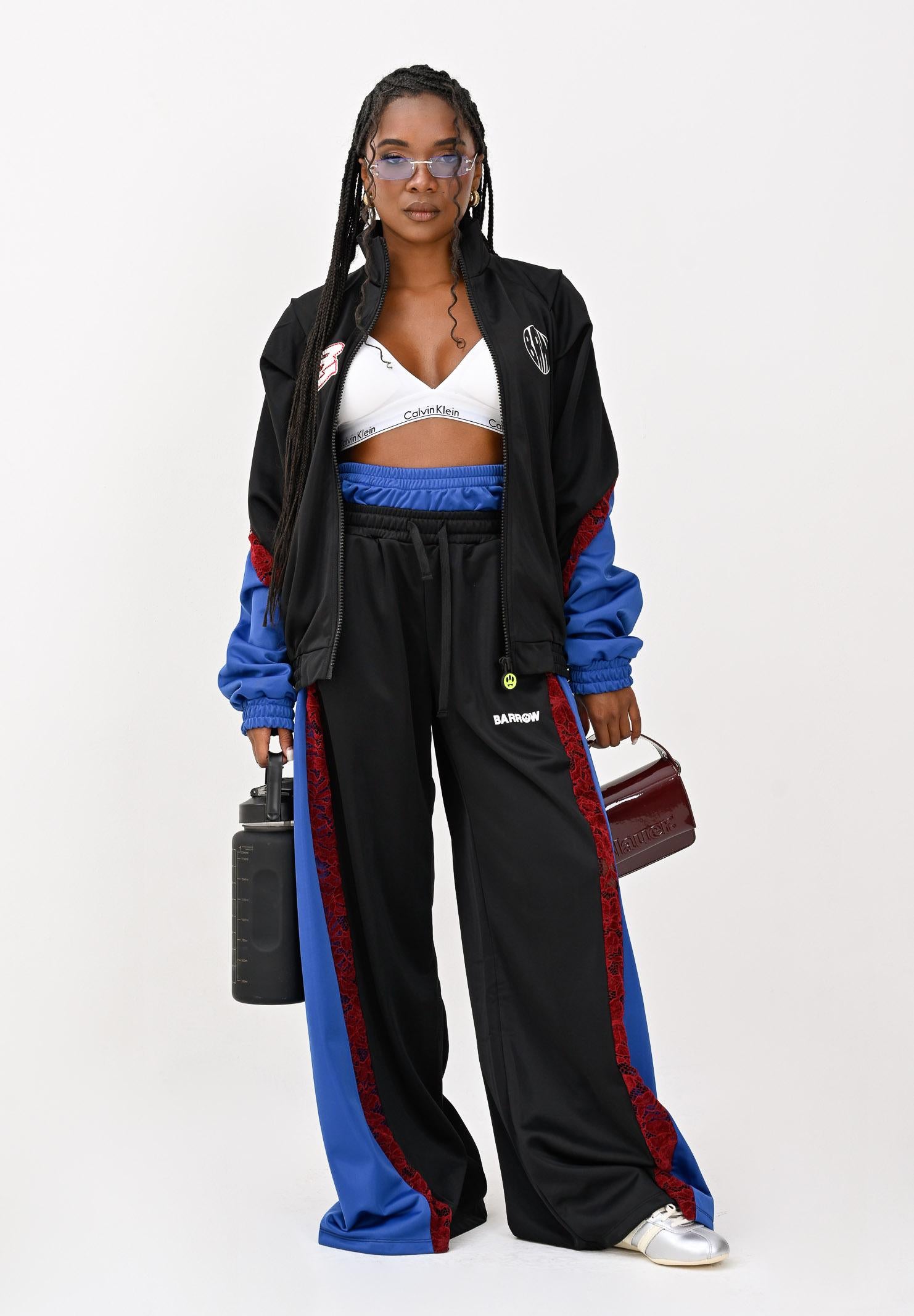 BARROW Pantalone sportivo nero da donna con bande laterali blu elettrico e inserti in pizzo rosso