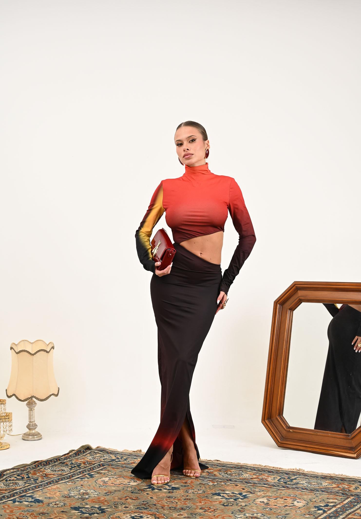 PATRIZIA PEPE Abito lungo multicolore da donna. Capo iconico del guardaroba party di stagione, l'abito lungo in jersey tecnico elasticizzato scolpisce una silhouette sensuale e audace, valorizzata dal cut-out sul fianco sinistro. Il collo alto è impreziosito da un dettaglio metallico con logo Fly sul retro e la stampa degradé, caratterizzata da una palette dai toni vibranti, aggiunge personalità e movimento. Abbinalo alle pumps glossy e ai gioielli di collezione per un look energico e sofisticato. La modella indossa una taglia 0 (S) ed è alta 170cm. Si consiglia un lavaggio a mano. Stagione autunno inverno.