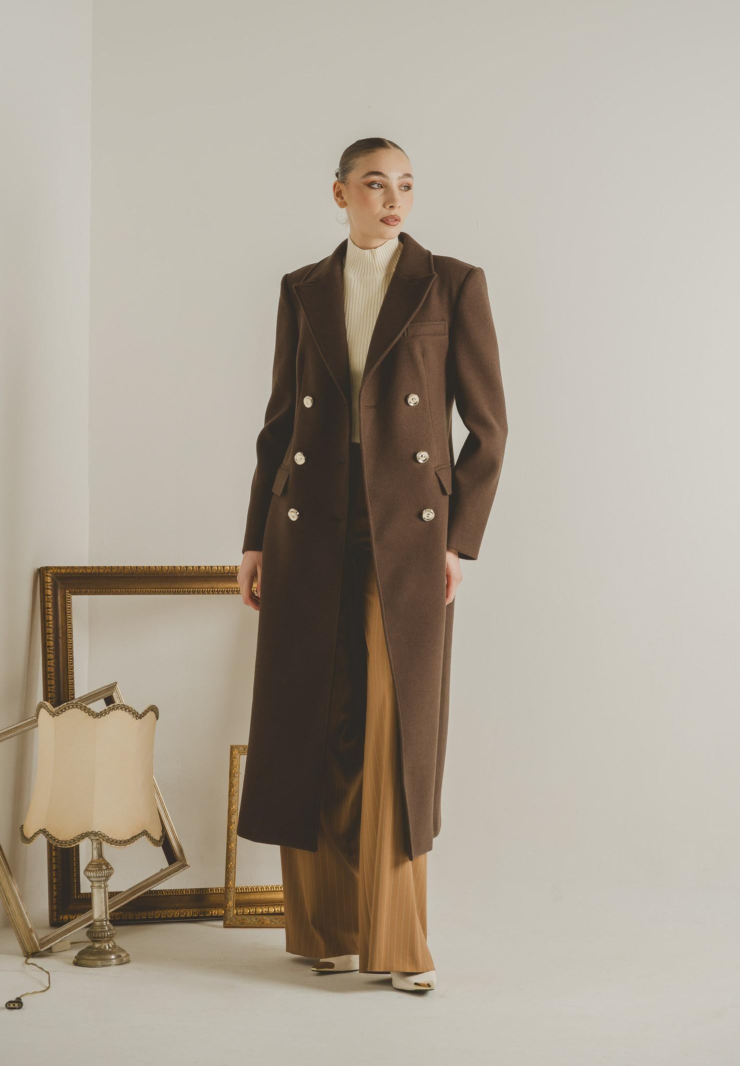 SANTAS Cappotto lungo ÉCLIPSE marrone da donna. La costruzione doppiopetto, arricchita da bottoni metallici dorati, esalta l'estetica classica e conferisce al capo un carattere deciso e senza tempo. Il rever ampio incornicia armoniosamente il décolleté, mentre la struttura aderente sul busto e più morbida sul fondo valorizza la silhouette con un effetto femminile e sofisticato. Le tasche con patta aggiungono un dettaglio sartoriale equilibrato, completando un design impeccabile. Perfetto per occasioni formali e look quotidiani di grande classe, è un cappotto che unisce eleganza, comfort e una cura meticolosa dei dettagli. La modella indossa una taglia 40 ed è alta 170cm. Si consiglia un lavaggio ed una stiratura a media temperatura. Stagione autunno inverno.