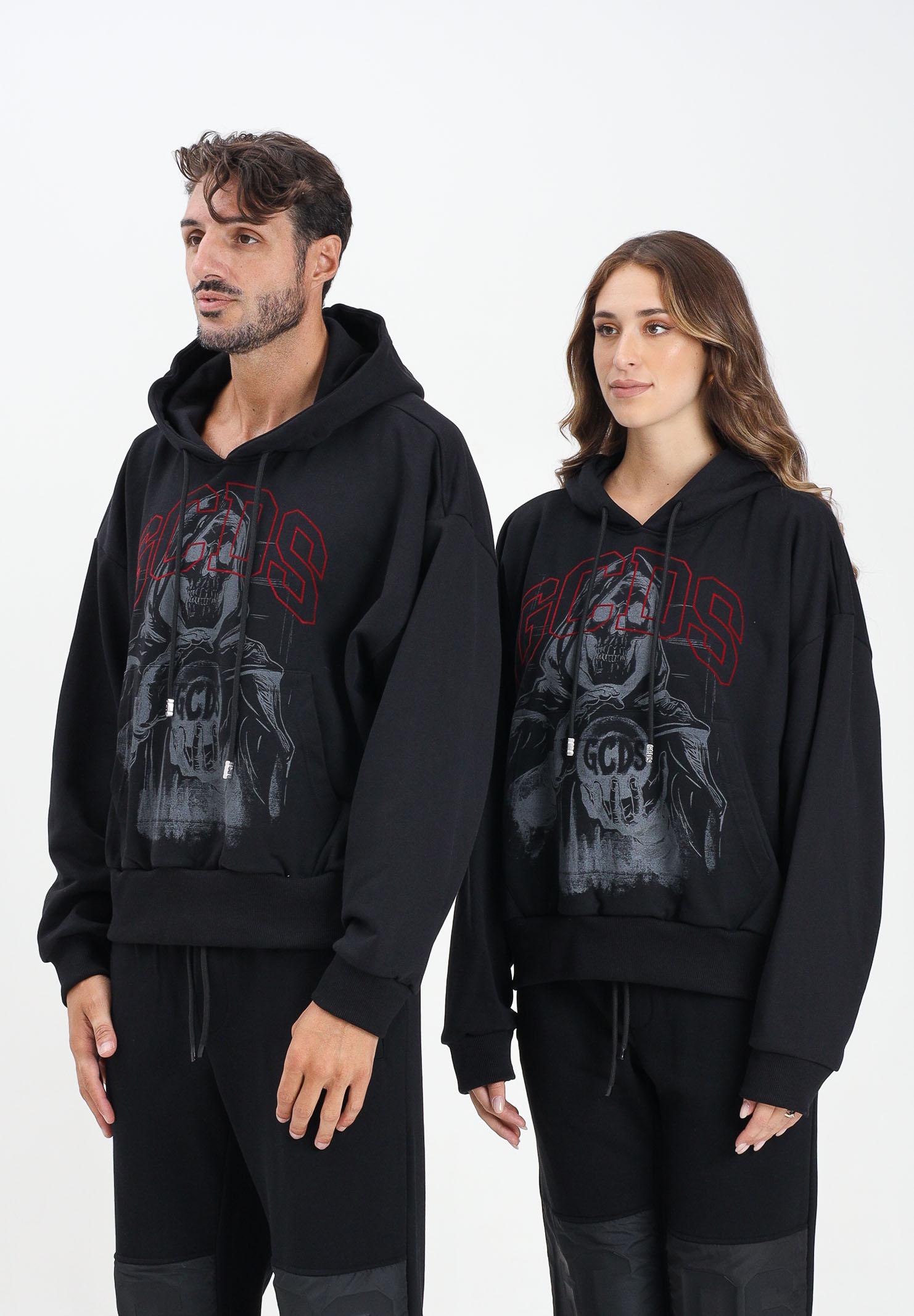 GCDS Felpa con cappuccio nera per uomo e donna caratterizzata da stampa