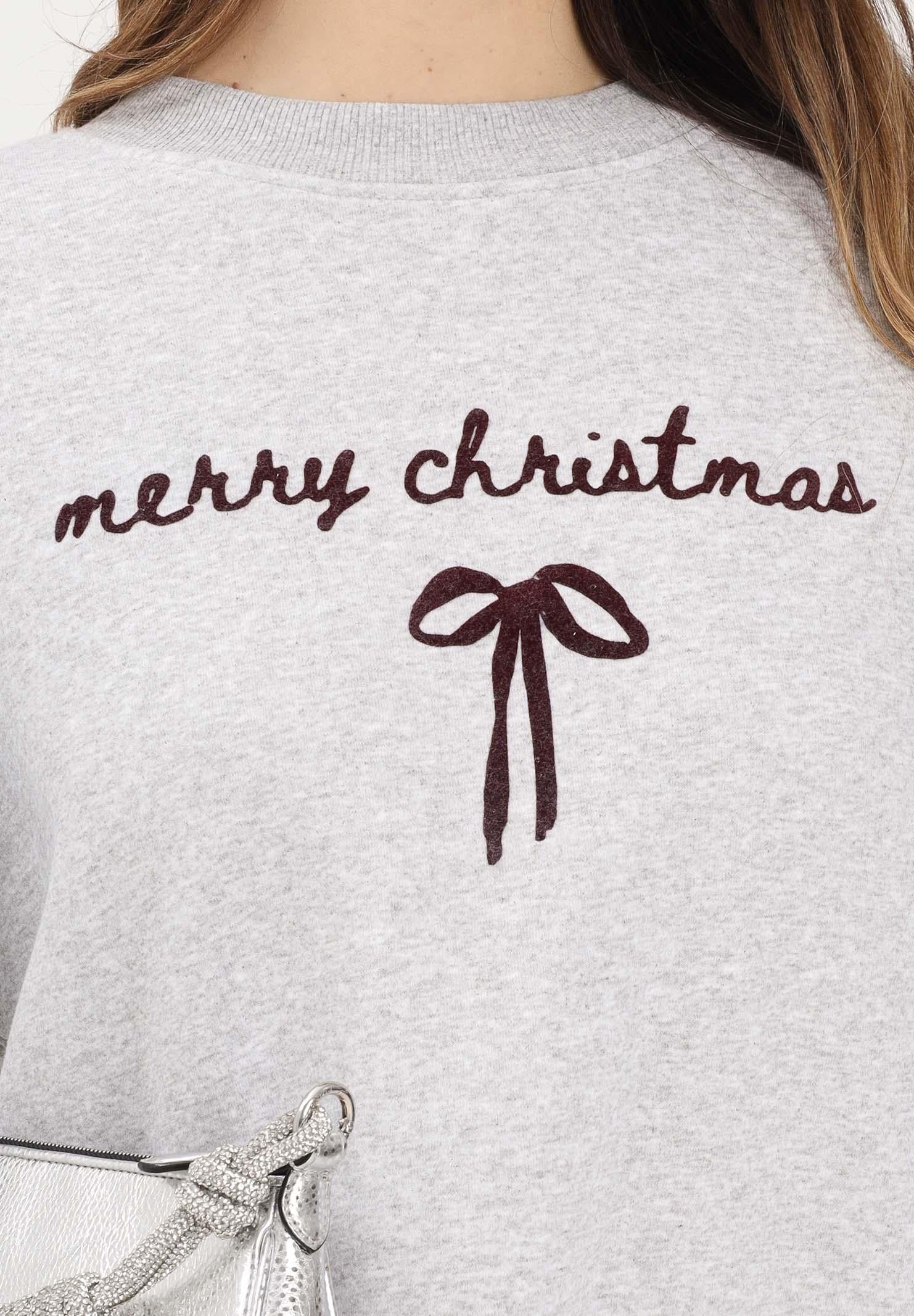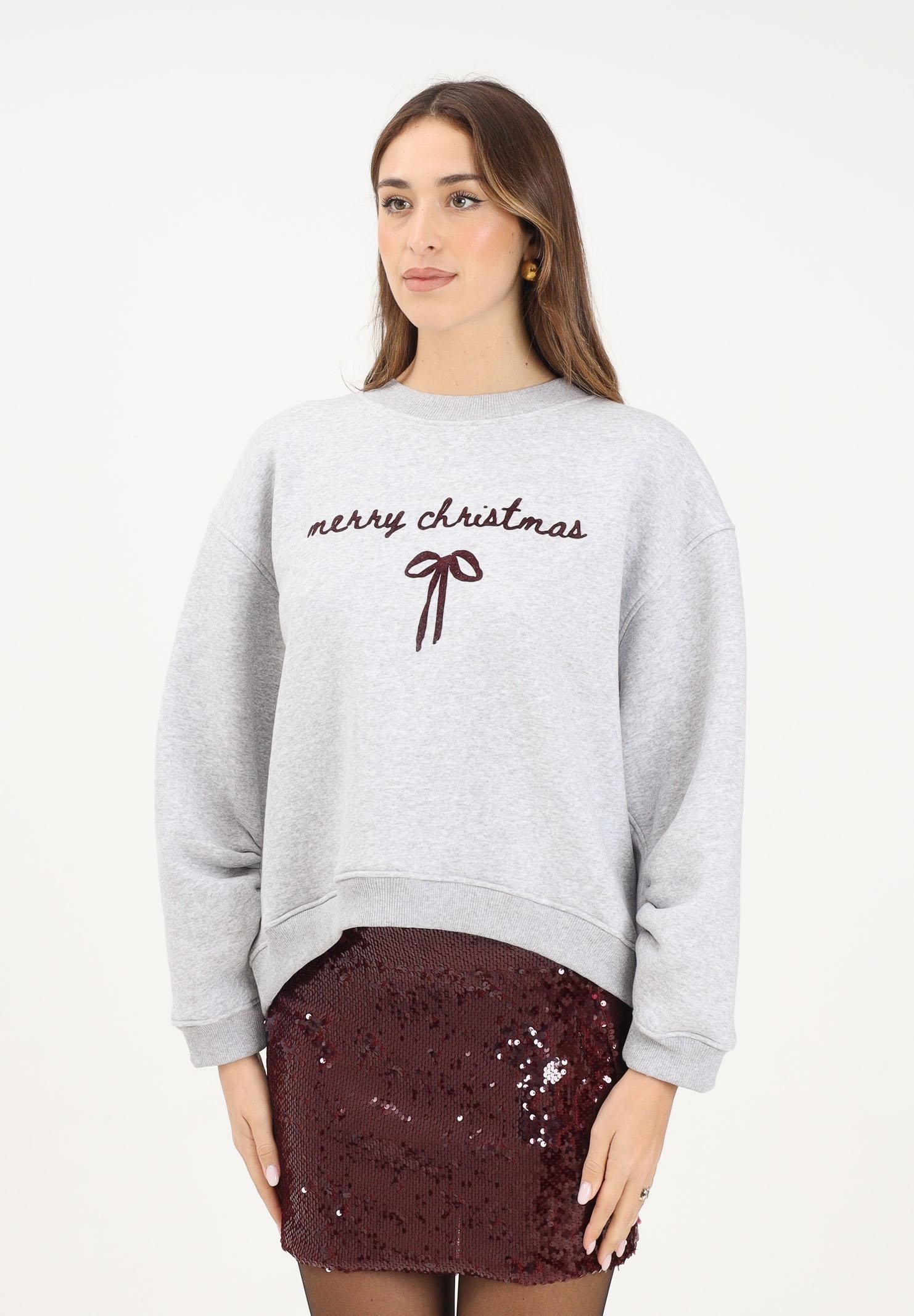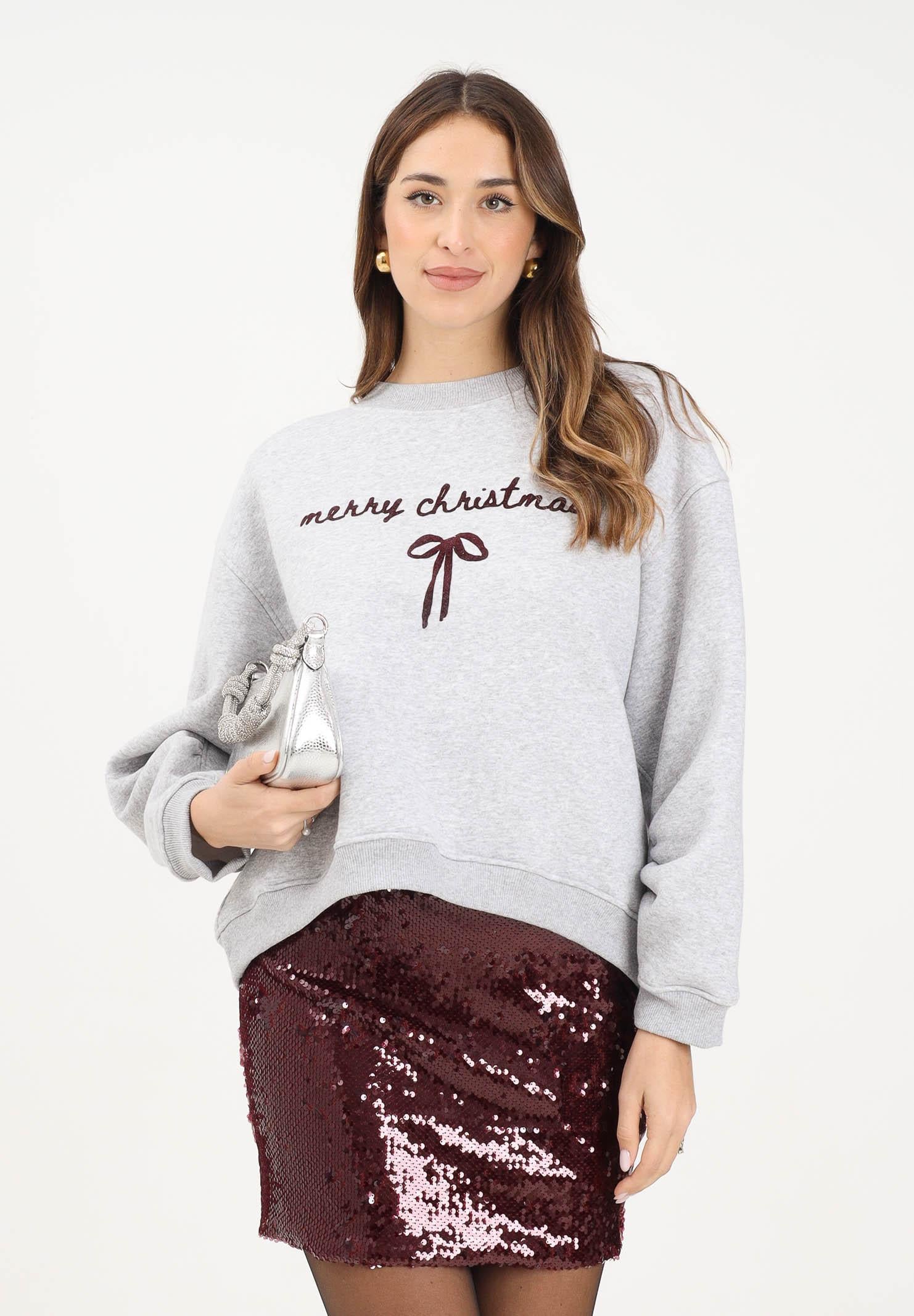 VICOLO Felpa girocollo grigia da donna. Il modello presenta una vestibilità rilassata, spalle scese e polsini a costine che assicurano un fit comodo e avvolgente. Sul fronte spicca la scritta ricamata "merry christmas" in un elegante tono bordeaux, accompagnata da un piccolo fiocco nello stesso colore, che aggiunge un dettaglio dolce e perfetto per il periodo natalizio. Il retro è completamente liscio, mantenendo un design pulito e versatile. Ideale da indossare con jeans, leggings o, per un look più glamour, con una gonna scintillante come in foto. La modella indossa una taglia UNI ed è alta 170cm. Si consiglia un lavaggio ed una stiratura a media temperatura. Stagione autunno inverno.