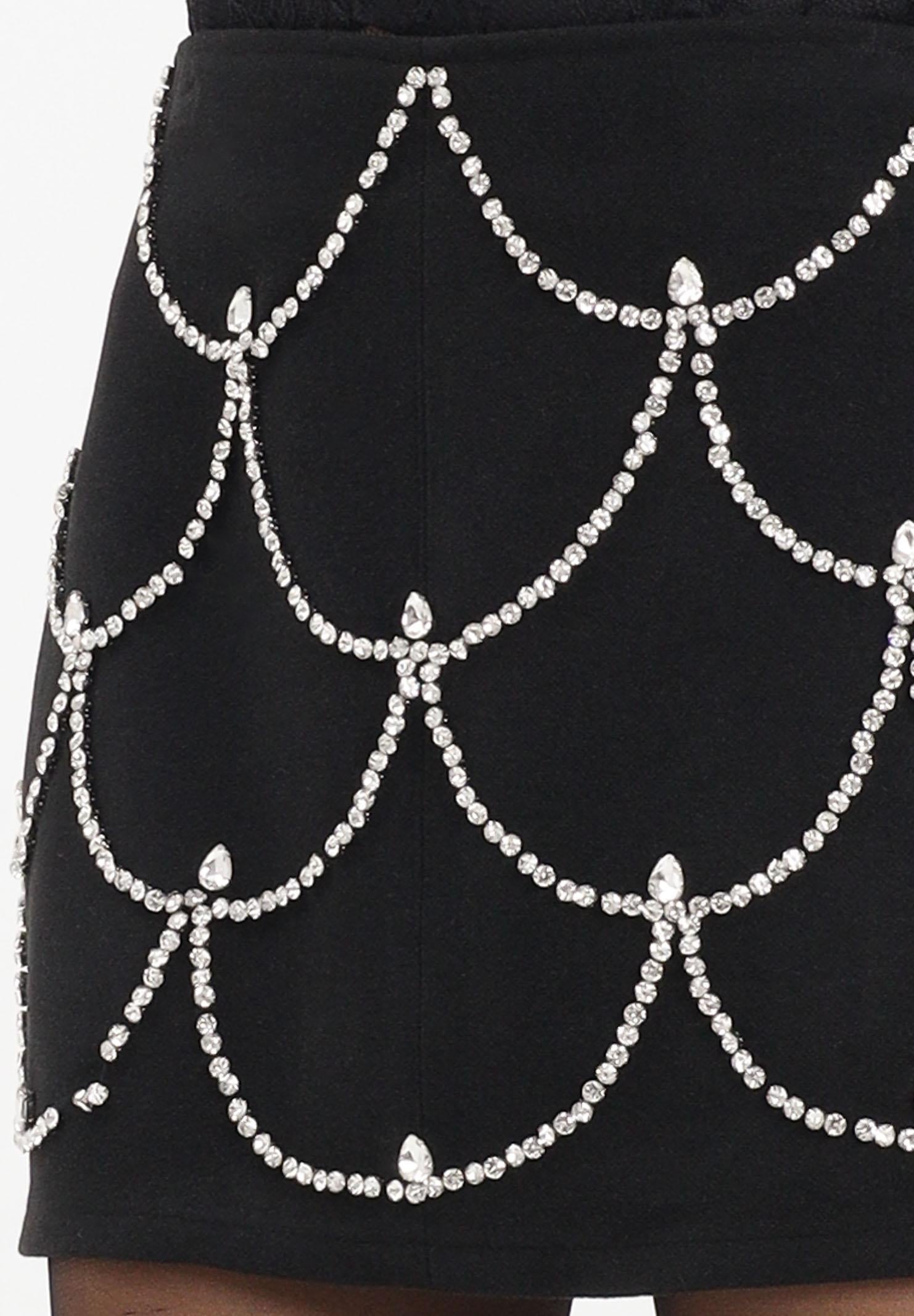 ODI ODI Gonna corta Orvieto nera da donna. Realizzata in tessuto strutturato, presenta una linea dritta e corta, che valorizza la figura con un taglio pulito e femminile. La parte frontale è impreziosita da un'elegante decorazione di strass e perle, disposta a motivo di catenelle luminose, che dona al capo un'allure sofisticata e glamour. La modella indossa una taglia S ed è alta 170cm. Si consiglia una stiratura a media temperatura. Stagione autunno inverno.