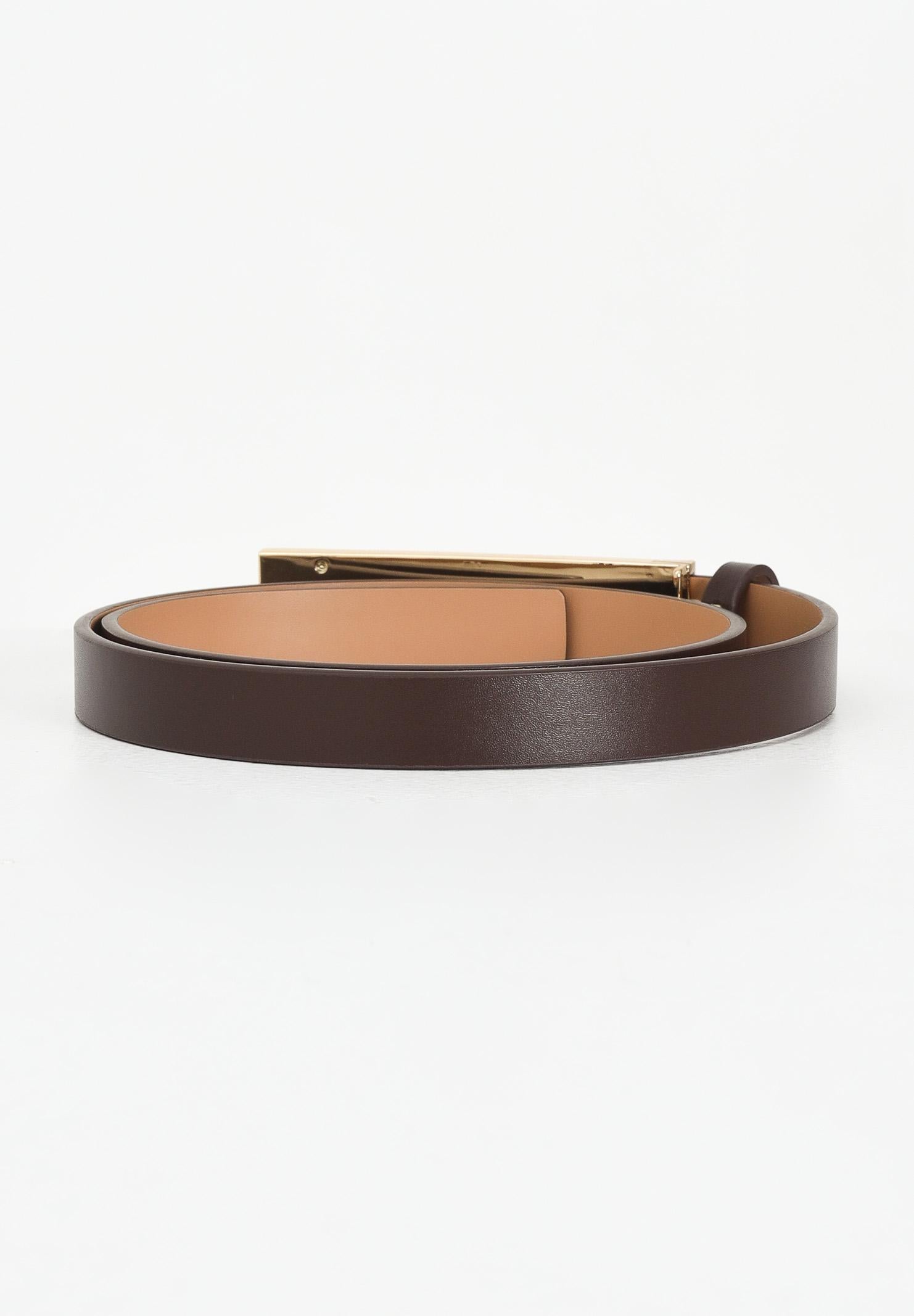 ELISABETTA FRANCHI Cintura marrone da donna, perfetta per completare con raffinatezza ogni look. Realizzata in similpelle liscia, presenta una fibbia dorata con logo inciso, che dona un tocco distintivo e sofisticato. Il design sottile e minimalista la rende ideale per abiti o pantaloni a vita alta, sia per occasioni formali che casual chic. La modella indossa taglia 40. Altezza: 1,5 cm. Stagione autunno inverno.