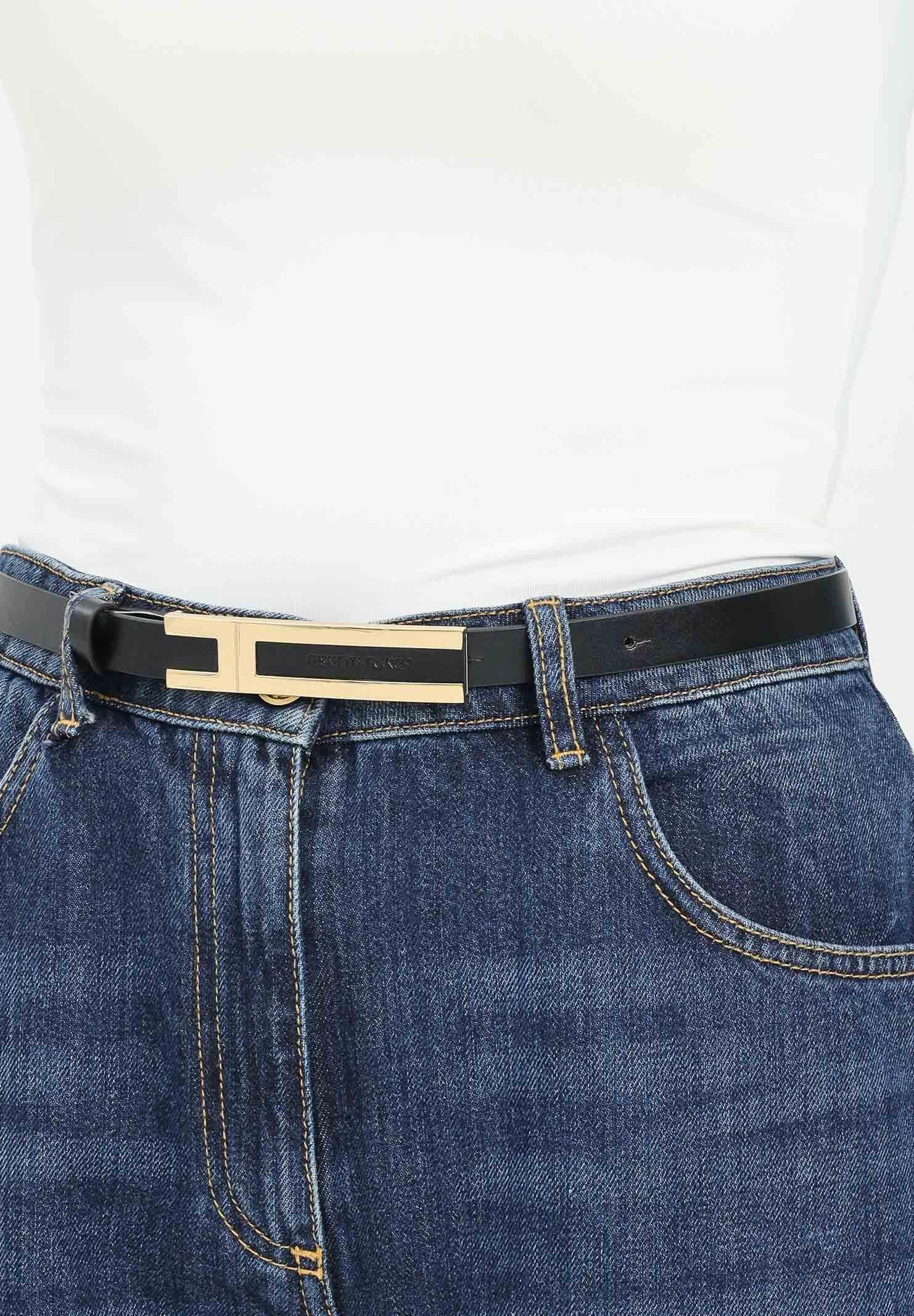 ELISABETTA FRANCHI Cintura nera da donna, perfetta per completare con raffinatezza ogni look. Realizzata in similpelle liscia, presenta una fibbia dorata con logo inciso, che dona un tocco distintivo e sofisticato. Il design sottile e minimalista la rende ideale per abiti o pantaloni a vita alta, sia per occasioni formali che casual chic. La modella indossa taglia 40. Altezza: 1,5 cm. Stagione autunno inverno.