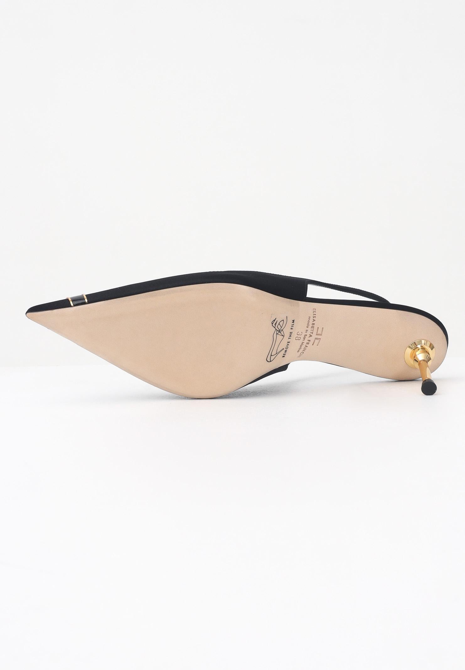 ELISABETTA FRANCHI Slingback nere da donna. Queste slingback nere sono un modello elegante e sofisticato, perfetto per occasioni formali o serate raffinate. Realizzate in tessuto satinato opaco, presentano una silhouette affusolata con punta pronunciata e scollo profondo che slancia il piede. Il dettaglio distintivo si trova sulla punta: un inserto lucido nero decorato con due sottili profili dorati e un piccolo logo inciso centralmente, che aggiunge un tocco di lusso discreto. Il tacco è basso e sottile, in metallo dorato, con un terminale in gomma nera che garantisce stabilità. Il design essenziale ma ricercato rende queste scarpe versatili, ideali da abbinare a tailleur sartoriali, abiti midi o completi da sera. Altezza tacco 5cm. Stagione autunno inverno.