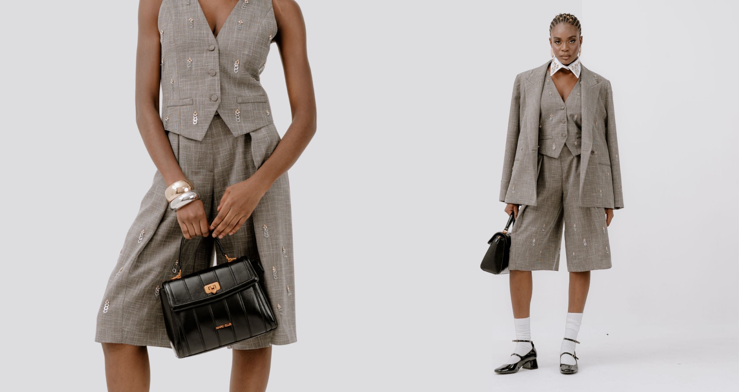 Bermuda grigio. Realizzati in tessuto con fantasia principe di Galles, sono arricchiti da dettagli applicati a cerchietti metallici che conferiscono un tocco contemporaneo e ricercato.