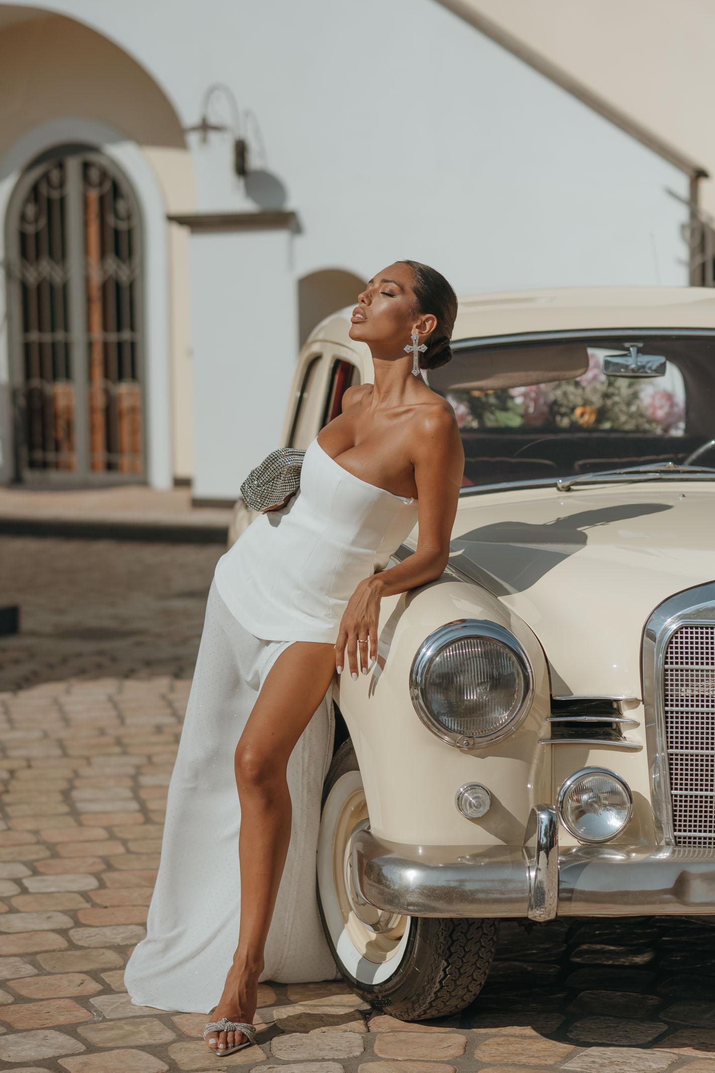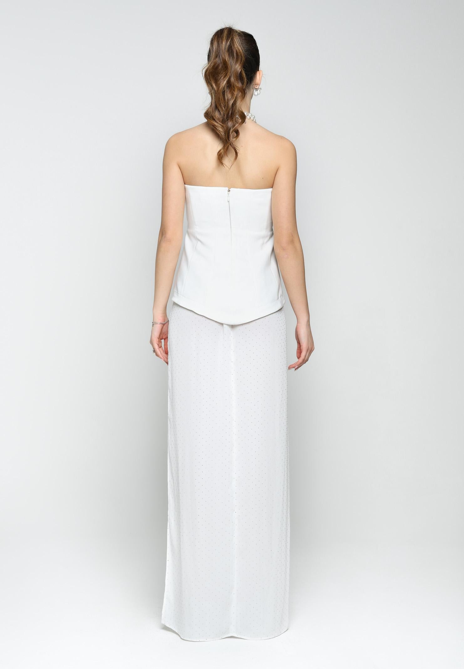 SANTAS Abito lungo CREAM bianco da donna. L'abito è un modello sofisticato perfetto per eventi eleganti e raffinati. Il top, senza spalline, è strutturato con un taglio aderente che crea una silhouette slanciata e femminile. La parte inferiore dell'abito è un'ampia gonna in tessuto leggero ricoperta da piccoli strass e presenta una spaccatura laterale che aggiunge un tocco sensuale. La chiusura sul retro consente una vestibilità impeccabile. La modella indossa una taglia 40 ed è alta 170cm. Si consiglia un lavaggio ed una stiratura a media temperatura. Stagione primavera estate.