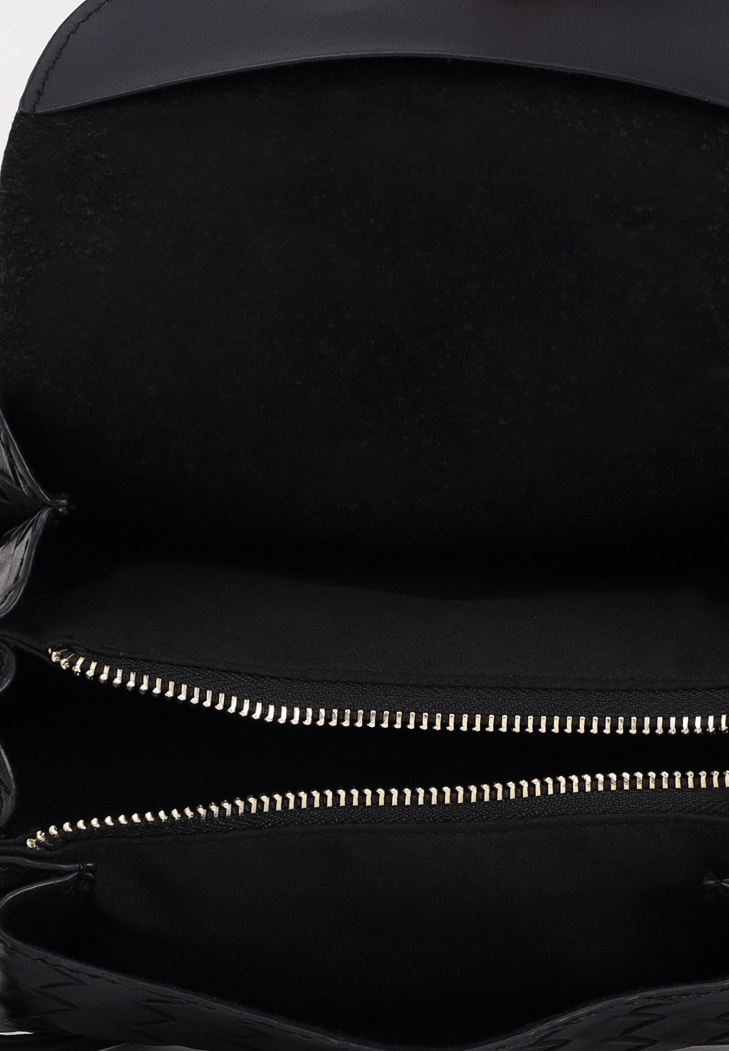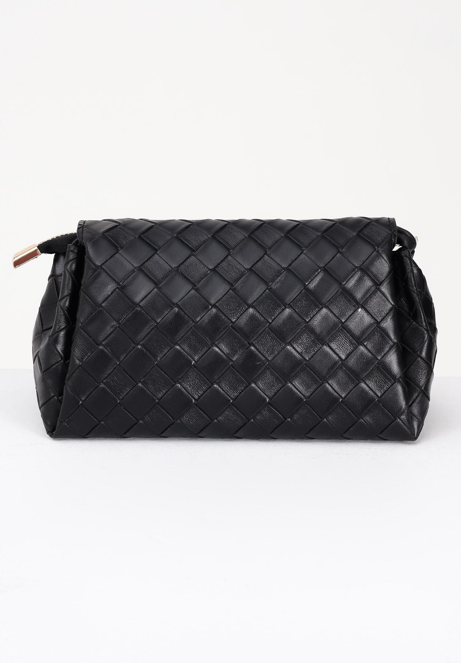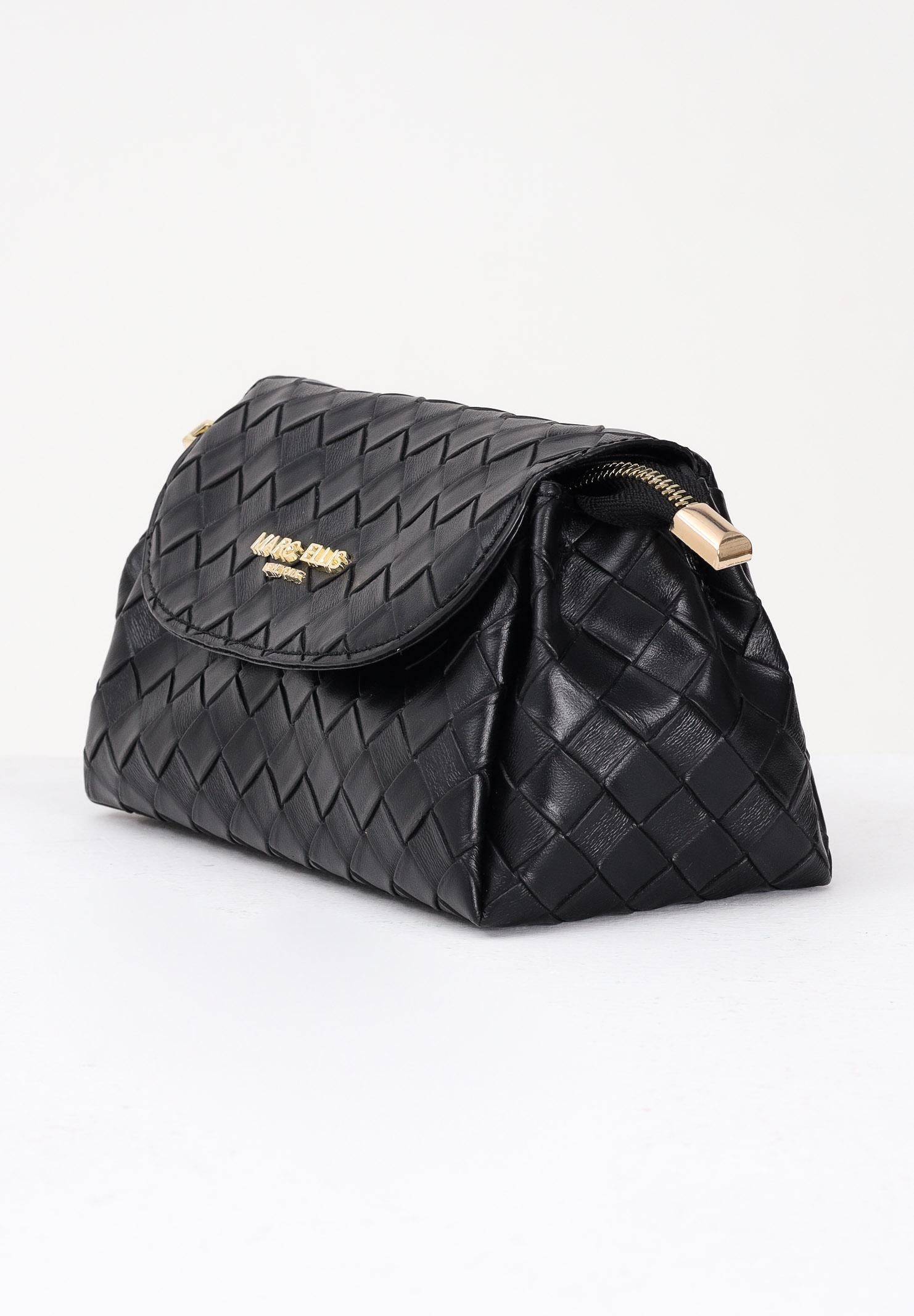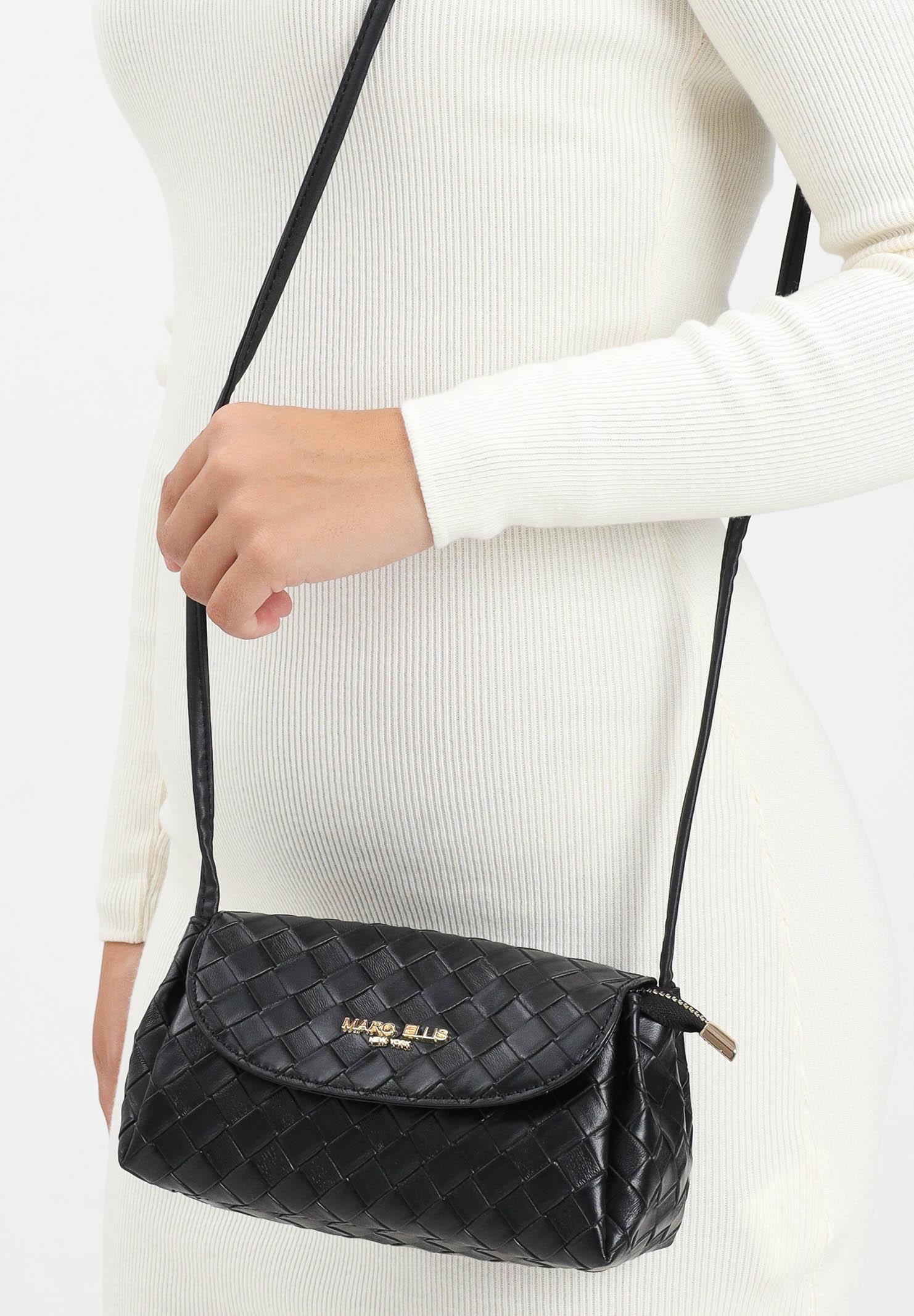 MARC ELLIS Borsa a tracolla Milenka nera da donna. La lavorazione effetto woven dona eleganza e ricercatezza, mentre la chiusura a patta con bottone magnetico assicura praticità. L'interno è organizzato con scomparto principale e tasca con zip, ideale per riporre con ordine gli oggetti essenziali. Logo frontale dorato a rilievo. Dotata di manico superiore per portarla a mano e di tracolla regolabile e removibile, che permette di indossarla anche a spalla o crossbody per un look più versatile. Un accessorio raffinato e funzionale, perfetto sia per il giorno che per la sera. Dimensioni: 20cm x 10cm x 11cm. Stagione autunno inverno.