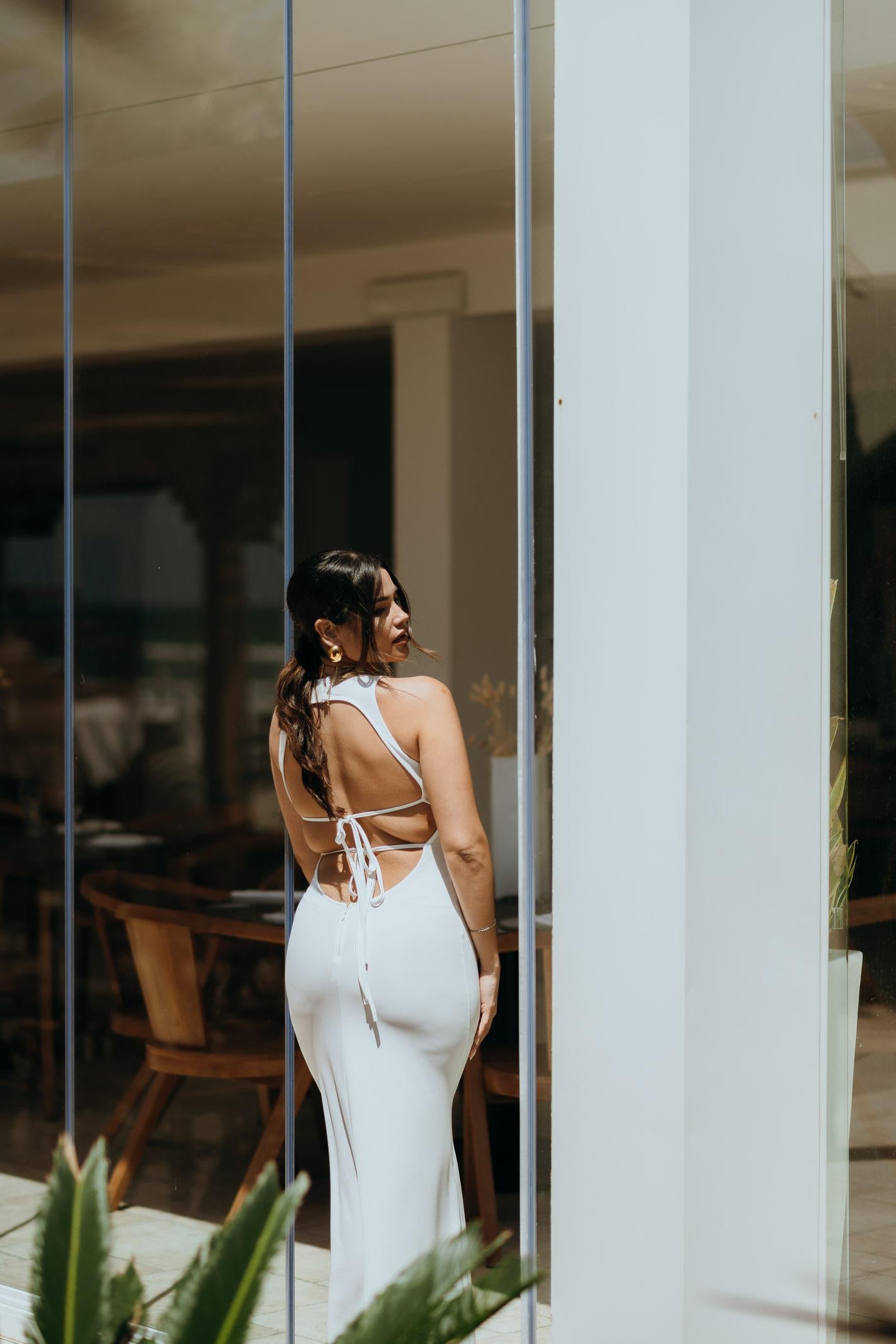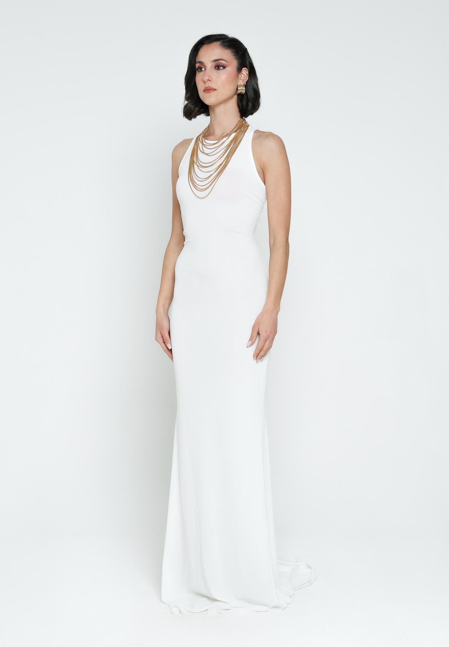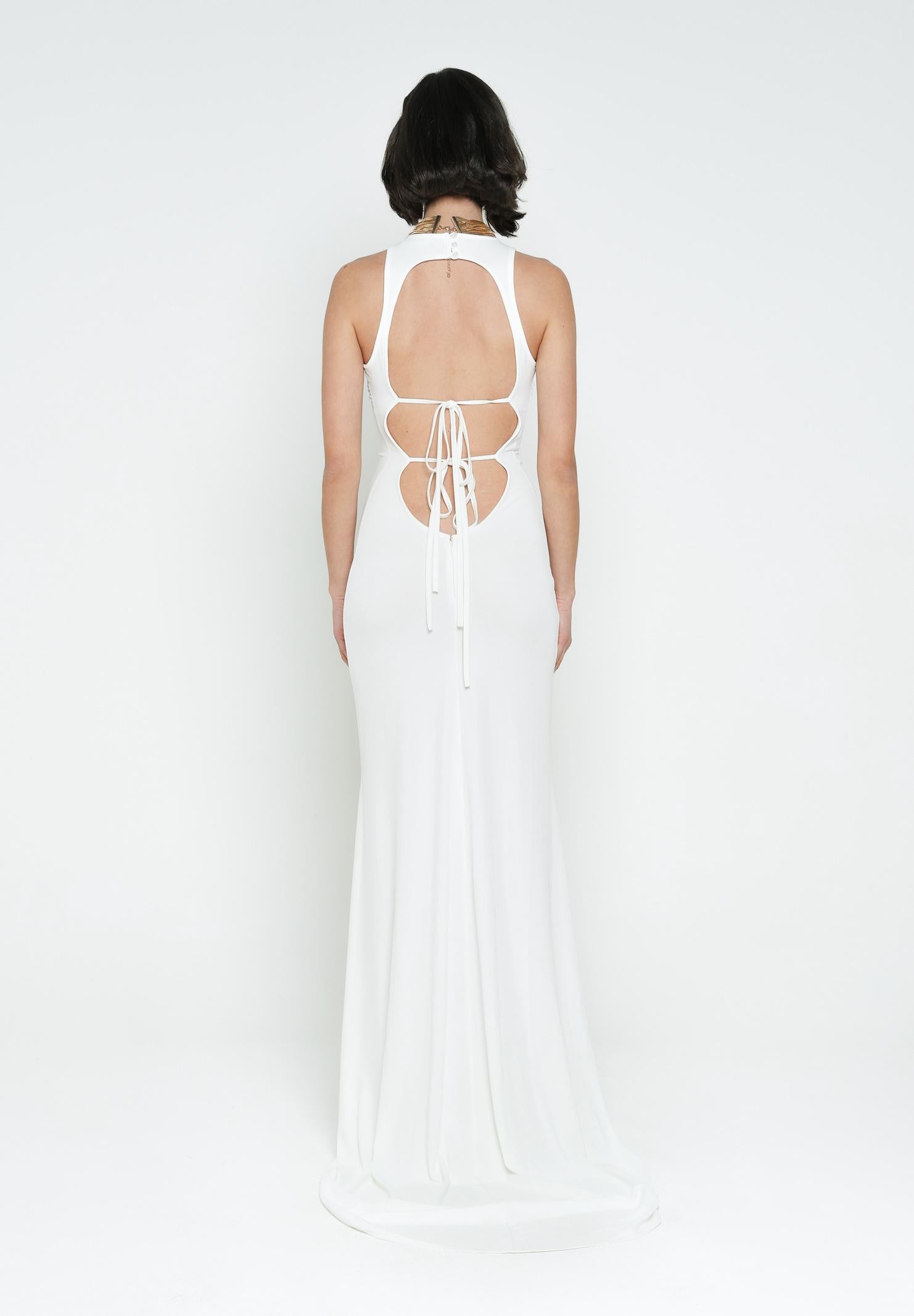 SANTAS Abito lungo BON BON bianco da donna. Questo abito presenta una silhouette aderente che si adatta perfettamente alla figura, ideale per un'occasione speciale. Il retro scollato presenta un dettaglio delicato con lacci che aggiunge eleganza e permette una vestibilità regolabile. La gonna lunga e fluente crea un drappeggio elegante che si estende in una morbida coda sul retro. Il design complessivo unisce un tocco di eleganza contemporanea e fascino classico, perfetto per un evento glamour. La modella indossa una taglia 38 ed è alta 170cm. Si consiglia un lavaggio ed una stiratura a media temperatura. Stagione primavera estate.