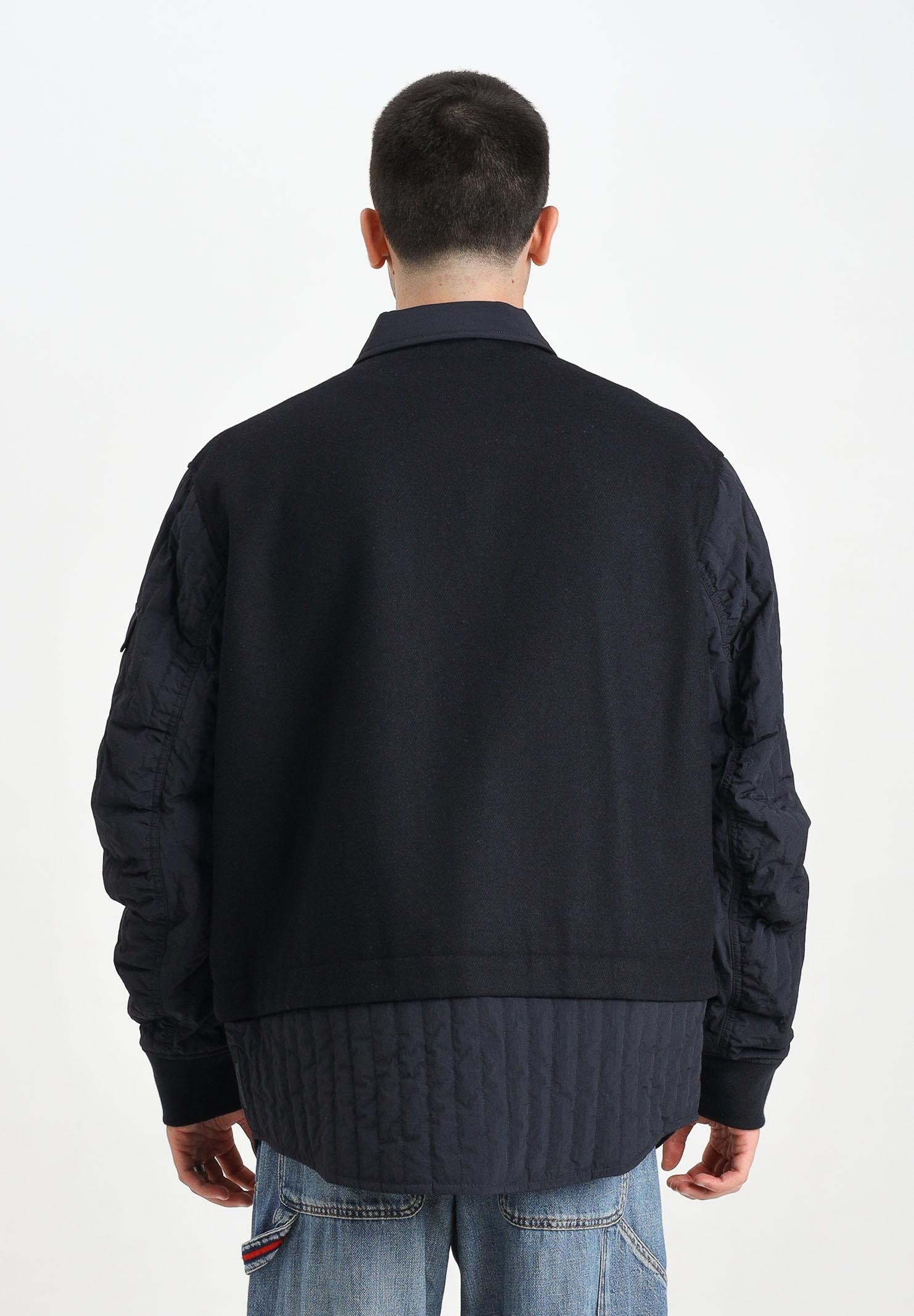 ARMANI EXCHANGE Giubbotto blu da uomo. Questo giubbotto presenta un design ibrido con corpo in materiale liscio e maniche trapuntate, che aggiungono un tocco tecnico e contemporaneo. Il modello ha una chiusura frontale con bottoni a pressione e tasche applicate sul petto con pattina, impreziosite dal logo discreto "Armani Exchange". La vestibilità è regolare, con colletto classico e lunghezza leggermente corta, ideale per outfit casual e streetwear. Perfetto da abbinare a jeans o pantaloni cargo per un look moderno e versatile. Il modello indossa una taglia L ed è alto 187cm. Si consiglia una stiratura a media temperatura. Stagione autunno inverno.