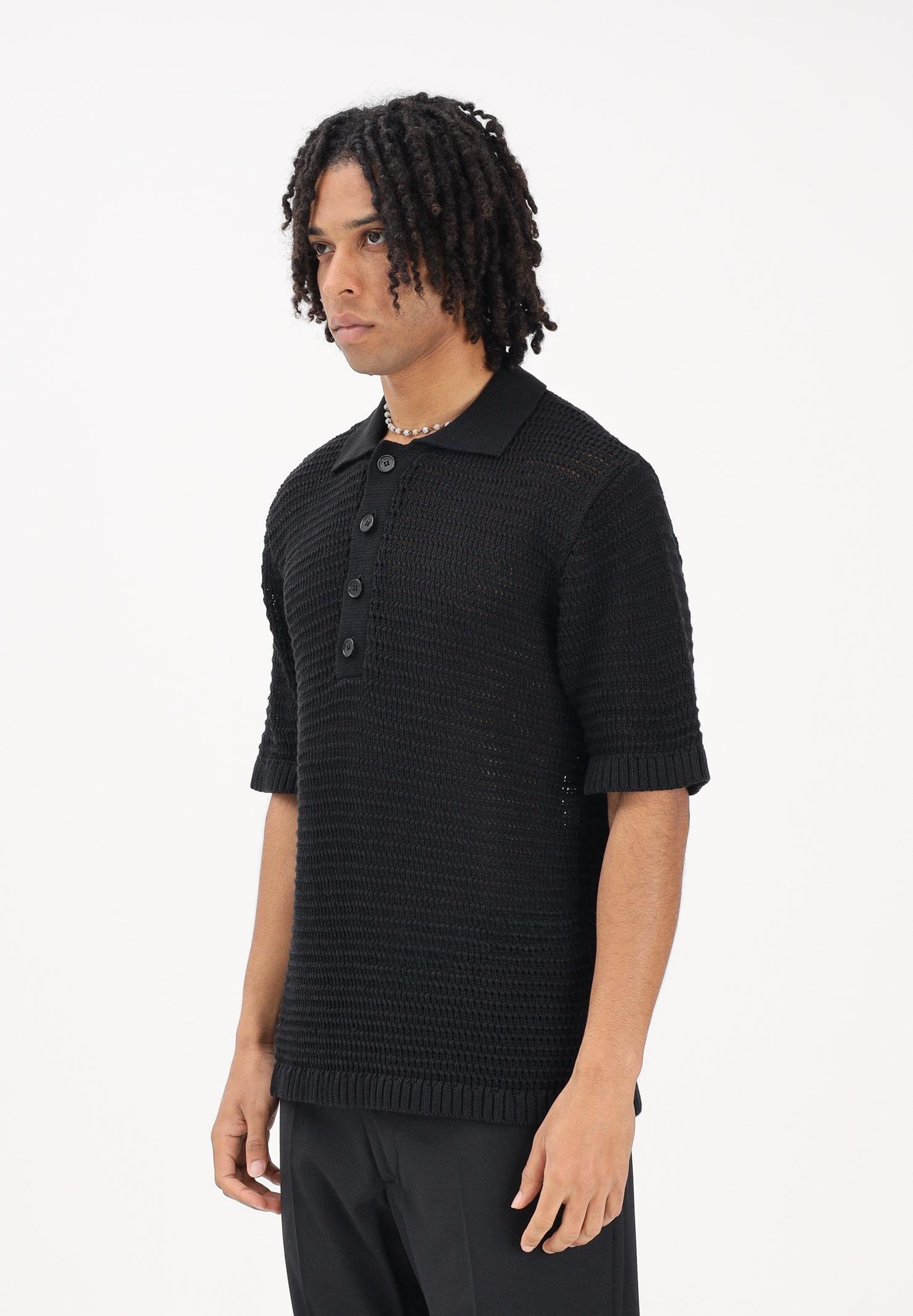 I'M BIRAN Polo nera da uomo in tessuto lavorato a maglia traforata