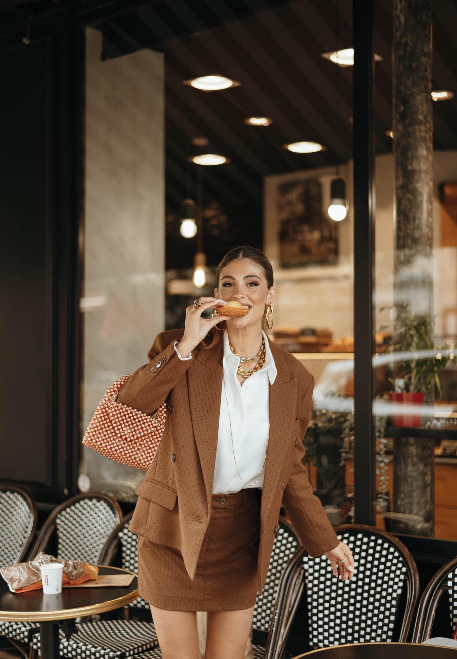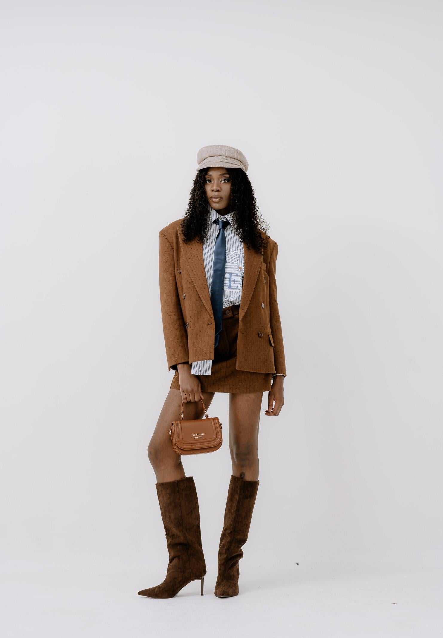 VICOLO Giacca doppiopetto cammello da donna con motivo gessato e strass. Il modello doppiopetto, con sei bottoni frontali e revers classici, esalta lo stile sartoriale e dona un'allure decisa e sofisticata. La vestibilità leggermente over, arricchita da spalle strutturate, conferisce un aspetto moderno senza rinunciare alla classicità del taglio. Sul davanti, le tasche con patta e il taschino a filetto sul petto aggiungono funzionalità e dettagli ricercati, mentre lo spacco centrale sul retro garantisce comfort e movimento. La lunghezza regolare, che arriva ai fianchi, la rende ideale per creare completi coordinati con la sua gonna, perfetti per un look formale e femminile, ma anche per essere indossata con pantaloni o jeans, dando vita a combinazioni più contemporanee e quotidiane. È una giacca pensata per chi desidera uno stile curato e senza tempo, capace di adattarsi a diverse occasioni con naturale eleganza. La modella indossa una taglia S ed è alta 170cm. Si consiglia una stiratura a media temperatura. Stagione autunno inverno.