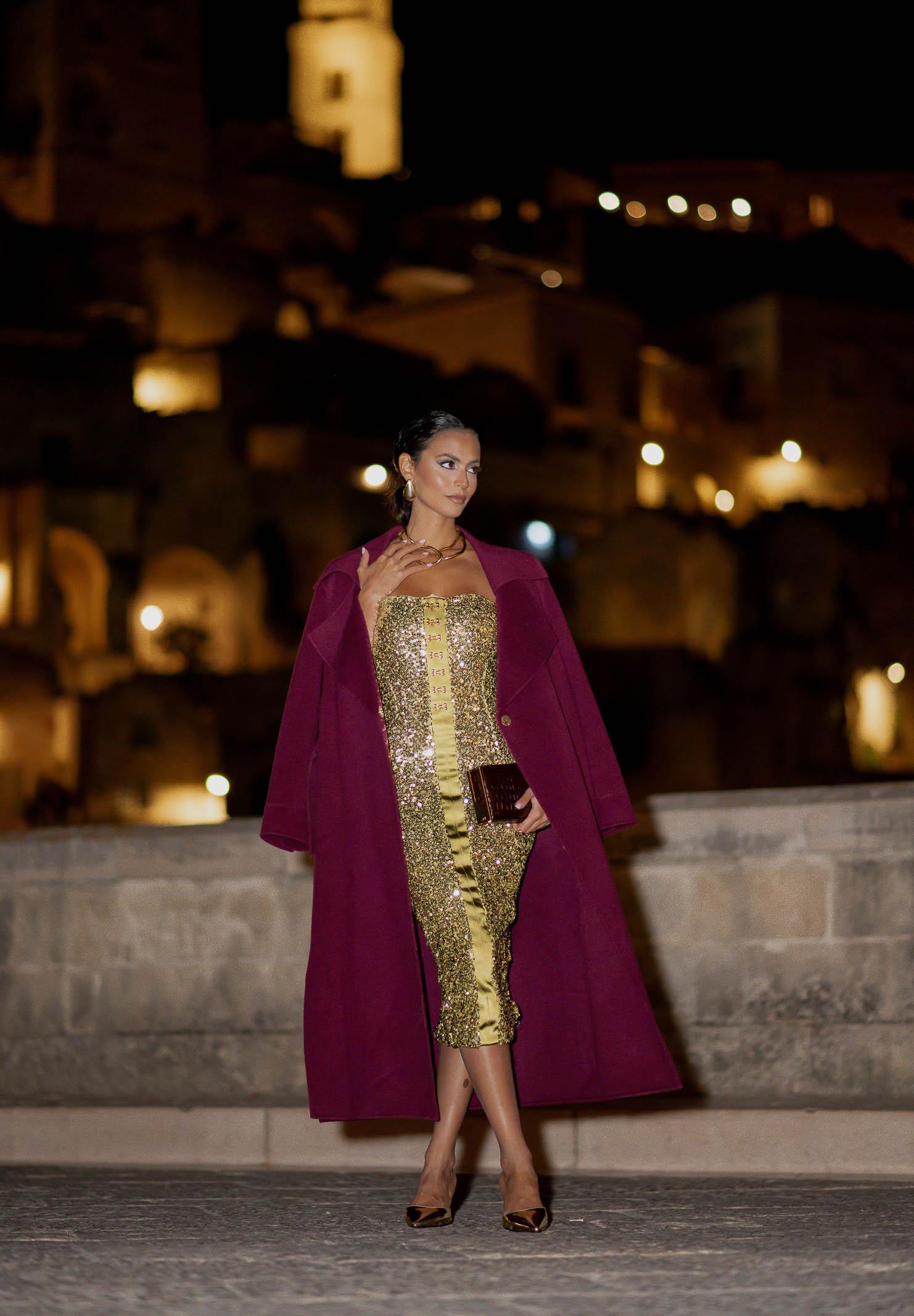 SIMONA CORSELLINI Damenmantel in Burgunderrot. Dieser lange Mantel vereint klassische Eleganz und modernen Komfort. Gefertigt aus einem warmen, kuscheligen Stoff, präsentiert er sich in einem edlen Burgunderton, ideal für die kalte Jahreszeit. Der Mantel im Wickeldesign mit breitem Kragen und weichen Revers verleiht der Silhouette Charakter und Weiblichkeit. Der Frontverschluss mit einem Gürtel aus demselben Stoff ermöglicht es, das Kleidungsstück in der Taille zu schnüren und so die Figur auf natürliche Weise zu betonen. Die seitlichen Leistentaschen sind praktisch und fügen sich nahtlos in die Silhouette des Mantels ein, während der seitliche Schlitz am Saum Dynamik und Bewegungsfreiheit verleiht und so auch beim Gehen eine elegante Linie bewahrt. Vielseitig und raffiniert, eignet sich dieser Mantel sowohl für den Alltag mit Hose und Stiefeln als auch für elegantere Anlässe über einem Kleid. Ein Must-have für einen stilvollen Winter. Das Model trägt Größe 38 und ist 170 cm groß. Bügeln bei mittlerer Temperatur wird empfohlen. Herbst/Winter.