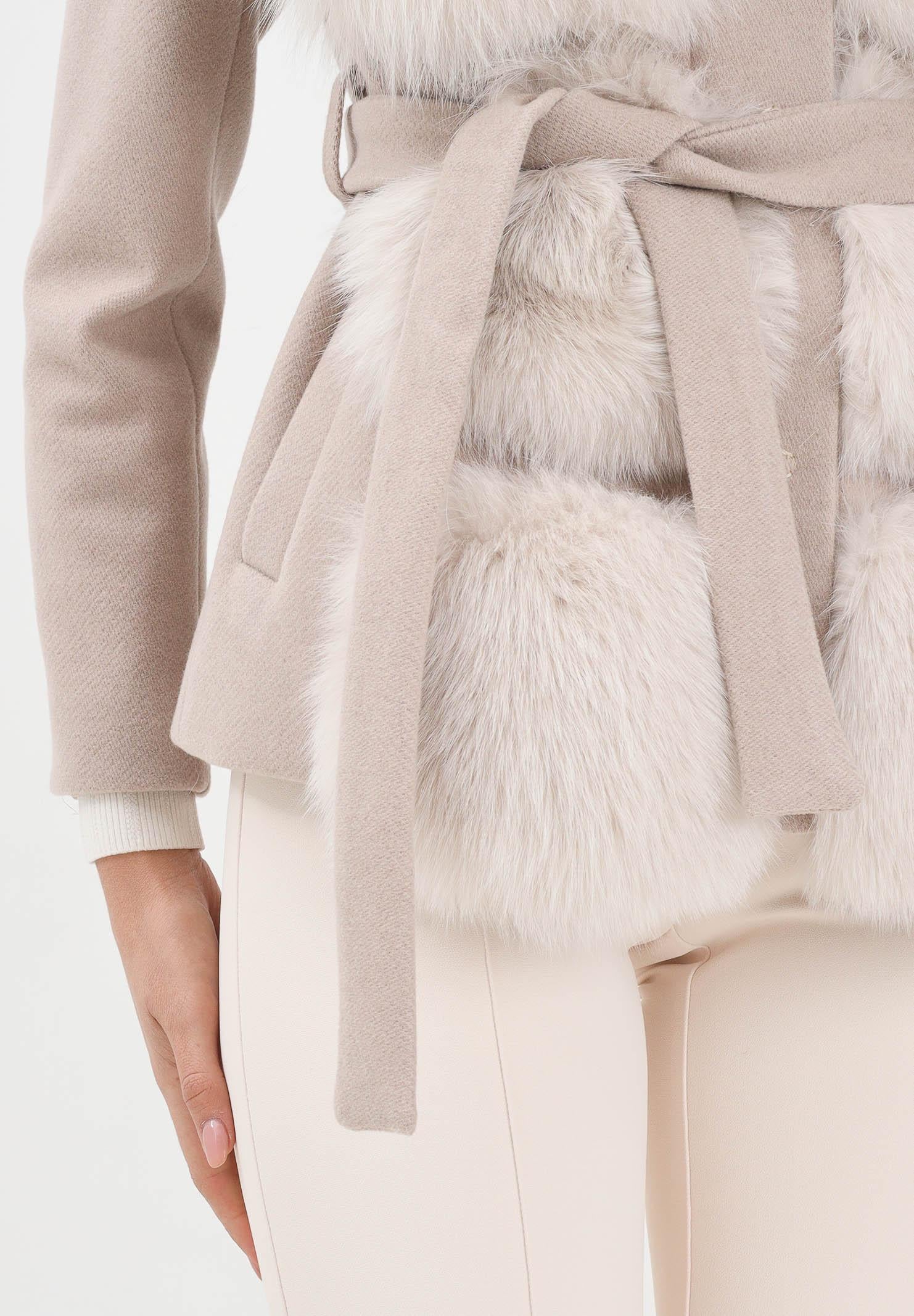YES LONDON Dieser kurze beige Damenmantel ist ein raffiniertes Kleidungsstück mit luxuriösem Flair. Er ist aus weichem, strukturiertem Stoff gefertigt und hat eine feminine, leicht taillierte Silhouette, die die Figur betont. Er ist mit Details aus echtem Fuchspelz verziert, die den Kragen umschlingen und die Vorderseite mit Eleganz und Volumen schmücken, wodurch ein reicher, raffinierter Effekt entsteht. Der Taillengürtel betont die Figur und verleiht dem Design einen Hauch von Modernität. Weich, warm und unglaublich schick – dieser Mantel ist perfekt für besondere Anlässe oder um alltäglichen Looks im Winter einen Hauch von raffinierter Eleganz zu verleihen. Das Model trägt Größe 40 und ist 170 cm groß. Herbst/Winter-Saison.