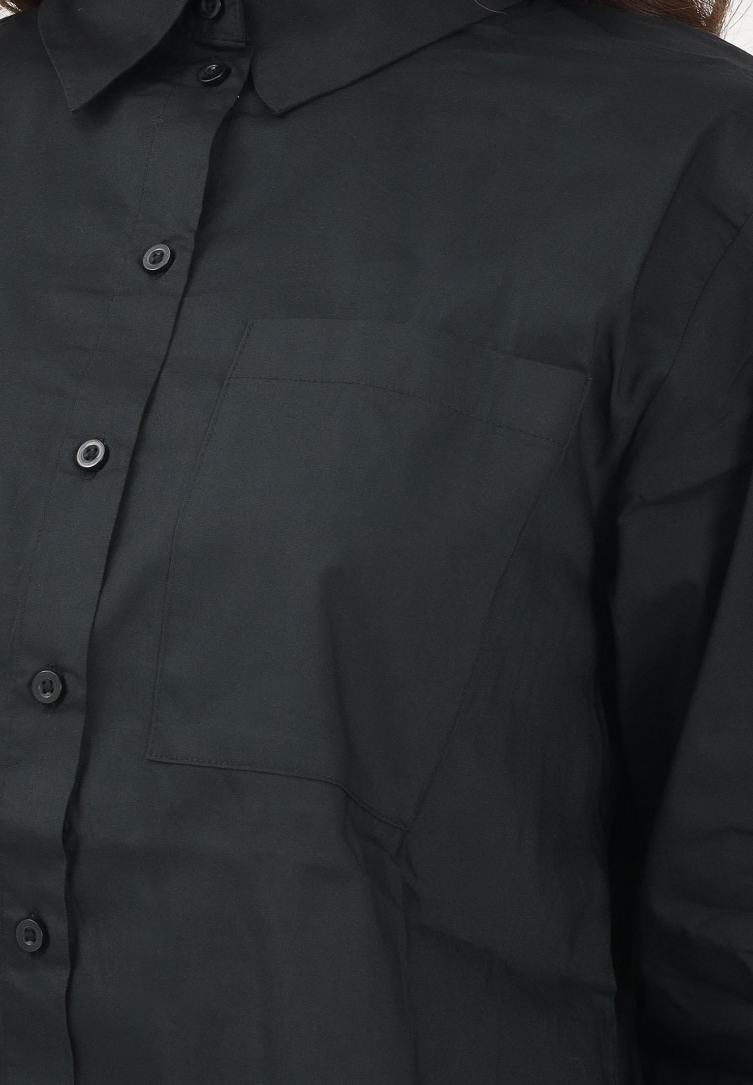 Schwarzes Langarmshirt von JDY für Damen aus leichtem, kompaktem Material für eine bequeme und elegante Passform. Der leicht verkürzte, kastenförmige Schnitt mit gerader Silhouette verleiht dem Shirt eine moderne Note. Der klassische Kragen und die farblich abgestimmte Knopfleiste sorgen für einen schlichten, eleganten Look, während die aufgesetzte Brusttasche ein funktionales und dezentes Detail darstellt. Lange Ärmel mit definierten Manschetten runden das Design ab und machen das Shirt vielseitig kombinierbar – sowohl zu Röcken als auch zu hochgeschnittenen Hosen. Das Model trägt Größe S und ist 175 cm groß. Maschinenwäsche und Bügeln bei mittlerer Hitze werden empfohlen. Frühjahr/Sommer-Saison.