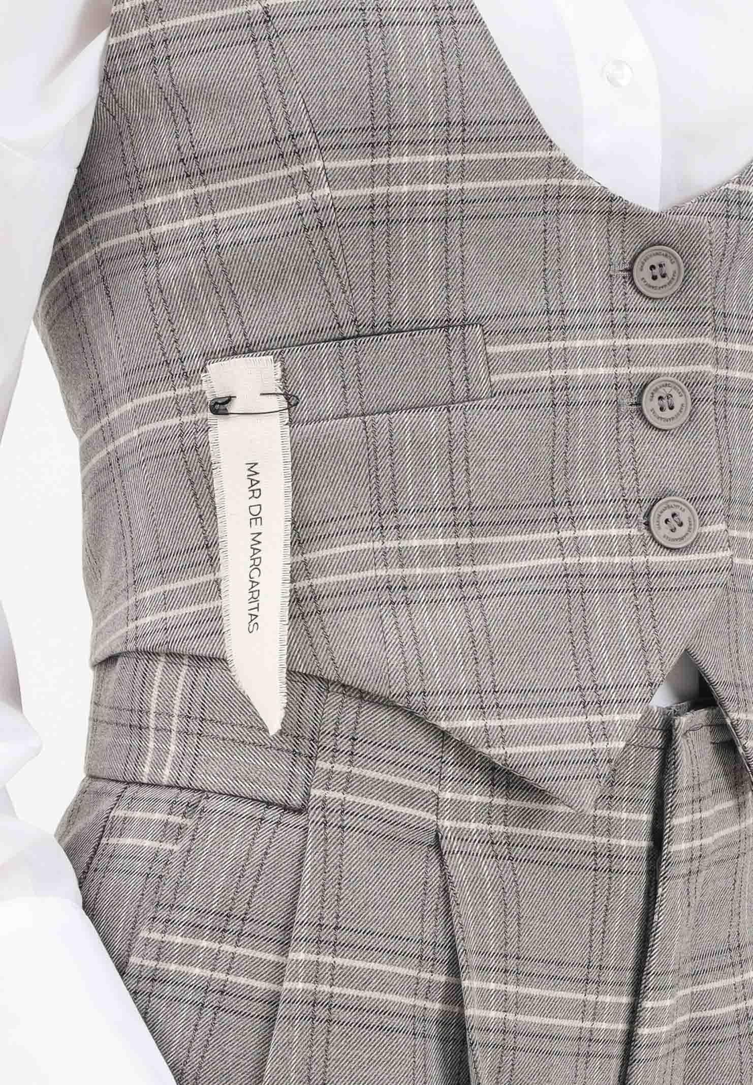 Die graue Damenweste Agata von MAR DE MARGARITAS aus Prince-of-Wales-Karostoff ist perfekt für einen eleganten und modernen Look. Sie verfügt über einen Drei-Knopf-Frontverschluss und zwei Leistentaschen. Auf der Rückseite befindet sich ein verstellbarer Gürtel mit Schnalle für eine individuelle Passform. Die Taille ist leicht tailliert, mit einem spitzen Saum vorne, der die Silhouette betont. Das Model trägt Größe S und ist 170 cm groß. Maschinenwäsche und Bügeln bei mittlerer Hitze werden empfohlen. Erhältlich für Herbst/Winter.