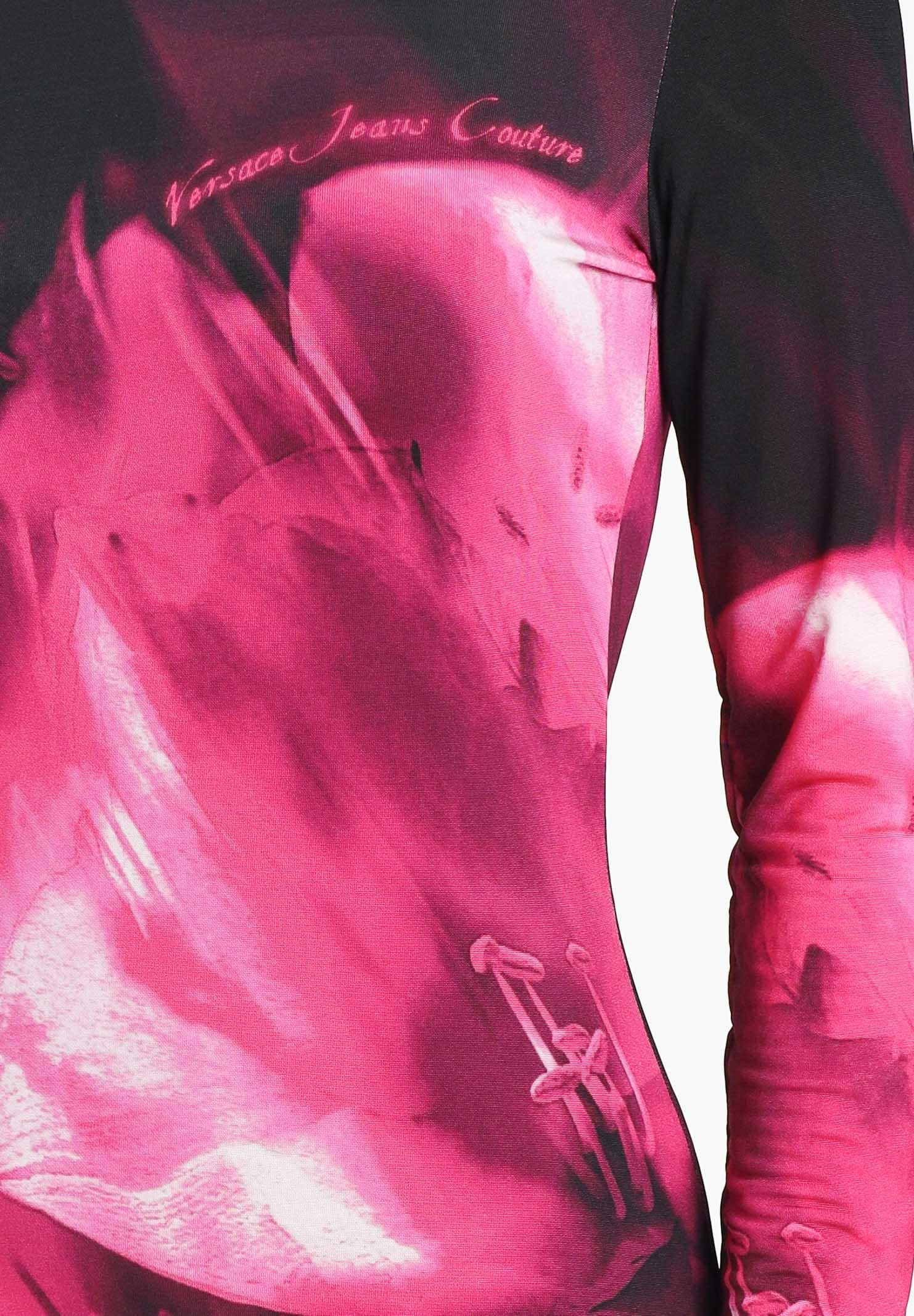 Schwarzes Etuikleid von VERSACE JEANS COUTURE – ein ausdrucksstarkes und elegantes Midikleid für Damen, perfekt für alle, die stilvoll auffallen möchten. Gefertigt aus dehnbarem Material, das die Figur schmeichelt, besticht es durch einen kunstvollen „Smoke“-Print in Fuchsia-Tönen auf schwarzem Grund, der eine starke und dynamische Wirkung erzielt. Das Farbverlaufsmotiv umspielt Vorderseite, einen Arm und Rücken und verleiht dem Look Bewegung und Tiefe. Der figurbetonte Schnitt, die knielange Silhouette und die langen Ärmel machen es ideal für Abendveranstaltungen oder besondere Anlässe. Das dezent in den Print integrierte „Versace Jeans Couture“-Logo auf Brust und Rücken unterstreicht die Exklusivität der Marke. Das Model trägt Größe 40 und ist 170 cm groß. Maschinenwäsche und Bügeln bei mittlerer Hitze. Herbst-/Wintersaison.