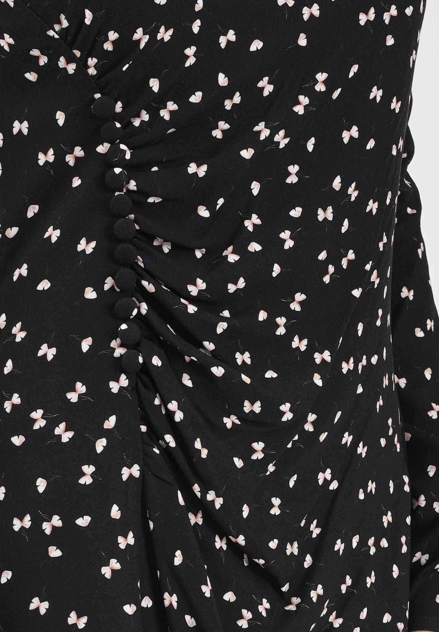 MAR DE MARGARITAS Kurzes schwarzes Damenkleid Dora mit Mikro-Fliegenprint. Die taillierte Silhouette betont die Figur, der leicht ausgestellte Rock sorgt für Bewegung. Die langen Ärmel mit Raffung verleihen Volumen und Charakter, während die Raffung in der Rückenmitte für Komfort und eine harmonische Passform sorgt. Dank der Länge über dem Knie lässt es sich ideal mit hauchdünnen Strümpfen und Pumps für ein elegantes Outfit oder mit Stiefeletten für einen lässigeren, aber dennoch raffinierten Look kombinieren. Das Model trägt Größe S und ist 170 cm groß. Maschinenwäsche und Bügeln bei mittlerer Hitze werden empfohlen. Herbst/Winter.