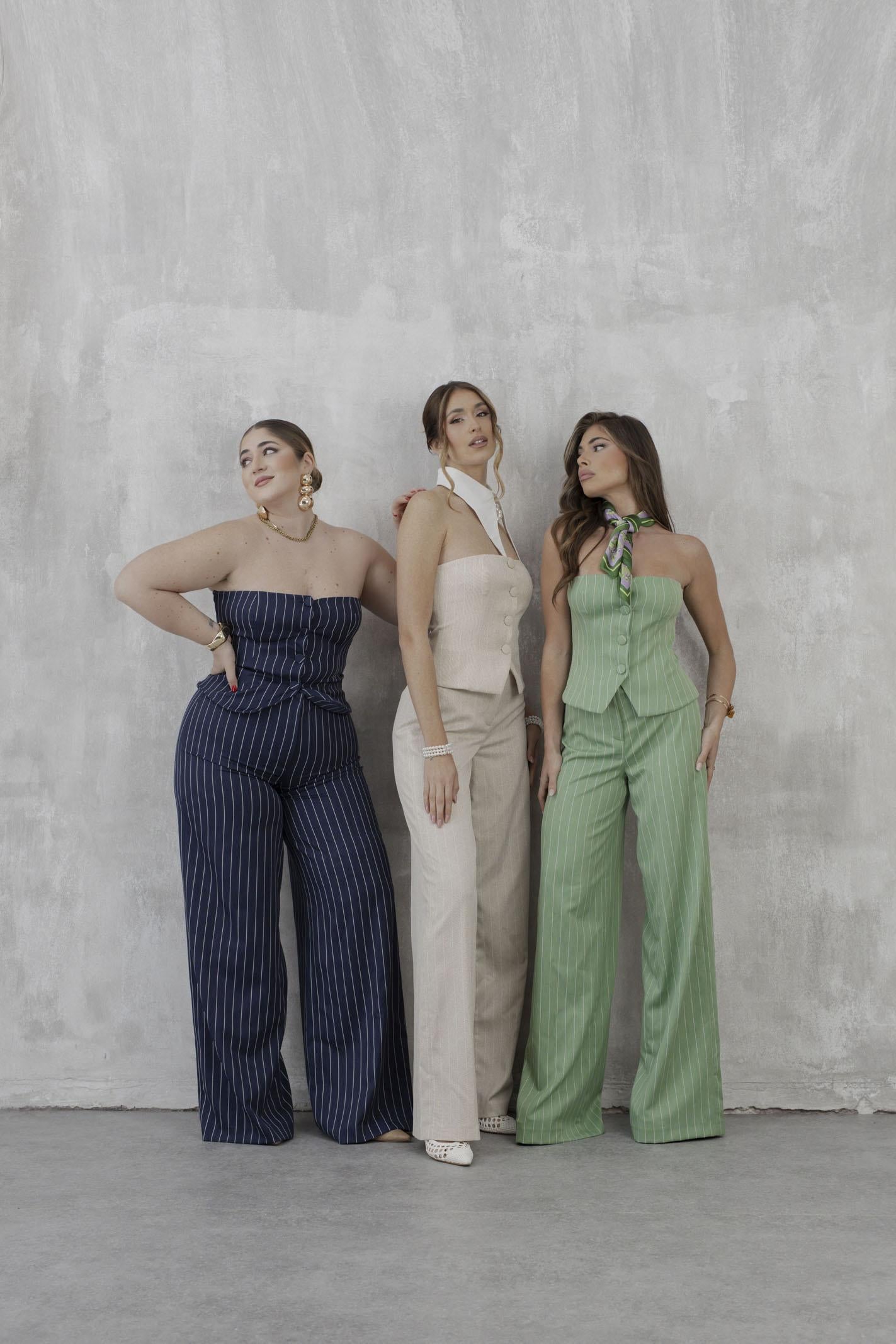 SANTAS APPLE PIE blaue Damenhose. Diese Hose verfügt über einen dünnen weißen Streifendruck, der ihr einen frischen und edlen Look verleiht. Die Silhouette ist weit und fließend, mit einem Palazzo-Schnitt, der Komfort und Bewegungsfreiheit gewährleistet. Die Hose hat eine hohe Taille, die die Figur betont und für einen eleganten Look sorgt. Es eignet sich perfekt für einen lässig-schicken Look oder für einen besonderen Anlass und lässt sich problemlos mit einer Vielzahl von Tops oder Hemden kombinieren, wodurch ein stilvoller Kontrast zwischen modernem Design und Komfort entsteht. Das Model trägt Größe 40 und ist 170cm groß. Wir empfehlen Waschen und Bügeln bei mittlerer Temperatur. Frühlings- und Sommersaison.