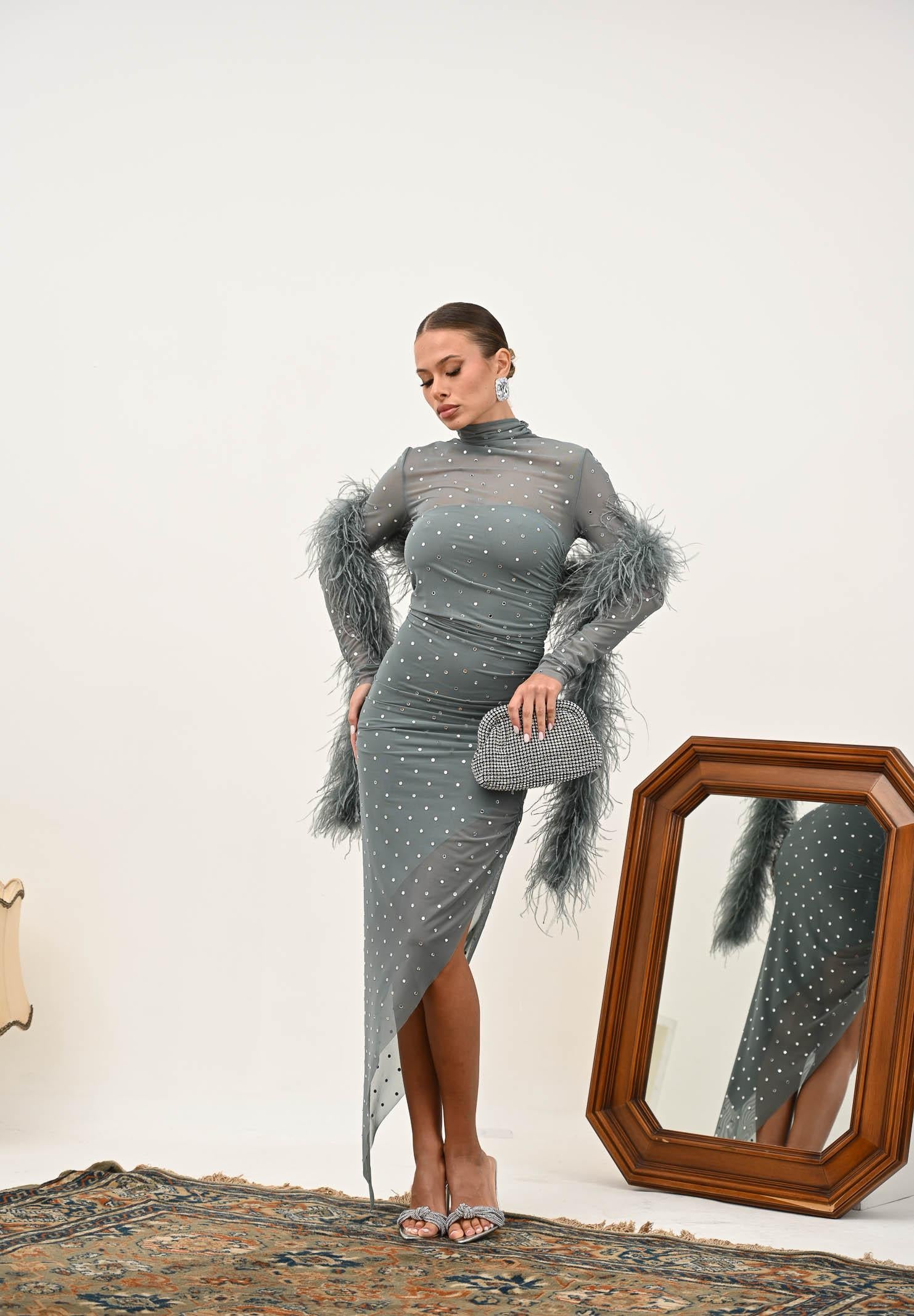 ALMA SANCHEZ Damen Acerno Midikleid aus Zuckerpapier mit Federn und Strasssteinen