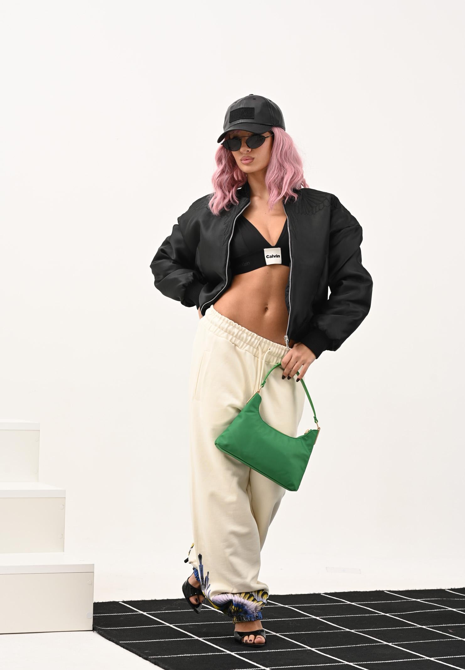 MARCELO BURLON COUNTY OF MILAN Schwarze Bomberjacke für Damen in weicher, leicht übergroßer Passform. Sie ist aus glattem, schwarzem Stoff mit Satin-Finish gefertigt und verfügt über elastische Rippbündchen an Bündchen, Saum und Kragen für Komfort und eine gute Passform. Der Frontverschluss besteht aus einem sichtbaren Metallreißverschluss, der dem Design ein markantes Detail verleiht. Ton-in-Ton-Flügelstickereien stechen auf der Brust und entlang der Schultern hervor und verleihen dem Kleidungsstück Originalität und Charakter. Mit seitlichen Leistentaschen ist sie ein vielseitiges und auffälliges Stück, perfekt, um lässige und Streetwear-Looks mit einem kräftigen Hauch von Stil zu vervollständigen. Das Model trägt Größe S und ist 170 cm groß. Wäsche bei mittlerer Temperatur empfohlen. Herbst/Winter.