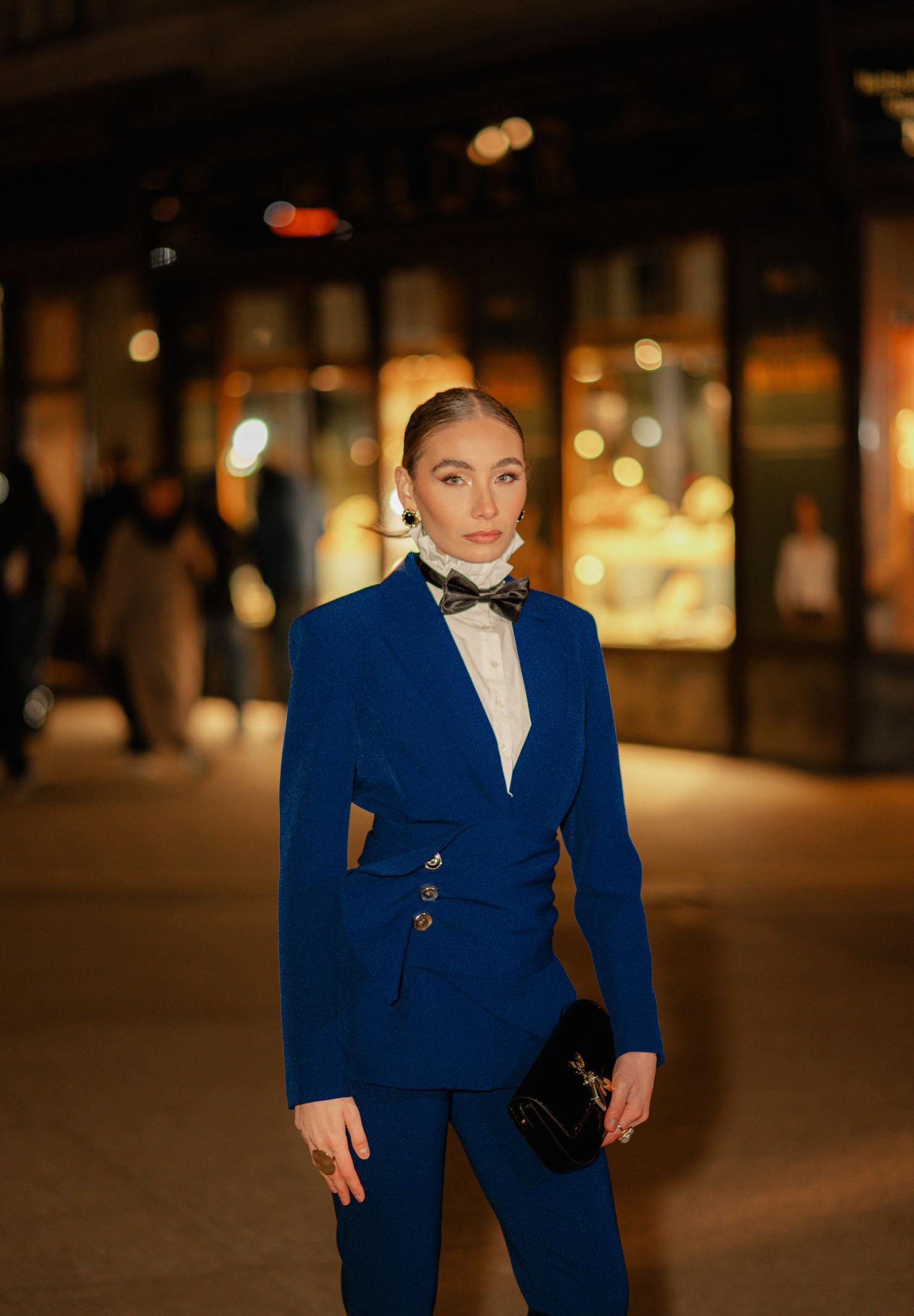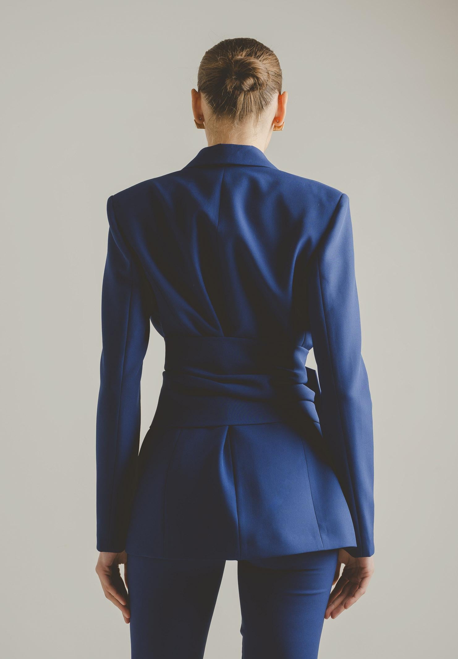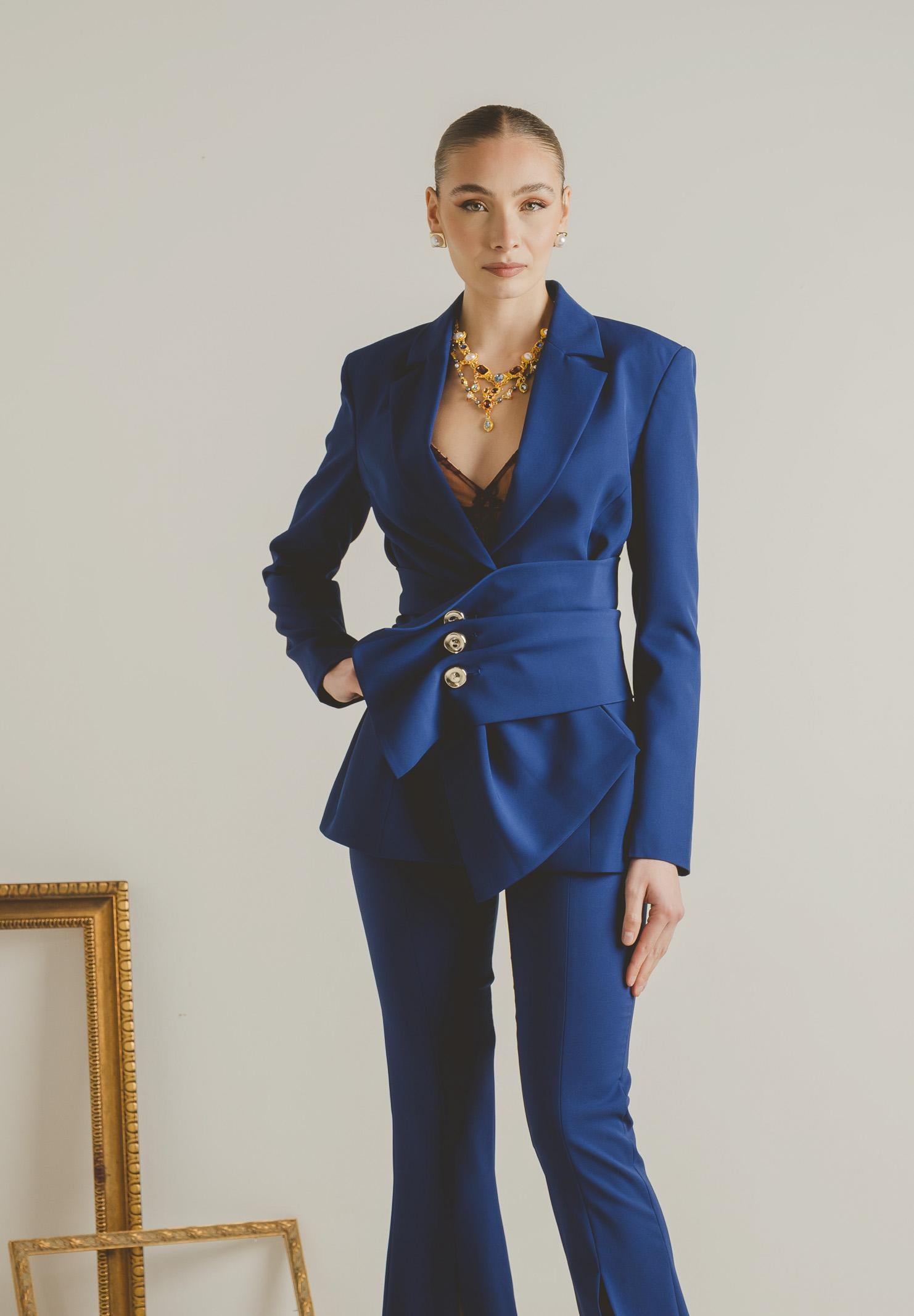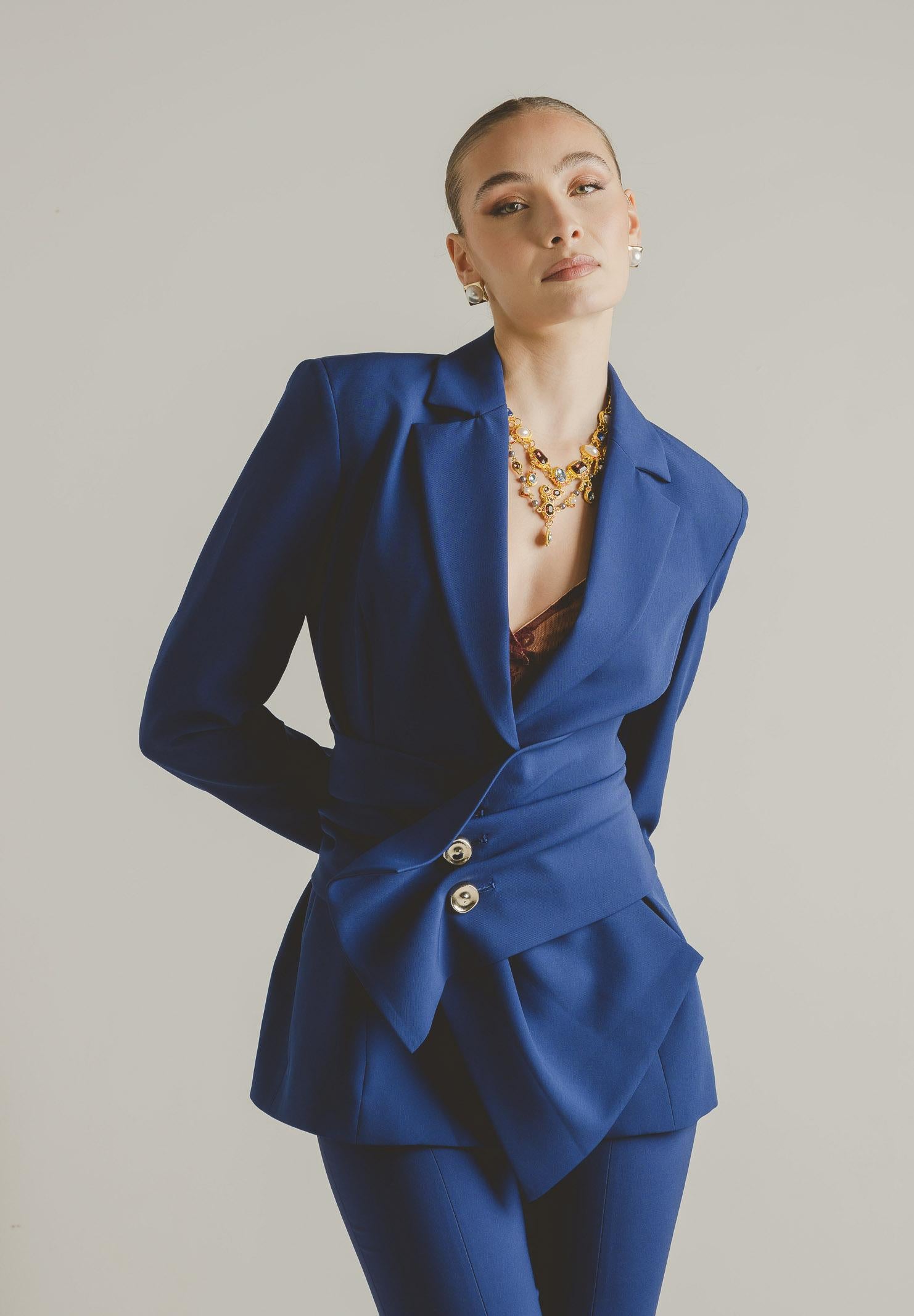 Die quarzblaue Damenjacke von SANTAS ALLURE besticht durch klare Linien und eine feminine Passform, die die Silhouette harmonisch umspielt. Sie zeichnet sich durch ein Revers, betonte Schultern und einen langen, figurschmeichelnden Schnitt aus. Der kompakte Stoff ist formbeständig und verleiht der Jacke einen eleganten Look, der sowohl zu formellen als auch zu legeren Outfits passt. Ein besonderes Detail ist der Taillenbund, der mit drei Metallknöpfen verziert ist und der Jacke eine edle, skulpturale Note verleiht. Dieser Bund ist vollständig abnehmbar, sodass die Jacke je nach Anlass individuell gestaltet werden kann. Ohne Bund wirkt die Jacke minimalistisch und geradlinig; mit Bund hingegen wird die Taille betont und ein coutureartiger, umhüllender Effekt erzielt. Das Model trägt Größe 40 und ist 170 cm groß. Wir empfehlen, die Jacke bei mittlerer Hitze zu waschen und zu bügeln. Herbst-/Wintersaison.
