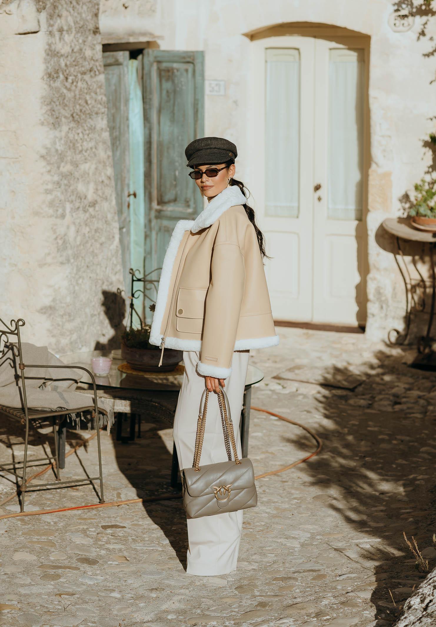 Beiger Damen-Shearling-Mantel von ARMANI EXCHANGE. Aus Kunstleder mit kontrastierendem, weichem Pelzfutter in Shearling-Optik. Der hohe Kragen mit Schnallenriemen schützt optimal vor Kälte. Der Metallreißverschluss vorne verleiht dem Mantel einen modernen und praktischen Touch, während die Pattentaschen mit Druckknöpfen Funktionalität und Charakter verleihen. Die weißen Pelzdetails an Bündchen, Saum und Krageninnenseite betonen den kuscheligen und edlen Effekt. Die leicht übergroße Passform macht ihn perfekt zum Kombinieren mit Pullovern oder für strukturiertere Looks. Ein Hingucker, ideal zum Abrunden von lässig-schicken Outfits an kälteren Tagen. Das Model trägt Größe S und ist 170 cm groß. Herbst/Winter.