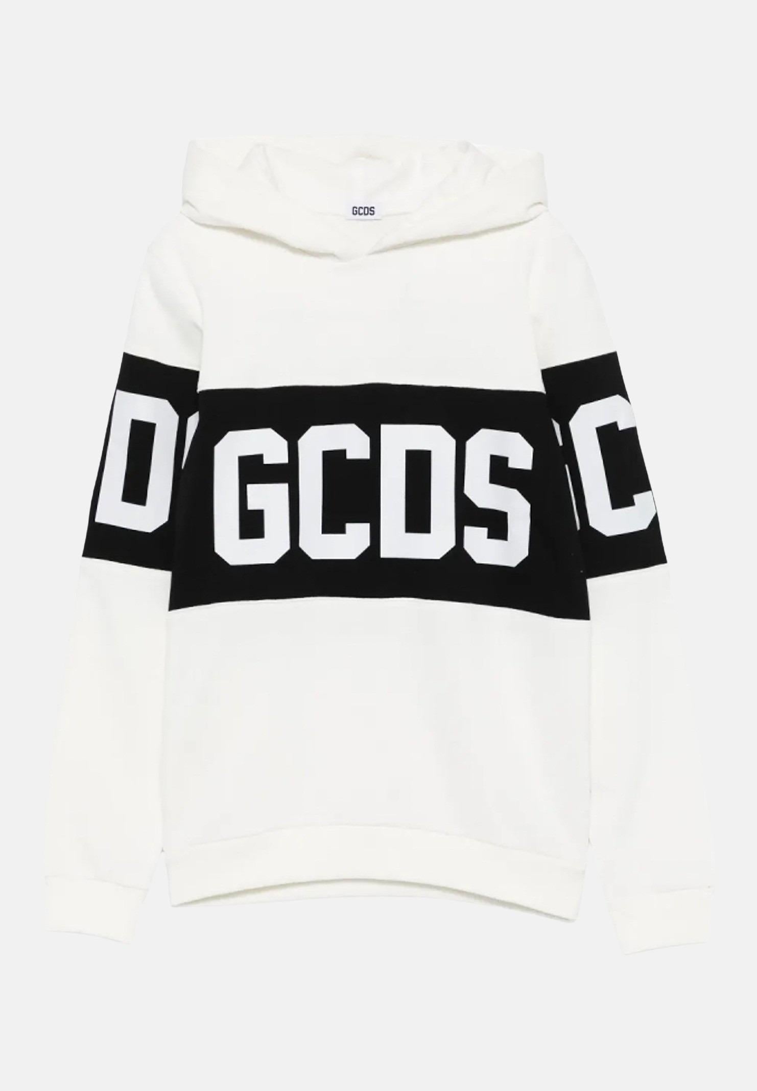 Weißer GCDS Hoodie für Jungen und Mädchen. Aus weicher Baumwolle gefertigt, verfügt er über ein breites, kontrastierendes schwarzes Band, das horizontal über Brust und Ärmel verläuft und das markante GCDS-Logo trägt. Das klare, moderne Design und die bequeme Passform machen ihn zur perfekten Ergänzung für lässige und urbane Outfits. Ein vielseitiges und trendiges Kleidungsstück, ideal zu Jeans, Jogginghosen oder unter einer Jacke für einen auffälligen Look. Wir empfehlen Waschen und Bügeln bei mittlerer Temperatur. Geeignet für Herbst/Winter.