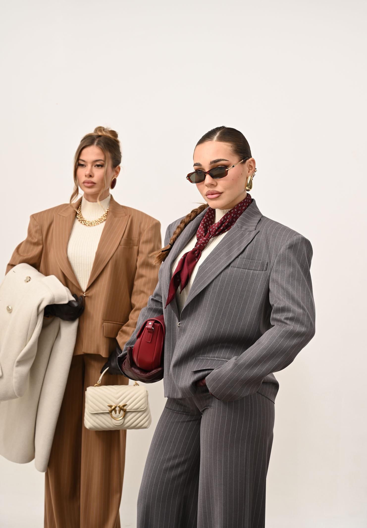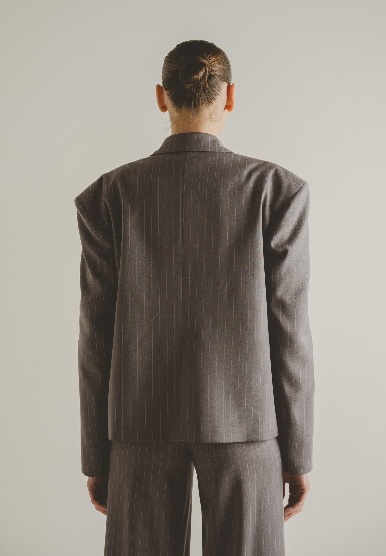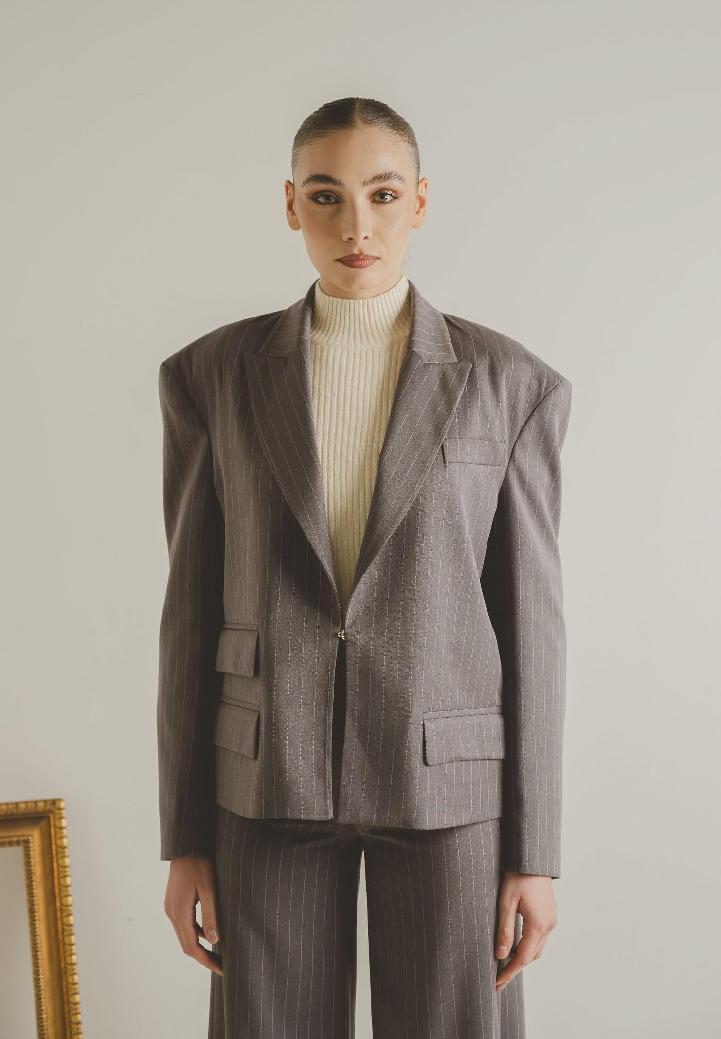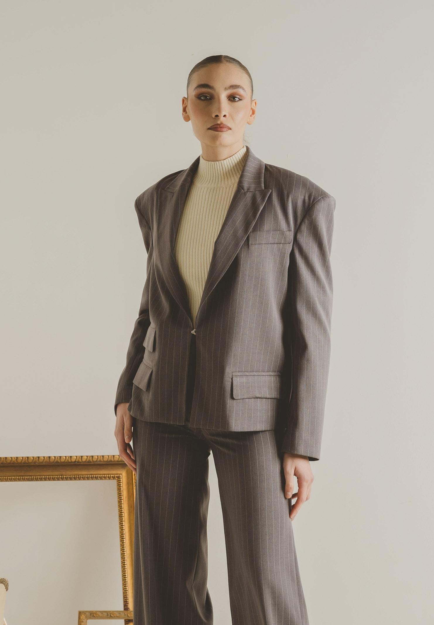 Graue Damenjacke von SANTAS OMBRE. Diese moderne, taillierte Jacke ist aus einem edlen burgunderroten Stoff mit feinen, vertikalen Streifen gefertigt, die die Figur schlanker wirken lassen und ihr eine elegante, zeitgemäße Note verleihen. Sie besticht durch ein fallendes Revers, eine strukturierte, aber dennoch weiche Schulterpartie, die für ein modernes Volumen sorgt, und einen einzelnen goldenen Knopfverschluss, der dem Kleidungsstück ein subtiles, aber raffiniertes Detail verleiht. Die aufwendig gestalteten Pattentaschen setzen charaktervolle Akzente und verleihen der Jacke einen Hauch von Haute Couture. Der leicht oversized Schnitt macht die Jacke vielseitig und sowohl für formelle als auch für modischere Looks geeignet – und sorgt dabei stets für einen eleganten und unverwechselbaren Charme. Das Model trägt Größe 40 und ist 170 cm groß. Wir empfehlen, die Jacke bei mittlerer Hitze zu waschen und zu bügeln. Herbst-/Wintersaison.