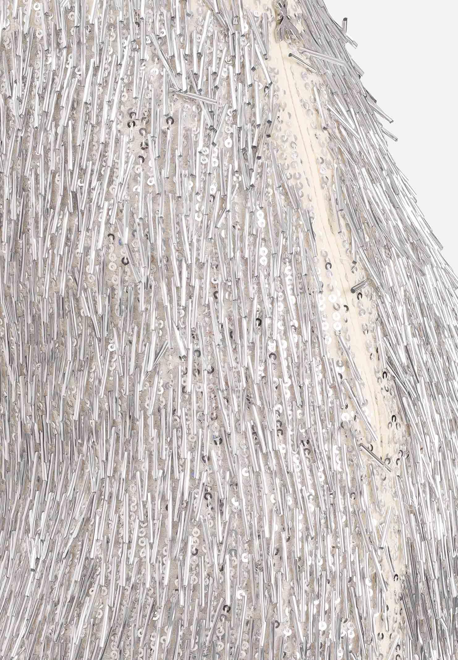 Silberner Midirock von PATRIZIA PEPE für Damen, komplett mit glänzenden Fransen besetzt, die bei jeder Bewegung einen raffinierten, schimmernden Effekt erzeugen. Der hoch taillierte Schnitt folgt einer geraden, taillierten Linie und betont die Silhouette auf raffinierte Weise. Der Schlitz auf der Rückseite sorgt für Komfort und Bewegungsfreiheit. Perfekt für Abendveranstaltungen oder Partys – dieser Rock ist ein Statement-Piece, das jedem Look Glanz und Glamour verleiht. Das Model trägt Größe 40 und ist 170 cm groß. Herbst/Winter.