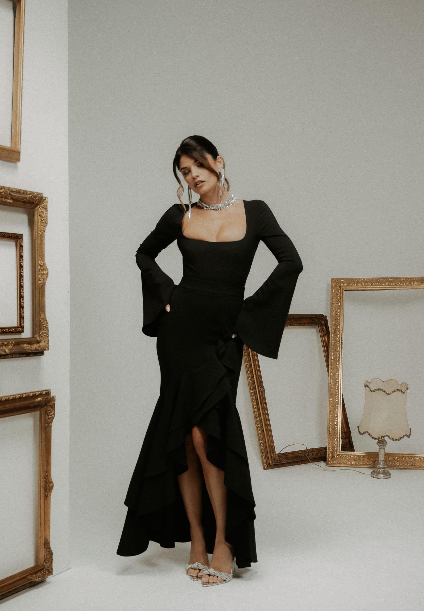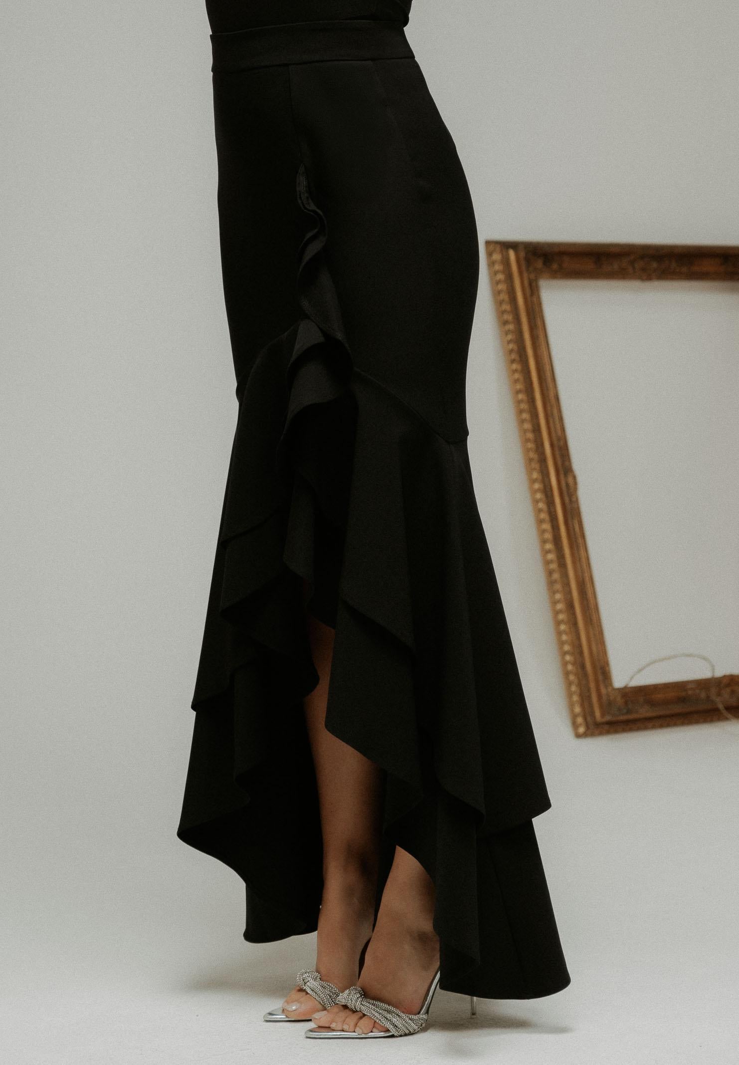 Schwarzer langer Damenrock von SANTAS ÉLAN. Dieser lange Meerjungfrauenrock schmiegt sich an die Figur und betont Taille und Hüften, bevor er sich in eine weiche, asymmetrische Rüsche öffnet, die bei jedem Schritt Bewegung und Leichtigkeit erzeugt. Das überlappende Rüschendesign erzeugt einen dramatischen und romantischen Effekt, perfekt für besondere Anlässe oder elegante Abende. Der kürzere Schnitt vorne zeigt die Beine, streckt die Figur und betont die Schuhe. Der unsichtbare Reißverschluss hinten sorgt für eine makellose und saubere Passform. Das Model trägt Größe 40 und ist 170 cm groß. Wir empfehlen Waschen und Bügeln bei mittlerer Hitze. Herbst/Winter.