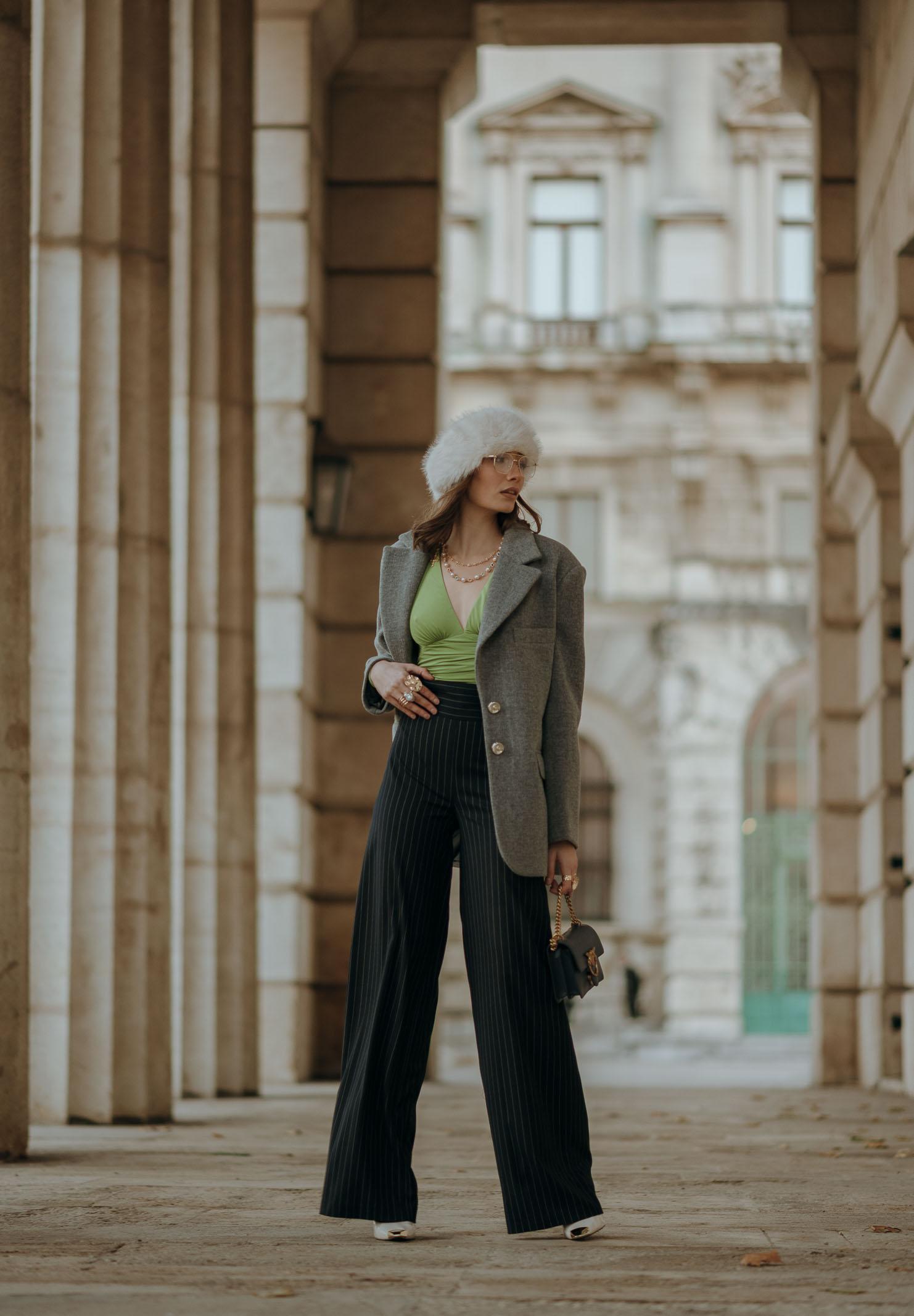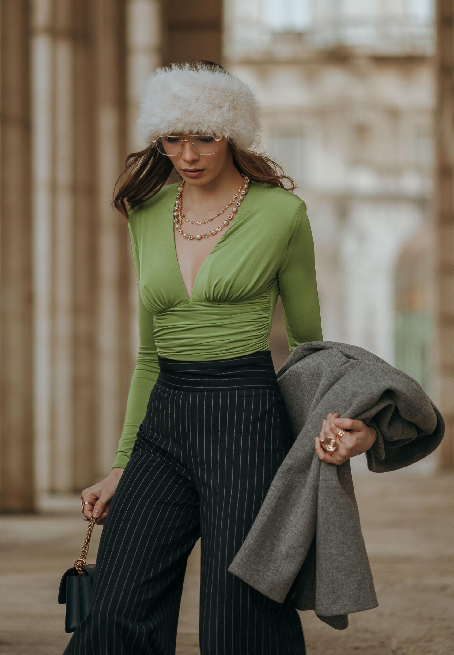Grüner Damenbody von SANTAS DÈSIR mit sinnlichem und raffiniertem Design. Das dehnbare Material schmiegt sich an die Figur und betont sie. Der tiefe V-Ausschnitt mit seitlichen Raffungen sorgt für einen eleganten Drapé-Effekt an der Taille, während der Reißverschluss am Rücken eine perfekte Passform garantiert. Der leuchtende Grünton verleiht dem Body Frische und Modernität und macht ihn ideal zum Kombinieren mit hochgeschnittenen Röcken oder Hosen für einen femininen und trendigen Look. Das Model trägt Größe 40 und ist 170 cm groß. Maschinenwäsche und Bügeln bei mittlerer Hitze werden empfohlen. Herbst-/Wintersaison.