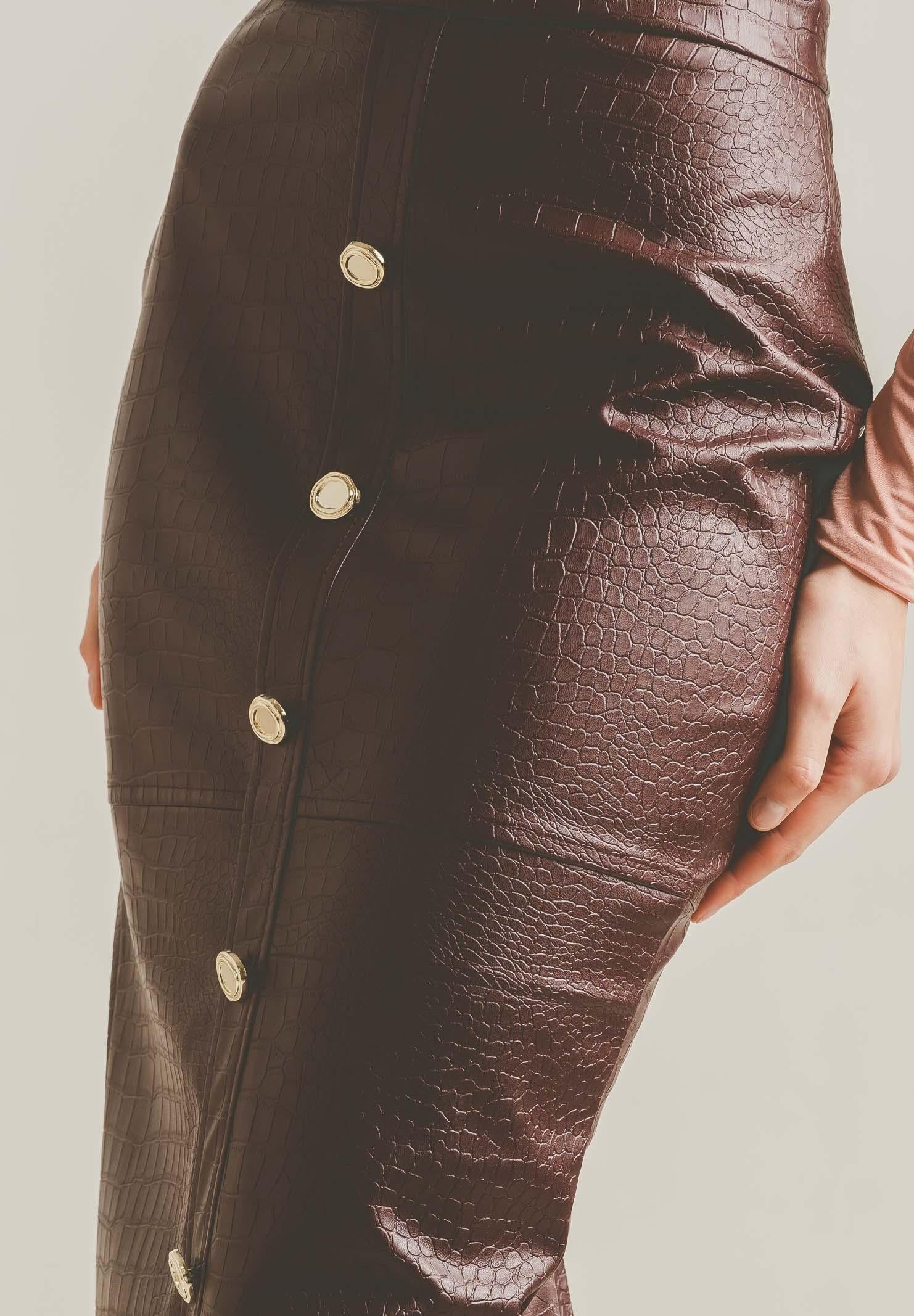 Der bordeauxrote Midirock BELLE ÉTOILE von SANTAS aus Kunstleder mit Krokodilprägung schmeichelt der Figur. Er verfügt über einen Metallknopfverschluss vorne und einen Schlitz hinten für optimale Bewegungsfreiheit. Die dunkelbraune Farbe und die glänzende Textur verleihen ihm einen eleganten und ausdrucksstarken Look. Er lässt sich perfekt mit Blusen oder Bodys kombinieren und sorgt so für einen selbstbewussten, femininen Auftritt – ideal für Tag und Nacht. Das Model trägt Größe 40 und ist 170 cm groß. Handwäsche und Bügeln bei mittlerer Temperatur werden empfohlen. Herbst-/Wintersaison.