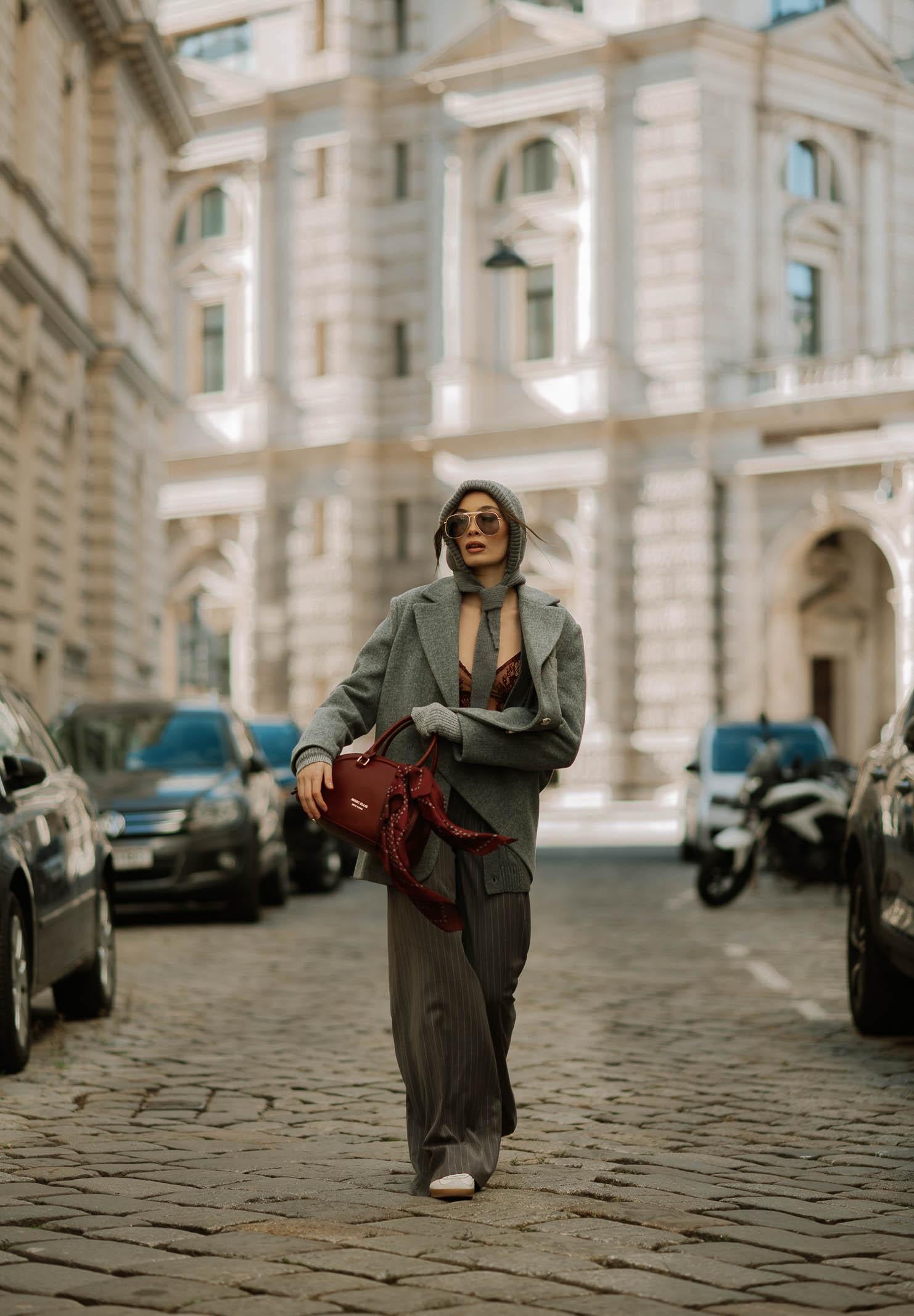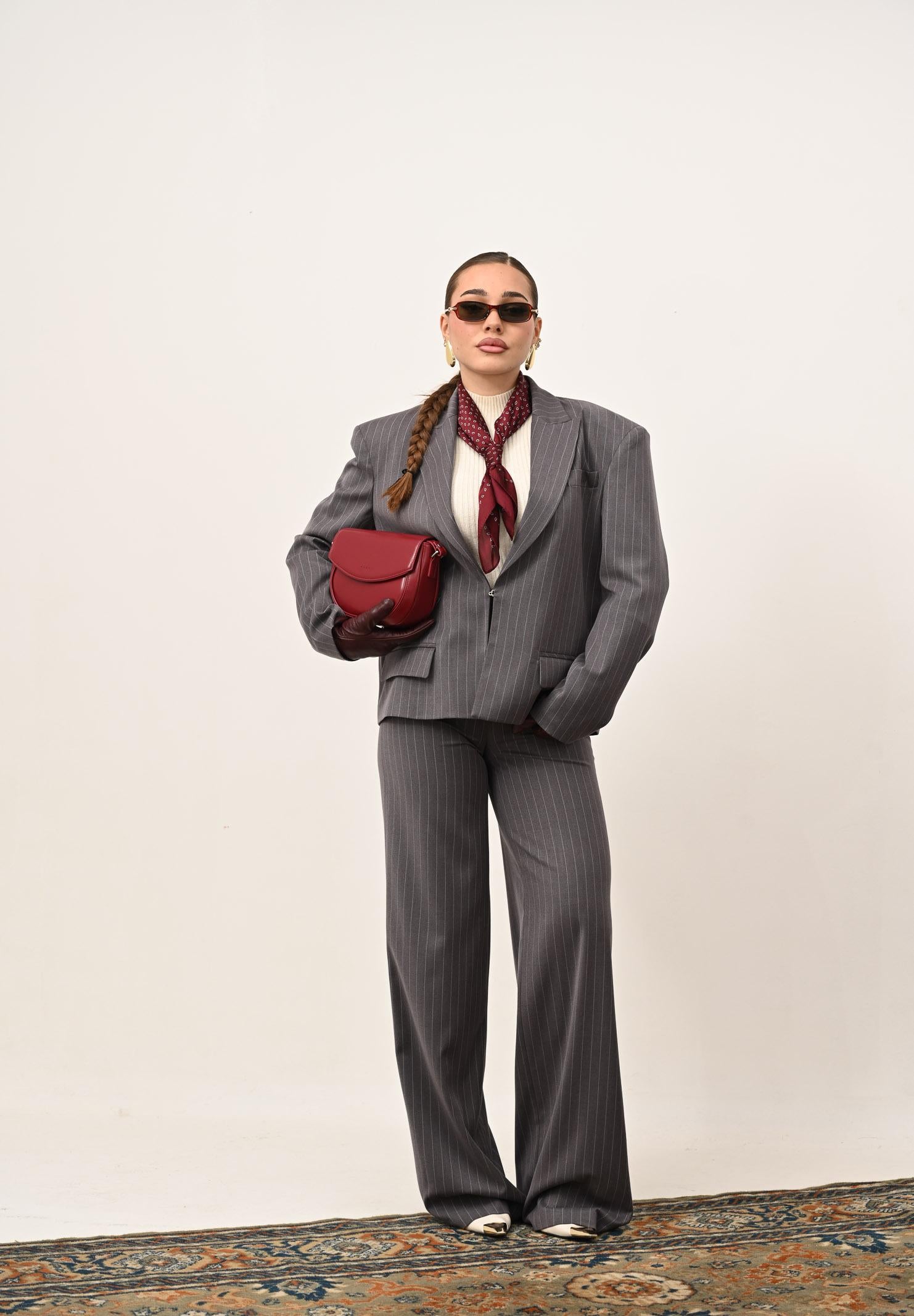 Elegante Damenhose von SANTAS POUVOIR in Grau mit feinen, vertikalen Nadelstreifen. Die Hose besticht durch ihre weite, schlanke Silhouette, die die Figur optisch streckt und zeitlose Eleganz verleiht. Der hohe, strukturierte Bund betont die Taille und definiert die Silhouette präzise, ​​während der verdeckte Reißverschluss hinten für einen cleanen, raffinierten Look sorgt. Der gerade Schnitt und das weite Palazzo-Bein erzeugen eine natürliche, leichte Bewegung und machen die Hose perfekt für elegante Tages-Looks und schicke Abendoutfits. Das Model trägt Größe 40 und ist 170 cm groß. Wir empfehlen, die Hose bei mittlerer Hitze zu waschen und zu bügeln. Herbst-/Wintersaison.