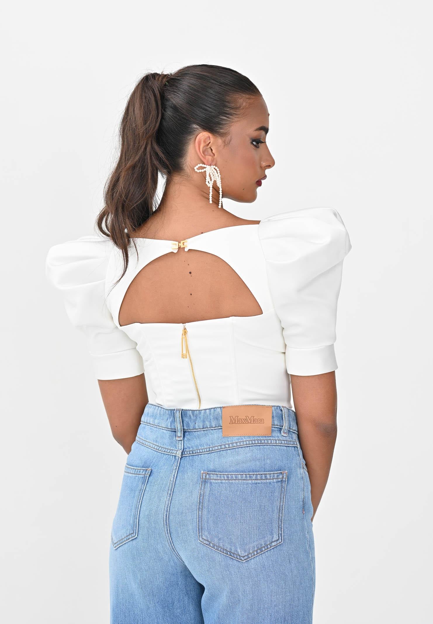 ELISABETTA FRANCHI Elfenbeinfarbenes Damenmieder aus Crêpe und Duchesse. Es besticht durch die weiten Ballonärmel, deren Falten ein markantes Volumen erzeugen. Die vom Bustier inspirierten, konturierten Schnitte verleihen den Körbchen und Hüften Struktur. Figurbetonte Passform. Das Model trägt Größe 40 und ist 170 cm groß. Bügeln bei mittlerer Temperatur wird empfohlen. Herbst/Winter.