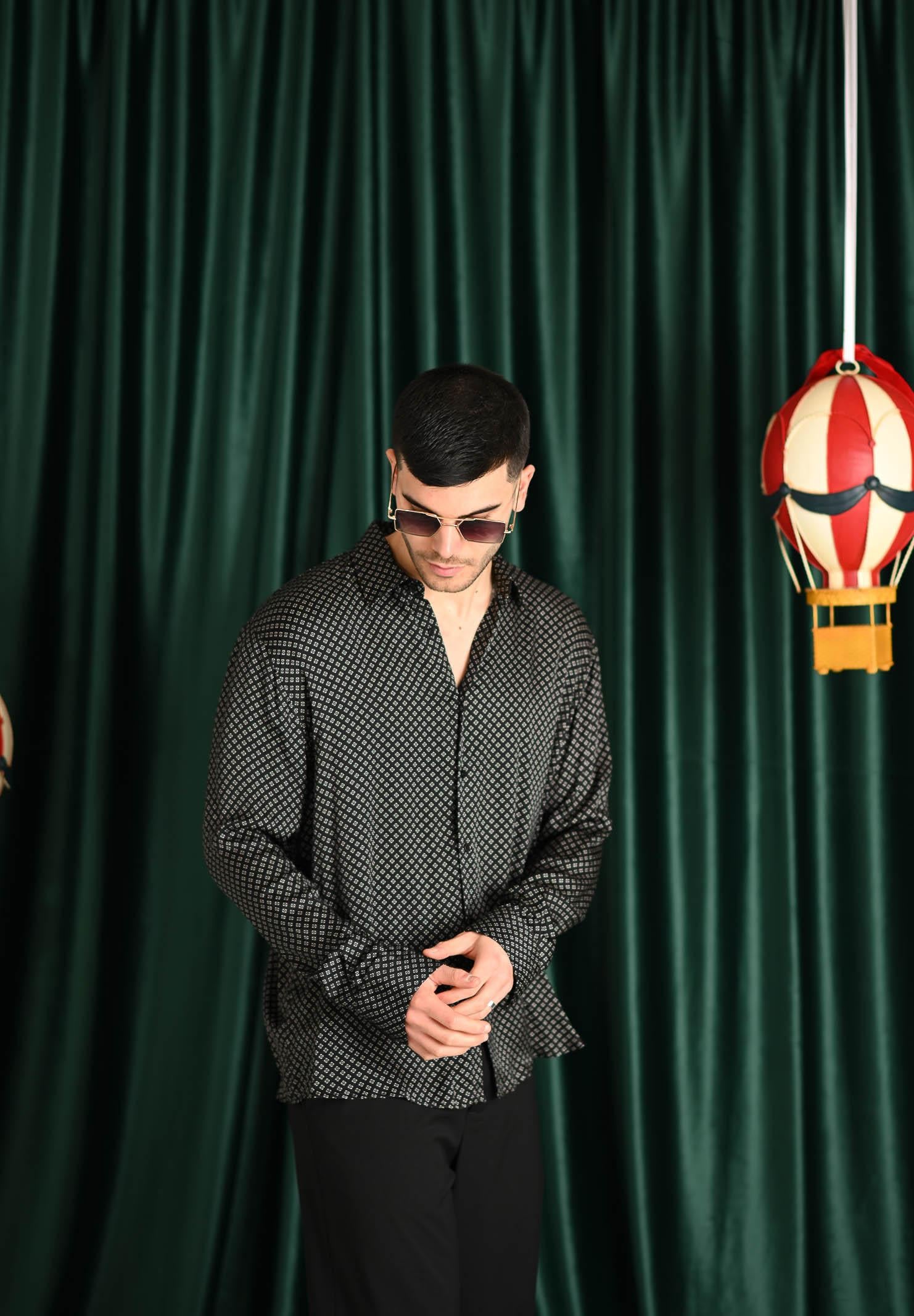 I'M BRIAN Herren-Langarmhemd in Schwarz. Dieses Hemd besticht durch seinen eleganten und modernen Stil. Es ist aus leichtem, fließendem Stoff gefertigt und ziert ein geometrisches Mikromuster aus kleinen weißen Quadraten, die gleichmäßig über die gesamte Oberfläche verteilt sind. Der klassische Schnitt mit spitzem Kragen, Knopfverschluss vorne und langen Ärmeln mit Manschetten ist ideal für alle, die einen eleganten und dennoch bequemen Look suchen. Perfekt zu einer Anzughose für ein elegantes Outfit oder zu Jeans und Sneakers für einen lässigeren und dennoch raffinierten Look. Ein vielseitiges Kleidungsstück, das auch abends Charakter verleiht. Das Model trägt Größe L und ist 190 cm groß. Wir empfehlen Waschen und Bügeln bei mittlerer Temperatur. Herbst/Winter.