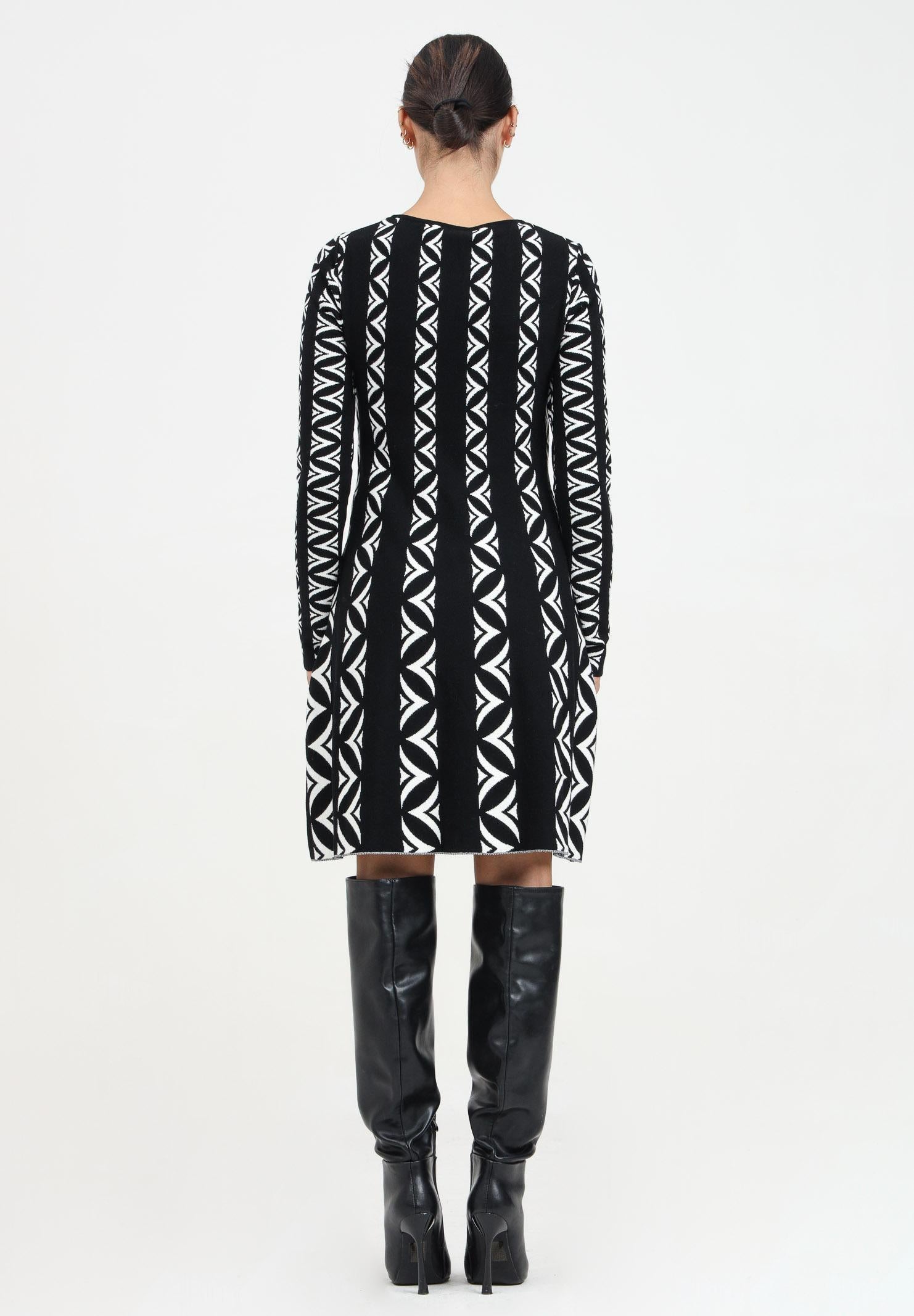 Schwarzes kurzes Damenkleid mit gestreiftem und geometrischem Muster