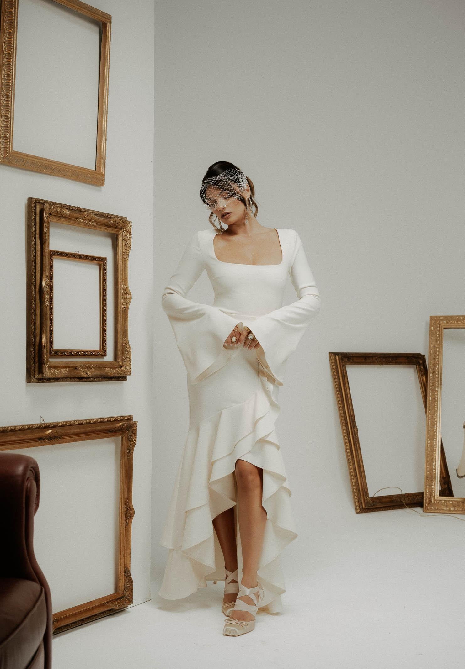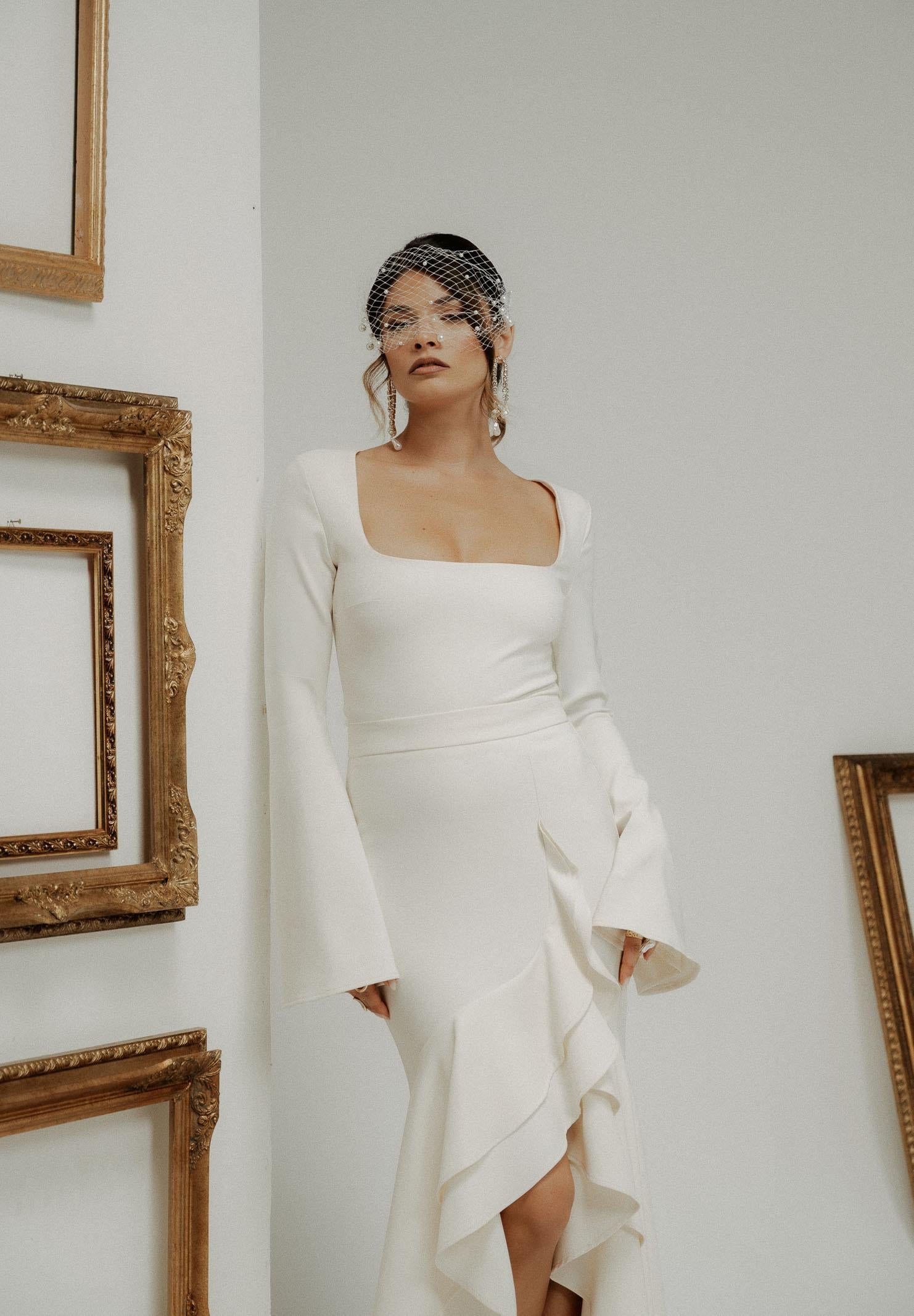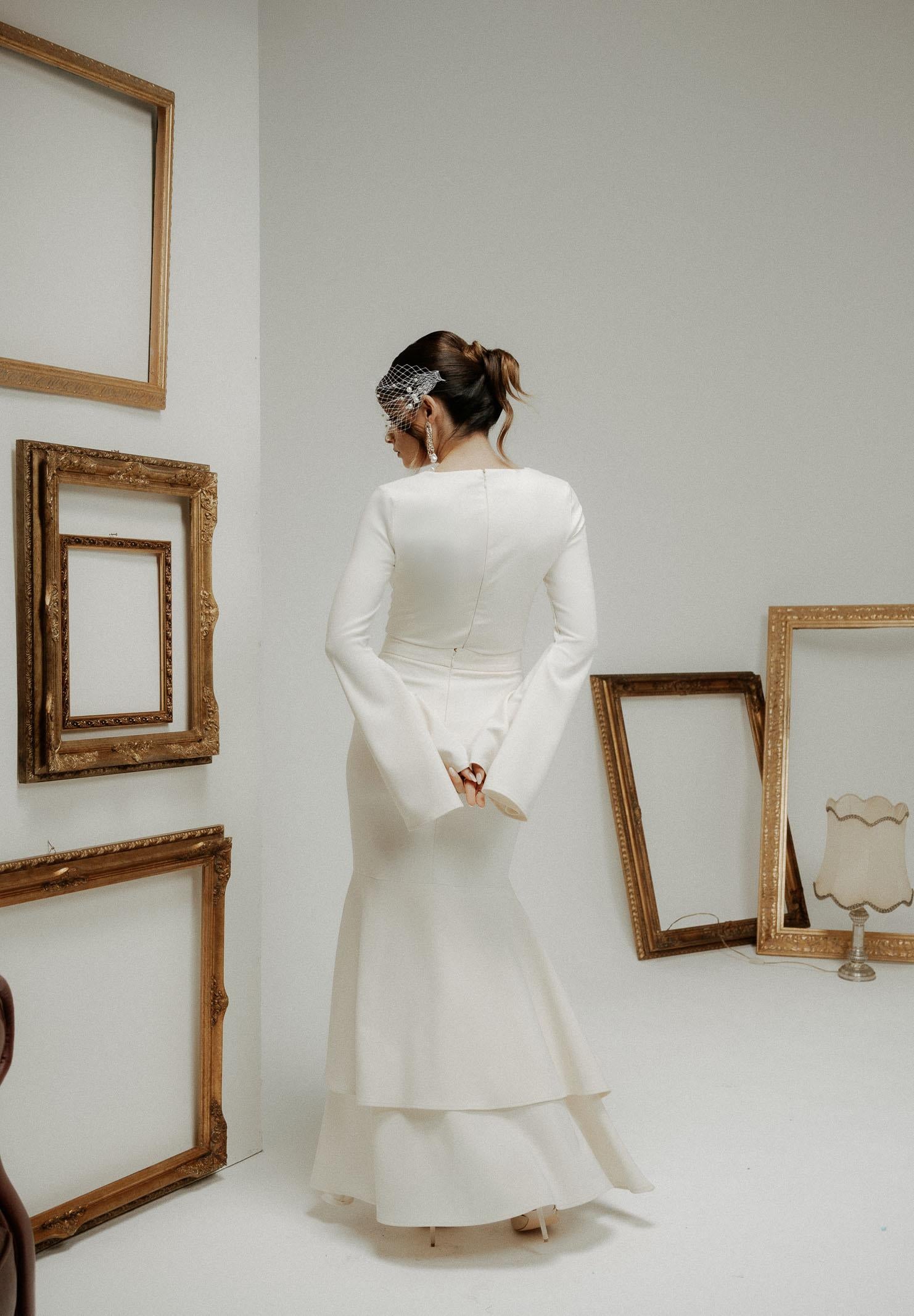 Cremefarbener Langarm-Bodysuit für Damen von SANTAS FIERTÉ. Dieser Bodysuit besticht durch seinen tiefen, quadratischen Ausschnitt, der das Dekolleté zart umrahmt und ihm eine sinnliche und raffinierte Note verleiht. Die ausgestellten Ärmel mit glockenförmiger Öffnung verleihen dem schlichten Schnitt einen modernen Touch und verleihen ihm einen Hauch von Charakter. Der leicht formende Stoff sorgt für eine enganliegende und dennoch bequeme Passform, perfekt zu hoch taillierten Röcken oder Hosen für elegante oder formelle Looks. Das Model trägt Größe 40 und ist 170 cm groß. Wir empfehlen Waschen und Bügeln bei mittlerer Temperatur. Herbst/Winter.