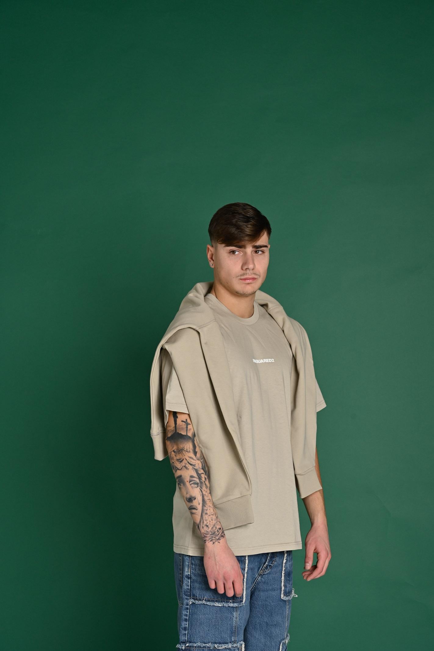 Beiges Kurzarm-T-Shirt von DSQUARED2 mit schwarzem DSQUARED2-Logoaufdruck auf der Brust. Das schlichte und minimalistische Design ist ideal für einen lässigen und modernen Look. Mit seiner geraden Passform und den kurzen Ärmeln passt dieses T-Shirt perfekt zu jedem legeren Outfit und bietet einen Hauch von Stil ohne Kompromisse. Ein vielseitiges Stück, das Kindern, Teenagern und Frauen perfekt passt und bequem bis Größe 44 sitzt. Die Frau trägt Größe 16 Jahre (175 cm), das Mädchen trägt Größe 12 Jahre (156 cm) und der Junge trägt Größe 10 Jahre (144 cm). Wir empfehlen Waschen und Bügeln bei mittlerer Temperatur. Frühlings- und Sommersaison.