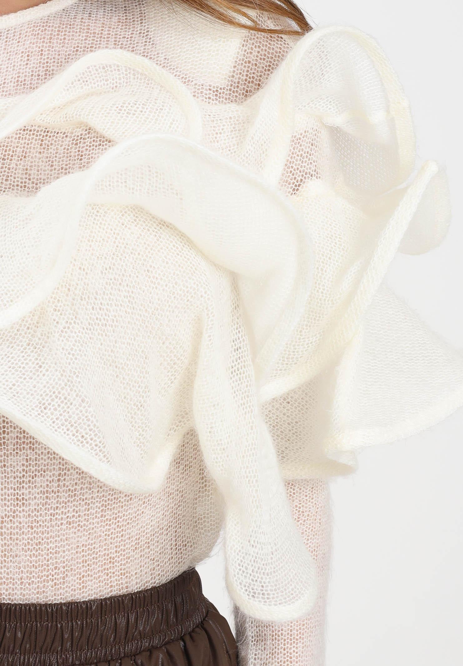 TPN Waldron Rundhalspullover für Damen in Creme. Dieser weiße Pullover ist ein elegantes und eindrucksvolles Kleidungsstück, perfekt für alle, die gerne mit einem anspruchsvollen und modernen Stil auffallen. Gefertigt aus leichtem, transparentem Garn umhüllt er die Figur dank seiner engen Passform und der weichen, luftigen Textur zart. Das Schlüsseldetail sind die breiten, gewellten Rüschen, die den oberen Teil des Kleidungsstücks zieren und einen optisch auffälligen, dreidimensionalen Effekt erzeugen. Lange Ärmel und ein unsichtbarer Reißverschluss auf der Rückseite runden das raffinierte Design ab. Ideal für besondere Anlässe oder schicke Abendlooks, versprüht dieser Pullover einen romantischen und künstlerischen Reiz und lässt sich perfekt mit eleganten Hosen oder Midiröcken für ein trendiges und auffälliges Outfit kombinieren. Das Model trägt Größe S und ist 170 cm groß. Handwäsche und mittlere Bügeltemperatur werden empfohlen. Herbst/Winter.