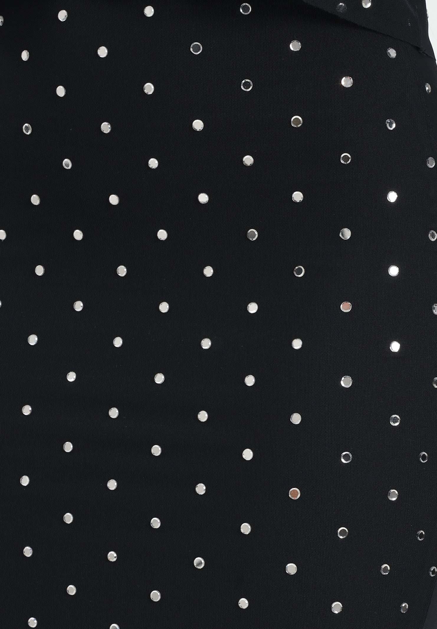 ALMA SANCHEZ Women's black Gapi midi skirt, entirely covered in micro, sparkling rhinestone-effect appliques that add sparkle and movement. The fitted silhouette enhances the figure, while the midi length makes it sophisticated and elegant. Perfect for special evenings or events where you want a refined look with a touch of dramatic sparkle. The model is wearing a size 40 and is 170 cm tall. Hand wash and medium ironing are recommended. Fall/Winter season.