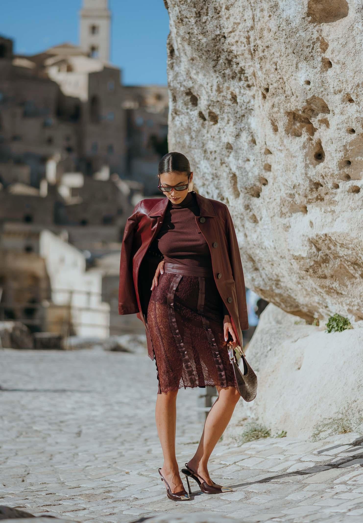 ELISABETTA FRANCHI Women's burgundy midi skirt. It stands out for its rich floral lace, defined by raised inserts such as vertical ribbons that give structure to the garment and create textural contrasts. The logo label on the back waistband completes the look. The model is wearing a size 40 and is 170 cm tall. Medium-heat ironing is recommended. Fall/Winter season.