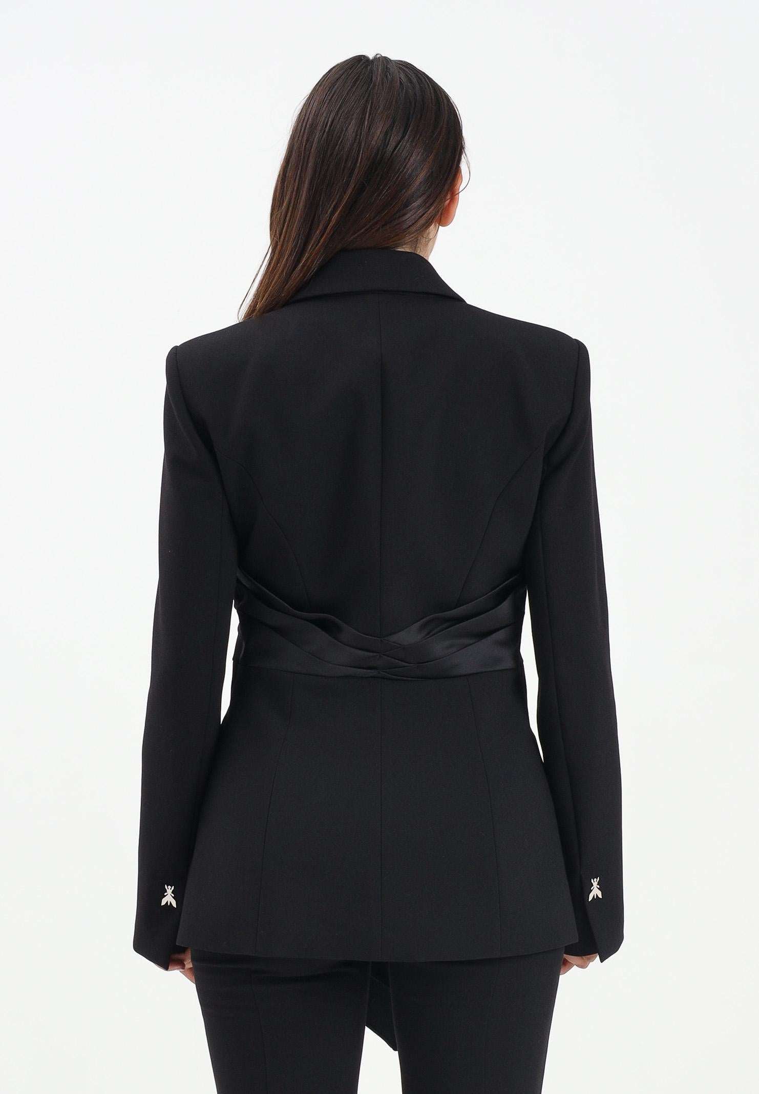 PATRIZIA PEPE Women's black jacket with a double twill weave, which provides a smooth and compact finish. The regular fit is enhanced by the peak lapel collar and the cuff vents embellished with the Fly logo. The distinctive detail is the central knot-effect drape in shiny fabric, which lends a sophisticated and contemporary touch to the design. The model wears a size 42 and is 170 cm tall. Dry cleaning is recommended. Fall/Winter season.