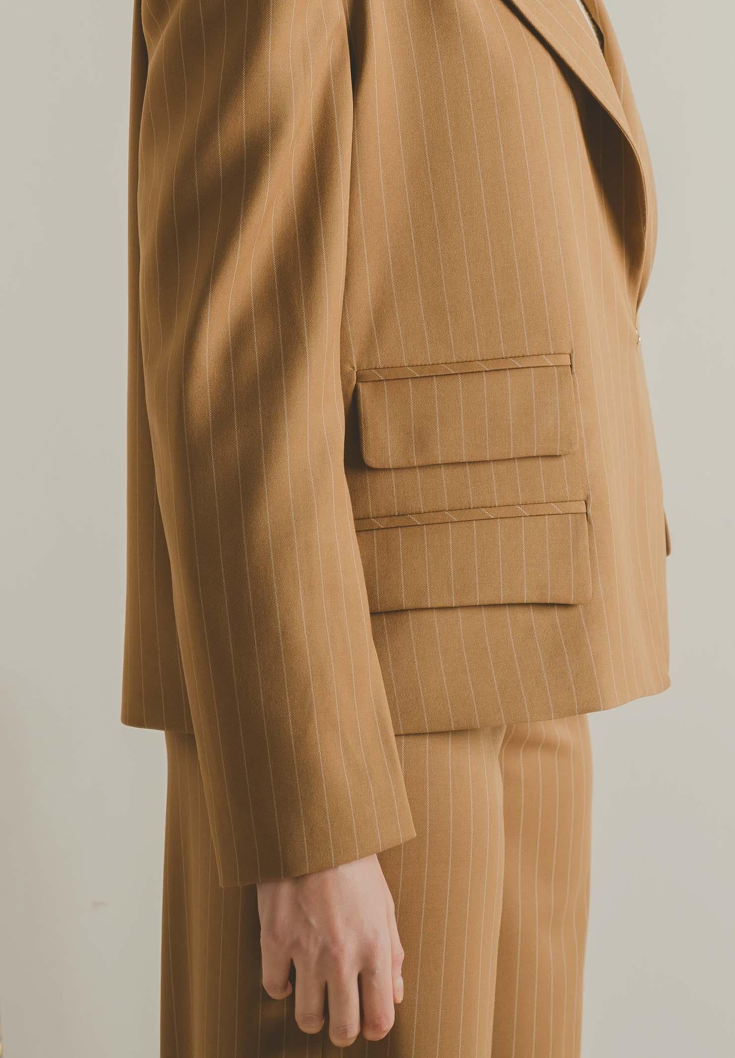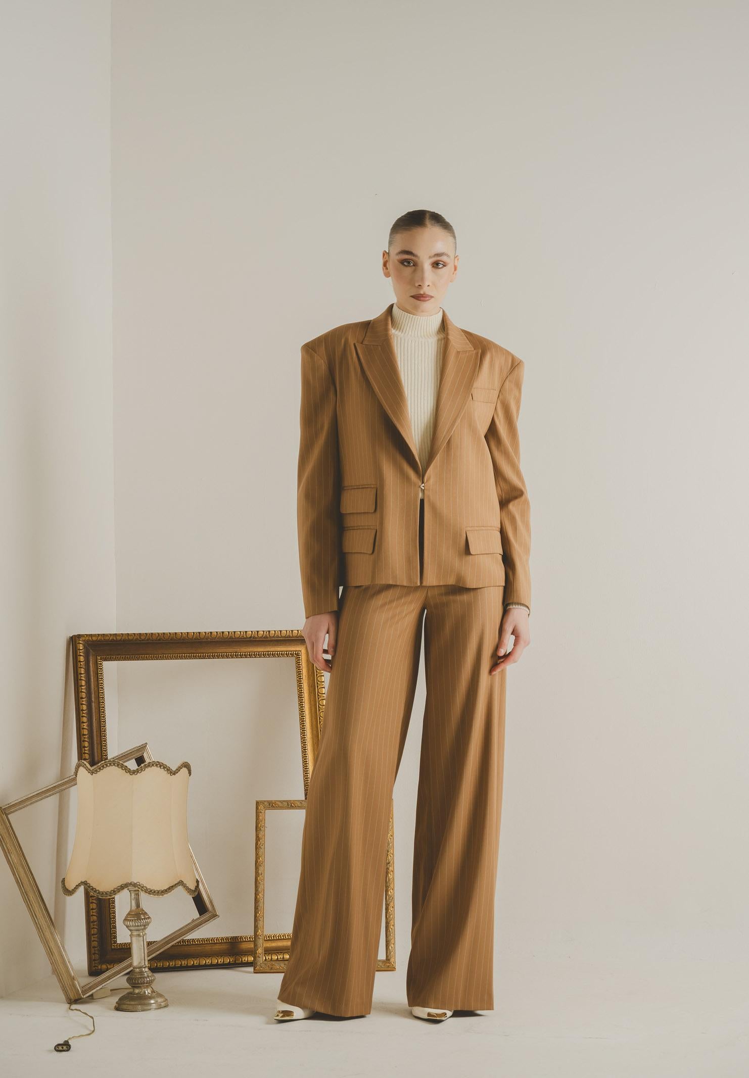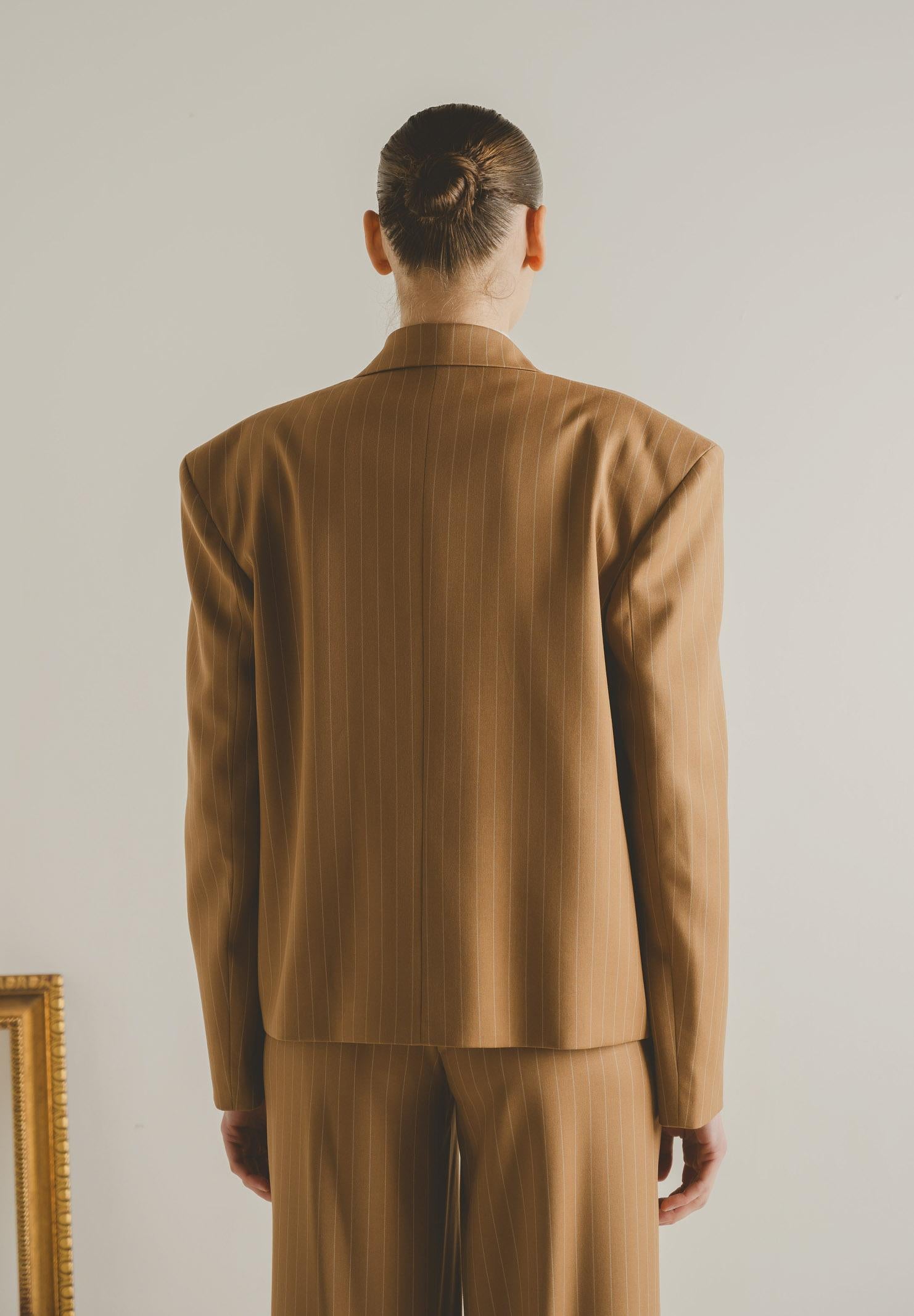 SANTAS OMBRE women's honey jacket. This jacket features a modern, tailored cut, crafted from a refined burgundy fabric with thin vertical stripes that slim the figure and add an elegant, contemporary touch. It features a notched lapel, a structured yet soft shoulder that creates a contemporary volume, and a single gold button front closure that highlights the garment with a discreet yet sophisticated detail. The flap pockets, embellished with a multi-layered construction, add character and a couture touch. The slightly oversized fit makes the jacket versatile and suitable for both formal looks and more fashionable interpretations, always maintaining a sophisticated and distinctive allure. The model wears a size 40 and is 170 cm tall. We recommend washing and ironing at medium heat. Fall/Winter season.
