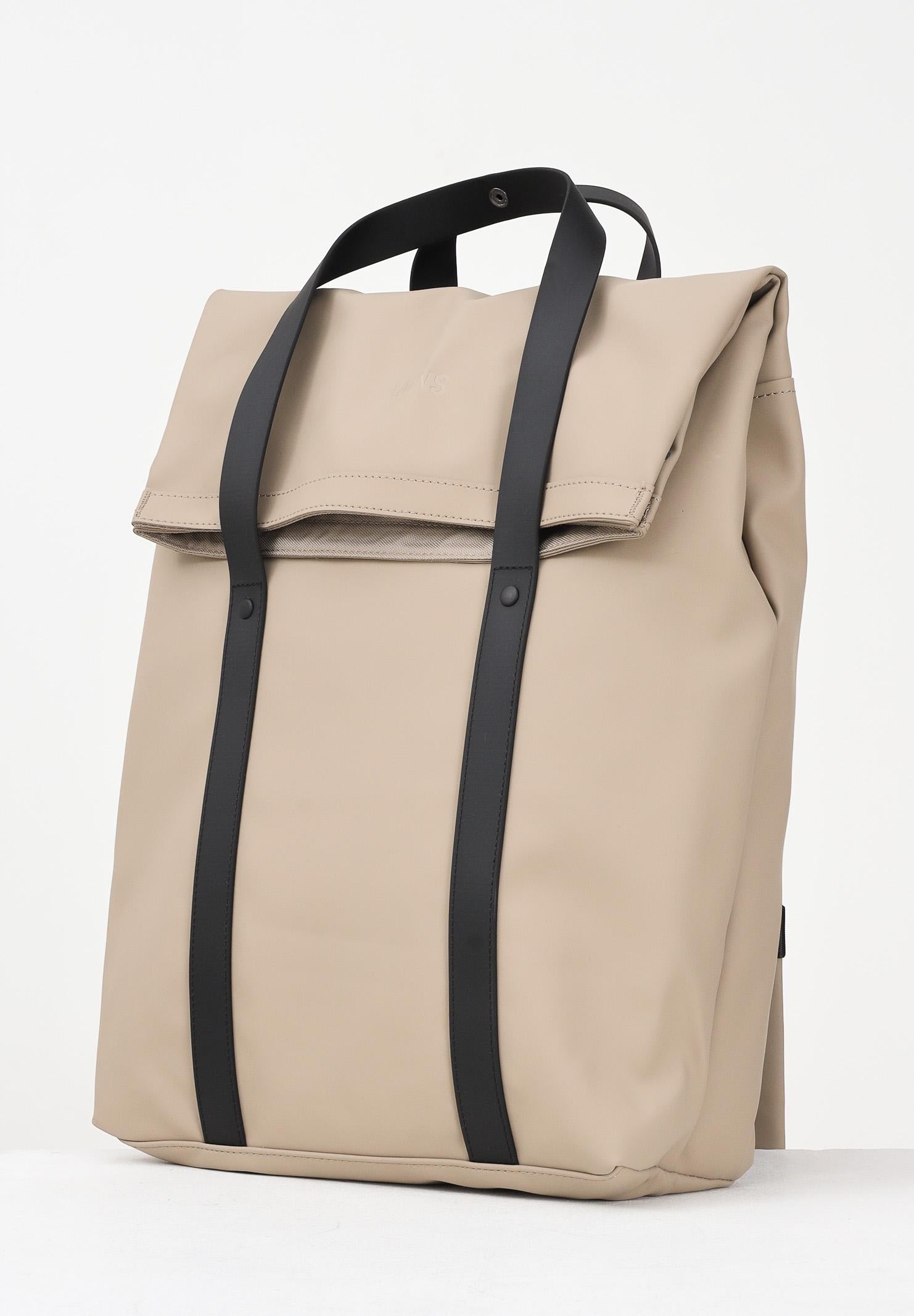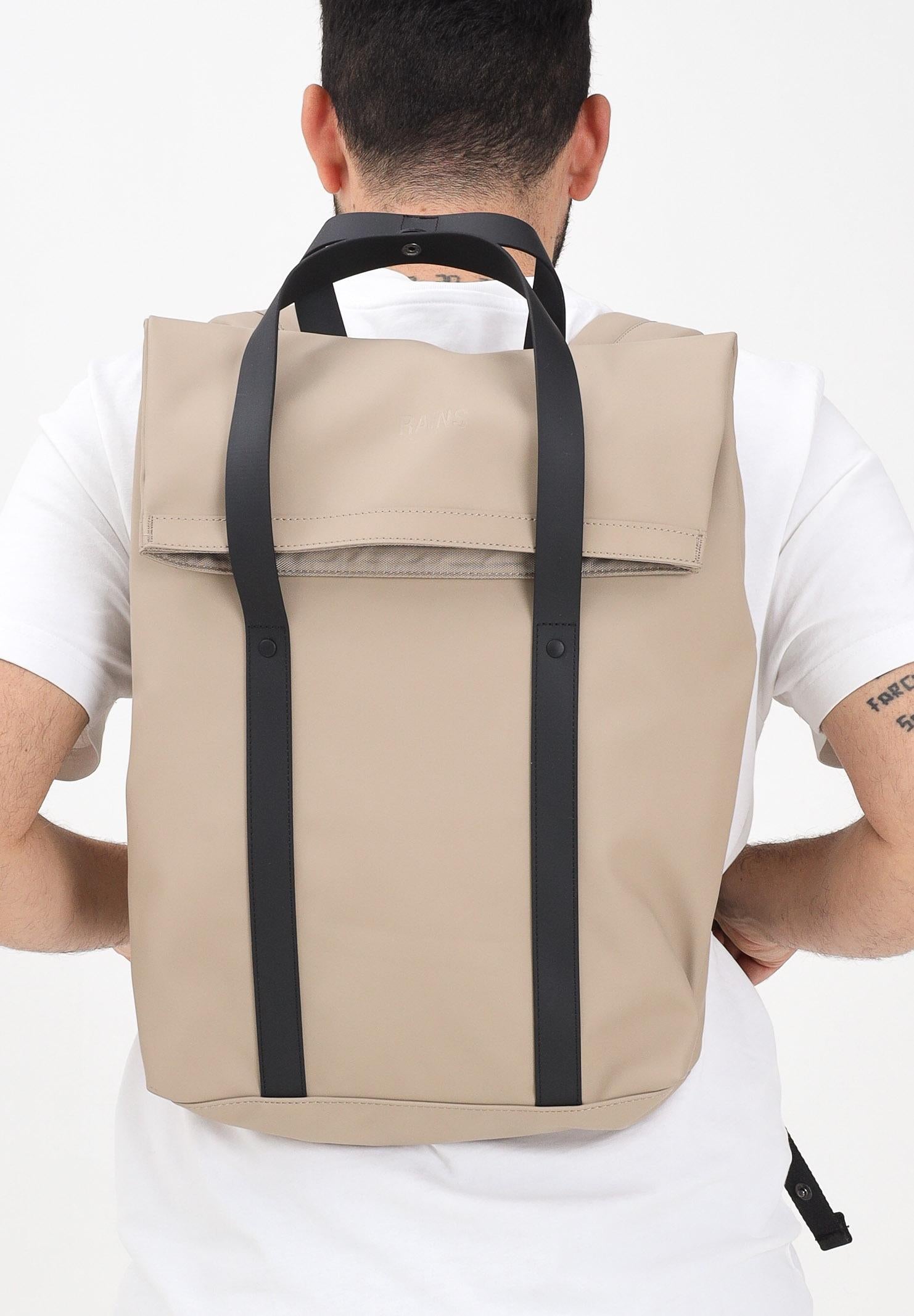 RAINS 2-Way Backpack in beige for men and women. The 2-Way Tote Backpack is a sleek, commuter-friendly bag with a tote-bag aesthetic. The 2-Way Tote Backpack features a fold-over top and TPU shoulder strap details with carry handles. The fold-over opening provides access to the spacious main compartment, featuring multiple pockets and zippered compartments, including a padded 16" laptop sleeve. On the back, there is a quick-access pocket for small essentials like keys and a phone. Wear the 2 Way Tote Backpack as a traditional backpack by adjusting the padded shoulder straps, or as a tote bag using the handles. Carabiner clips on the straps secure excess length when carrying the bag as a tote bag. The 2 Way Tote Backpack is made from Rains' iconic PU fabric for strength, durability, and a soft feel. Dimensions: 42 cm x 12 cm x 31 cm. Capacity: 15 L. Fall/Winter season.