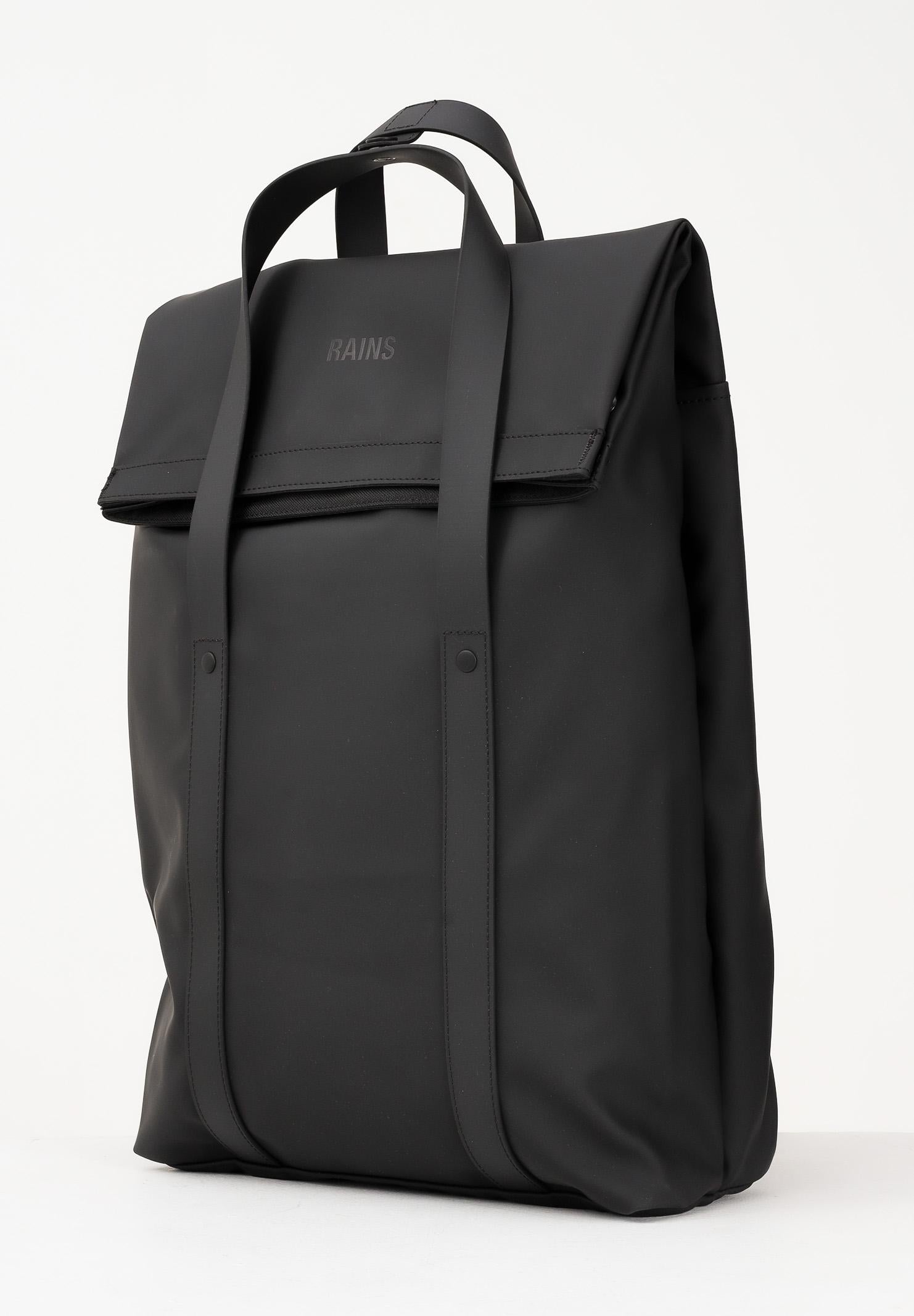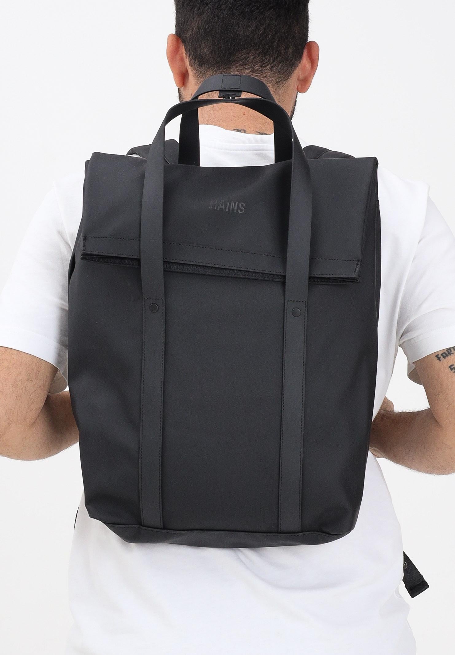 RAINS 2-Way Backpack in black for men and women. The 2-Way Tote Backpack is a sleek, commuter-friendly bag with a tote-style aesthetic. The 2-Way Tote Backpack features a fold-over top and TPU shoulder strap details with carry handles. The fold-over opening provides access to the spacious main compartment, featuring multiple pockets and zippered compartments, including a padded 16" laptop sleeve. On the back, there is a quick-access pocket for small essentials like keys and a phone. Wear the 2 Way Tote Backpack as a traditional backpack by adjusting the padded shoulder straps, or as a tote bag using the handles. Carabiner clips on the straps secure excess length when carrying the bag as a tote bag. The 2 Way Tote Backpack is made from Rains' iconic PU fabric for strength, durability, and a soft feel. Dimensions: 42 cm x 12 cm x 31 cm. Capacity: 15 L. Fall/Winter season.