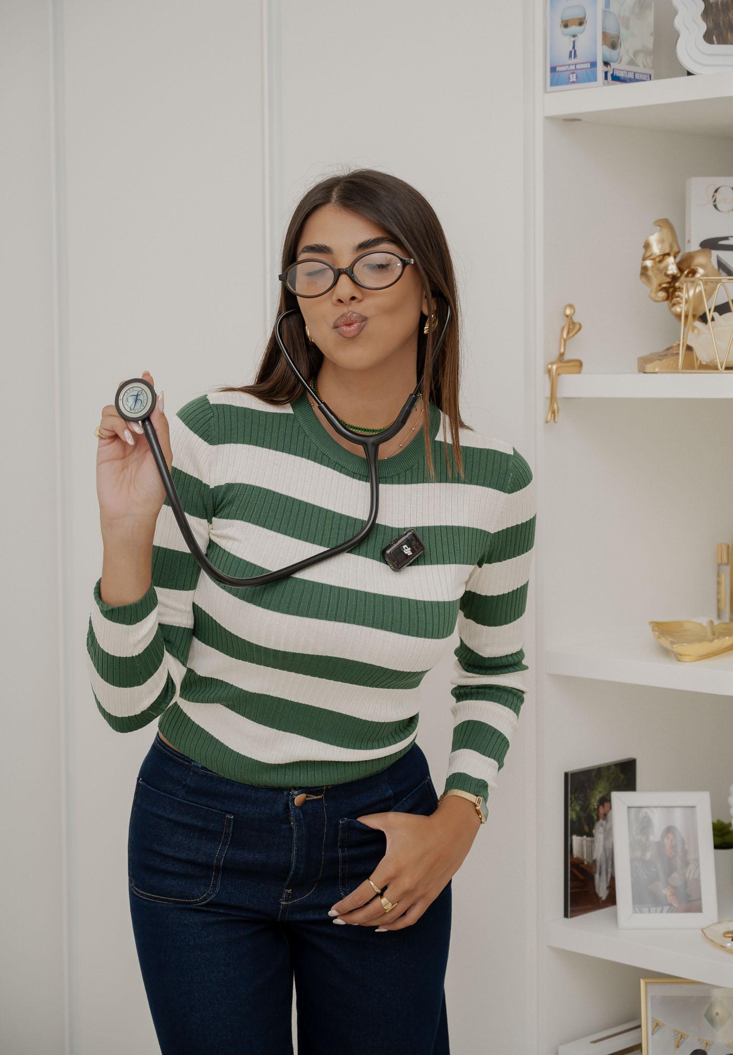JDY Women's Green and Cream Striped Crew Neck Sweater