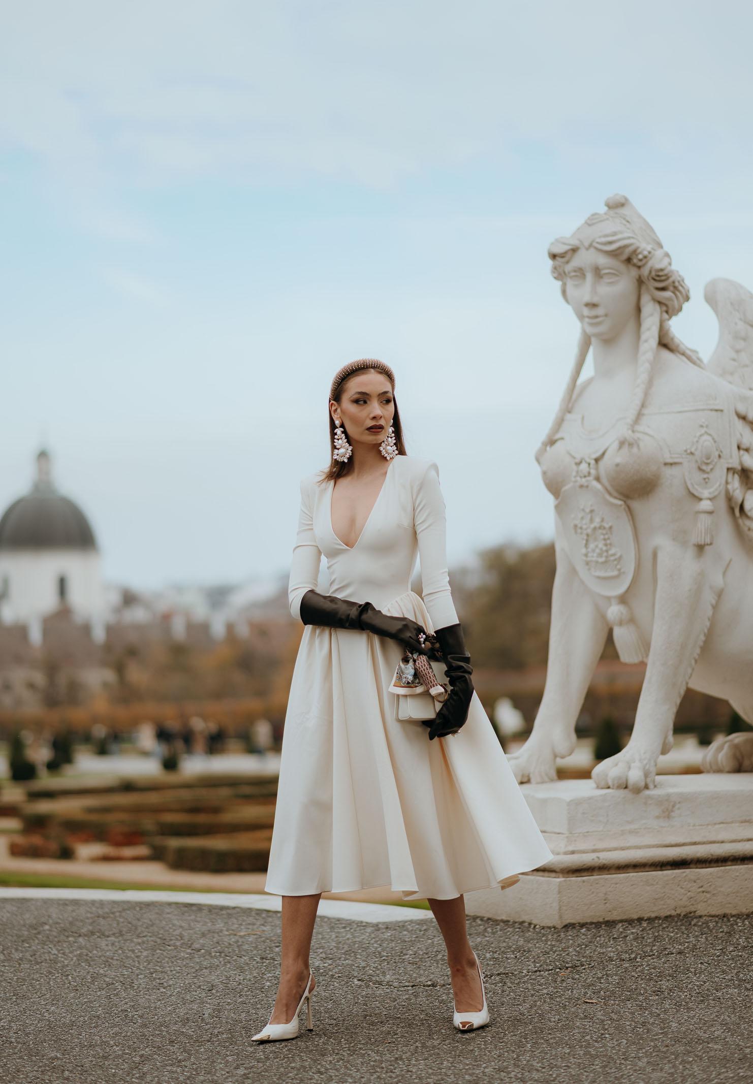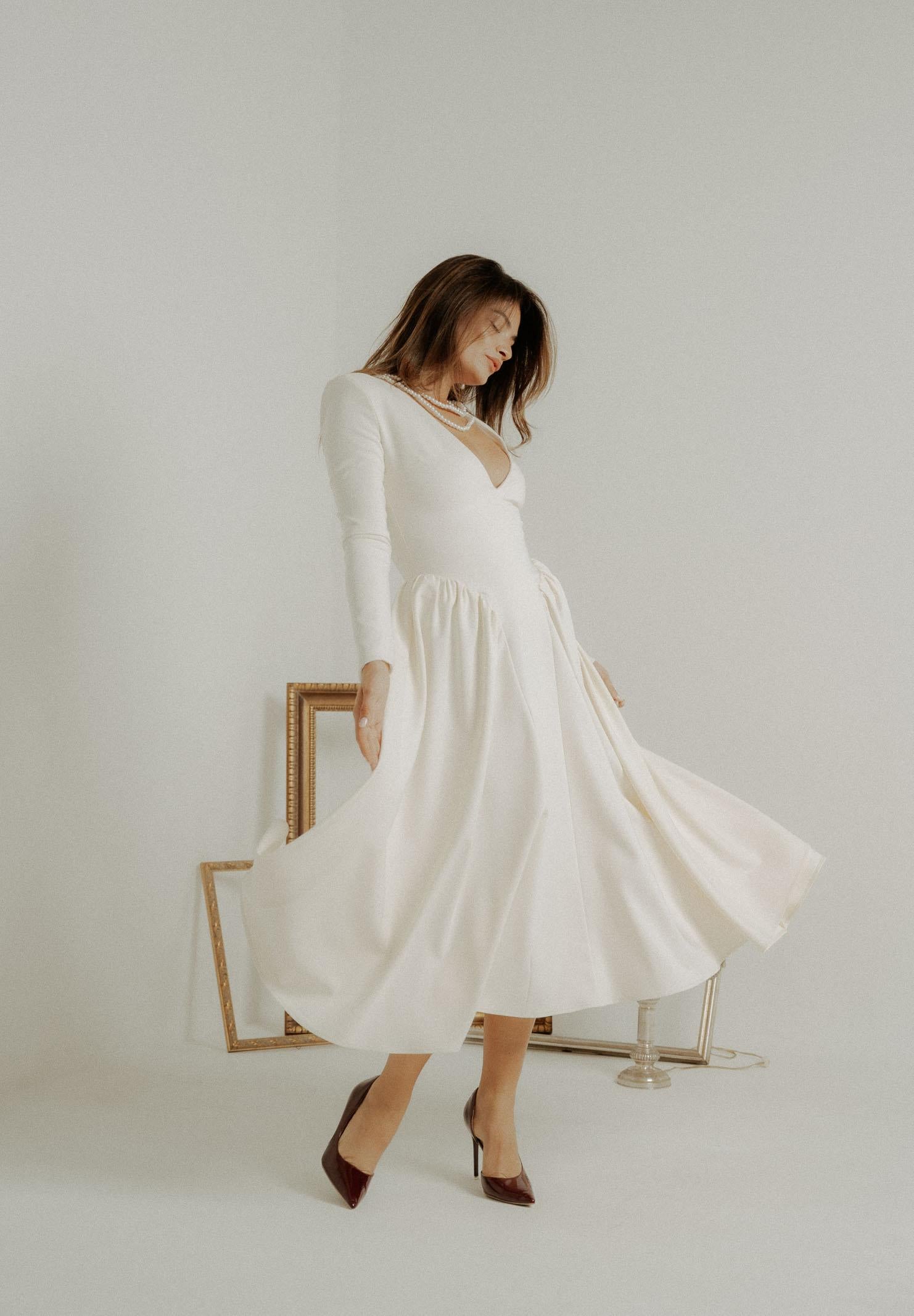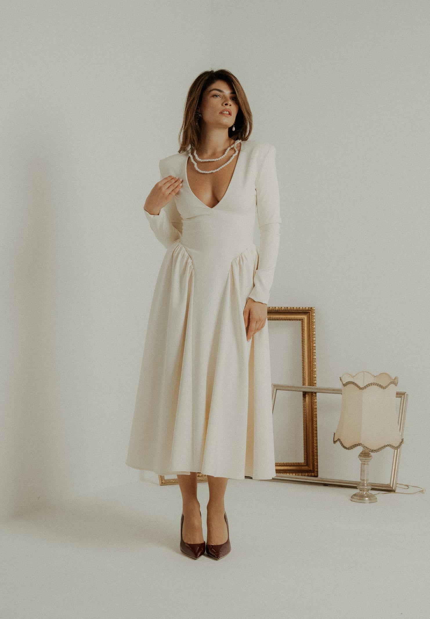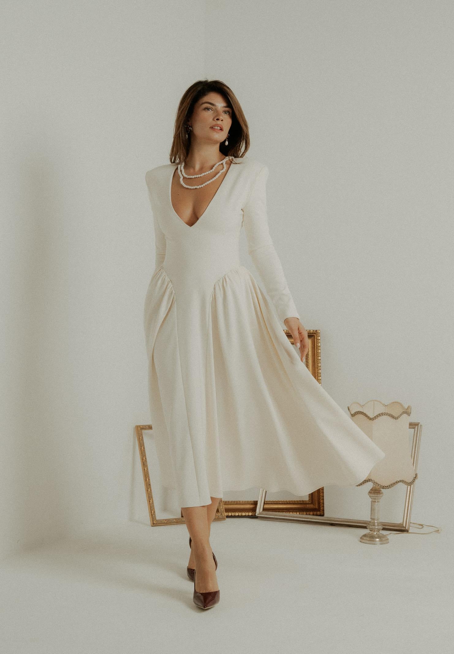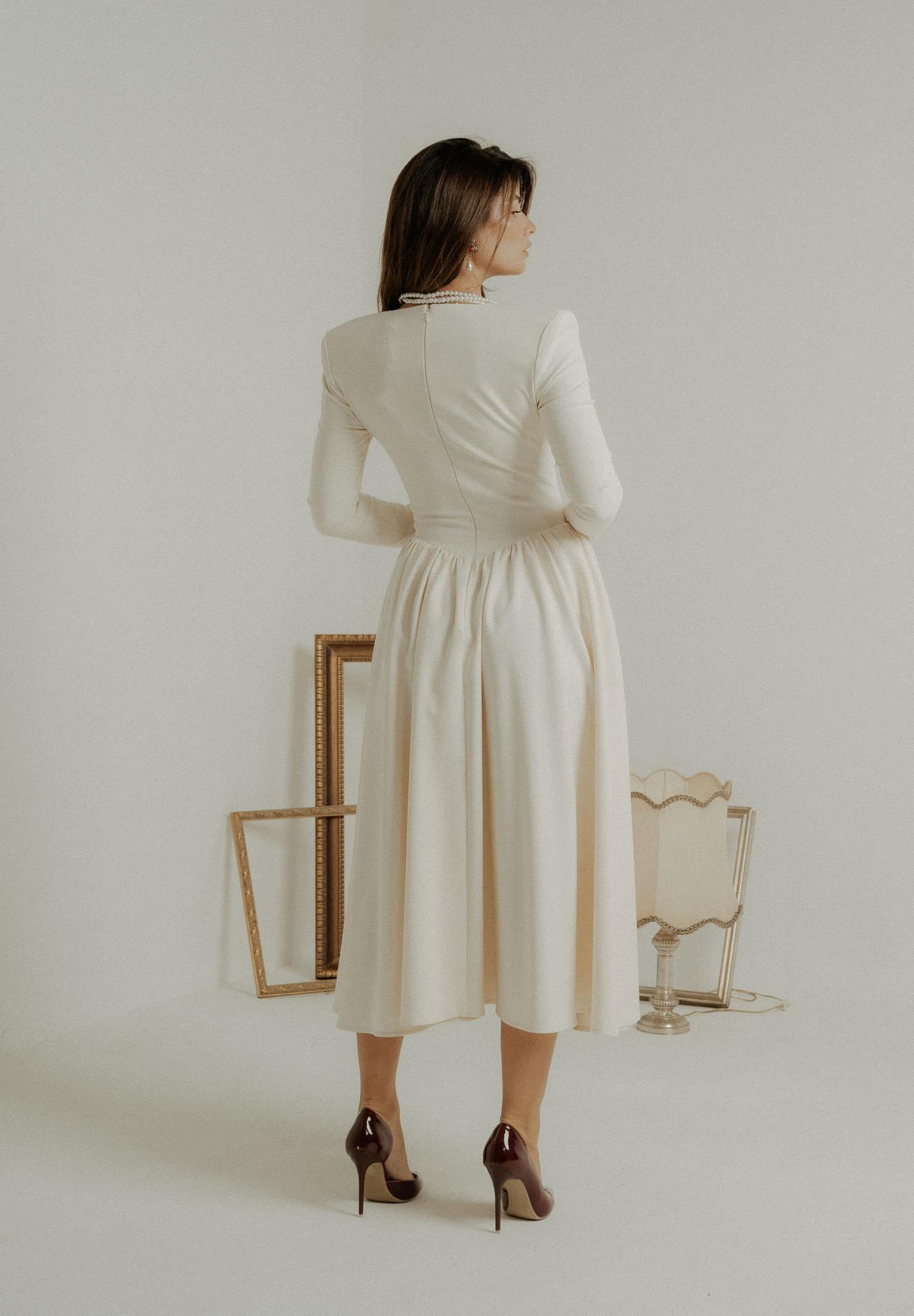 Elegant ivory midi dress for women, regular fit, autumn winter PV2603PA