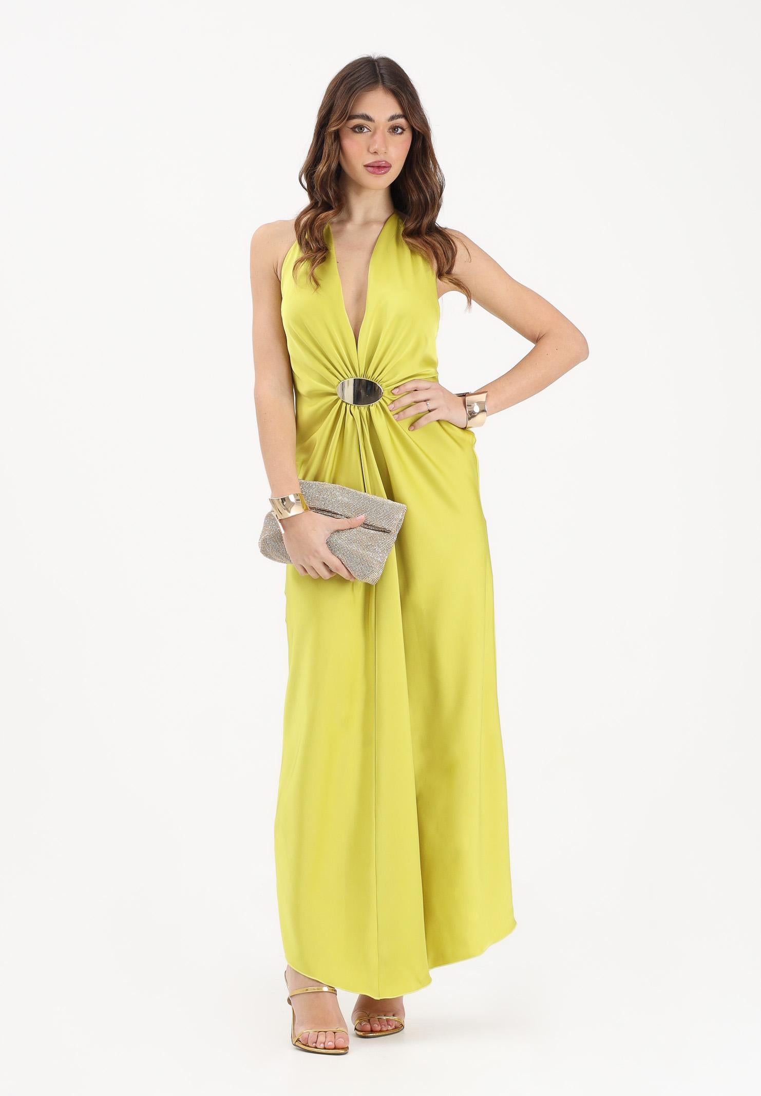 SIMONA CORSELLINI Abito lungo avocado da donna dal design elegante e scenografico, realizzato in tessuto fluido che illumina la silhouette con un tocco deciso e raffinato. Il modello presenta un profondo scollo a V con arricciatura centrale, impreziosita da un anello metallico dorato che valorizza il punto vita e crea un elegante drappeggio frontale. La linea scivolata e femminile accompagna le forme fino al fondo, mentre la schiena scoperta con allacciatura al collo e zip centrale dona sensualità ed equilibrio al capo. Completano l'abito i bracciali rigidi coordinati, inclusi nel prezzo, che aggiungono un tocco glamour e rendono l'outfit completo e d'impatto senza bisogno di ulteriori accessori. Perfetto per cerimonie, eventi serali o occasioni speciali, è un abito pensato per chi ama distinguersi con stile e personalità. La modella indossa una taglia 40 ed è alta 170cm. Si consiglia un lavaggio ed una stiratura a media temperatura. Stagione primavera estate.